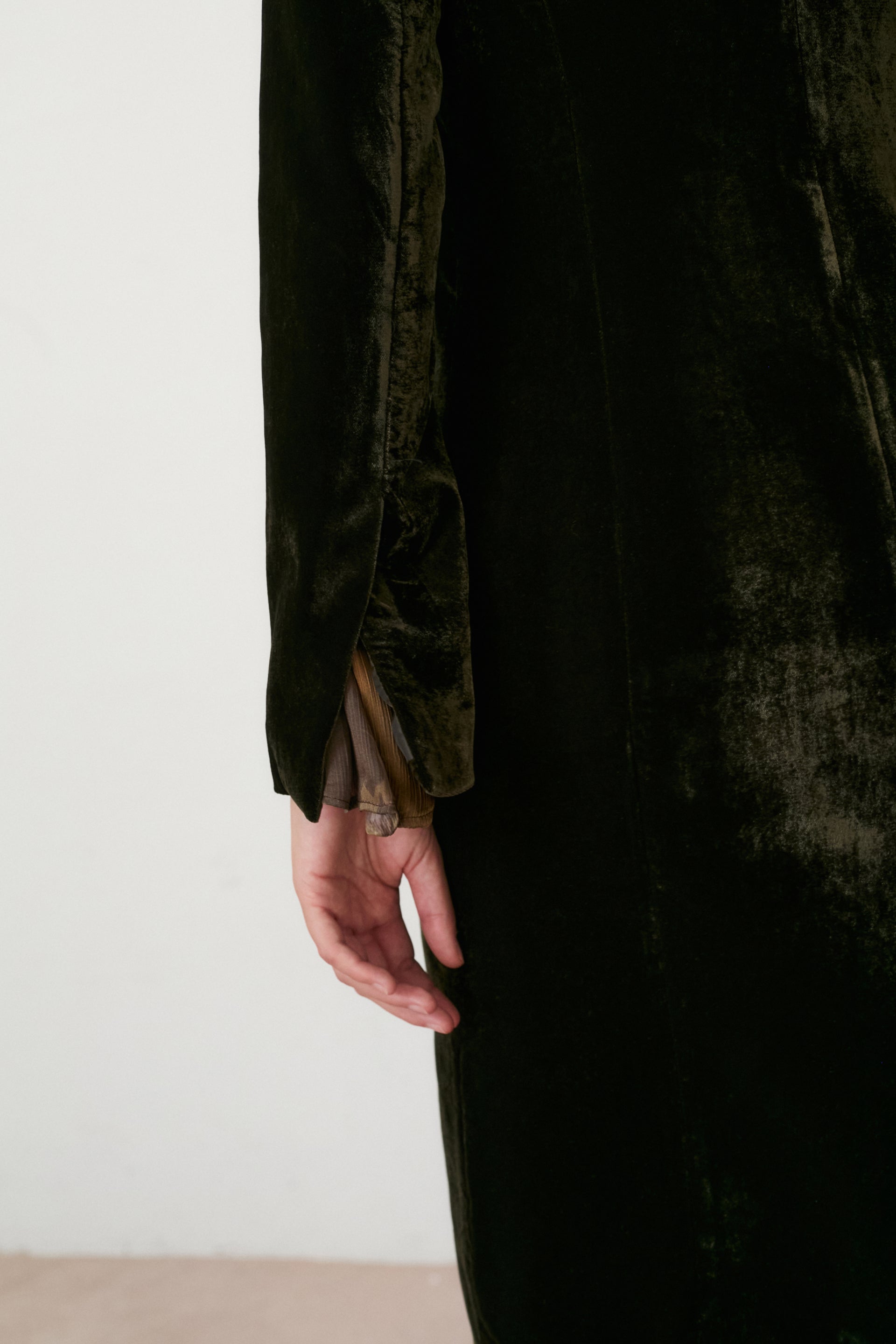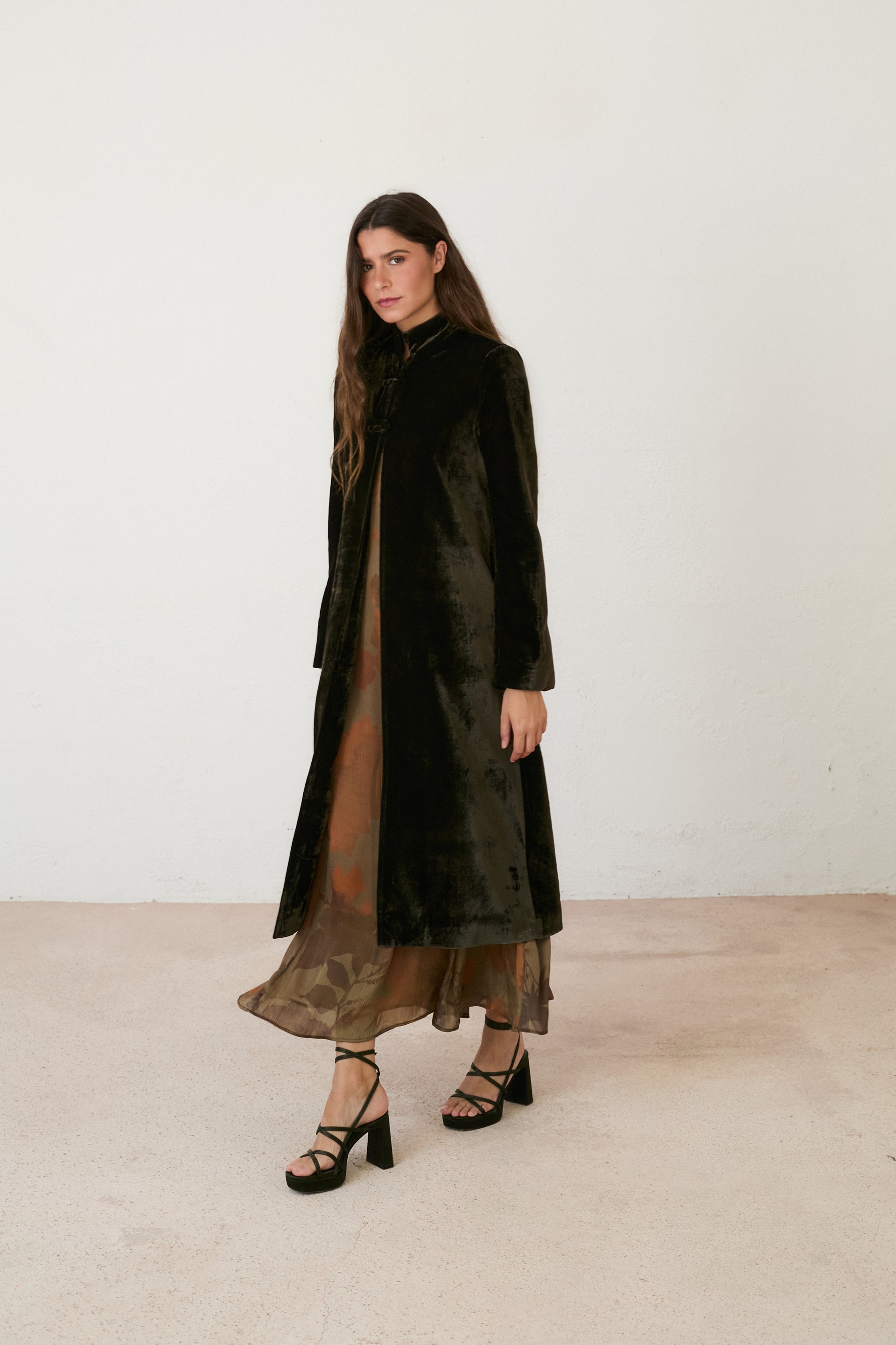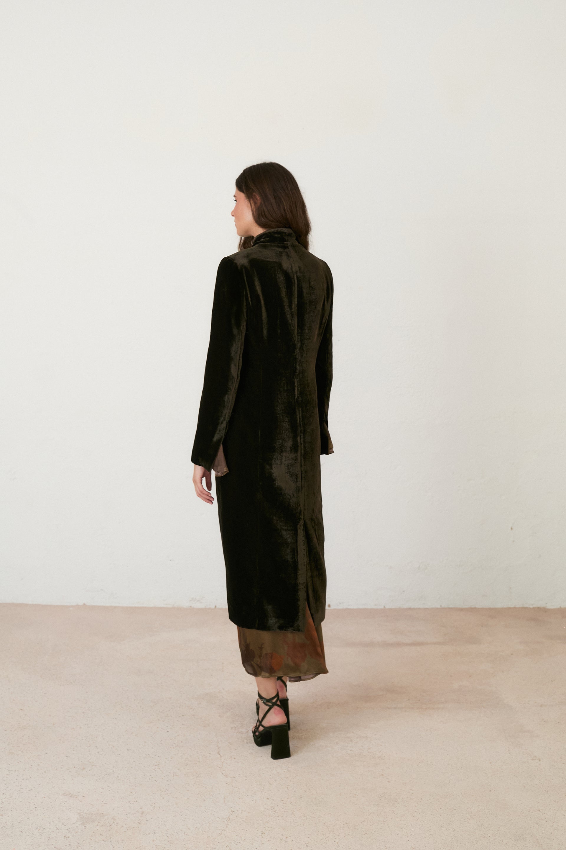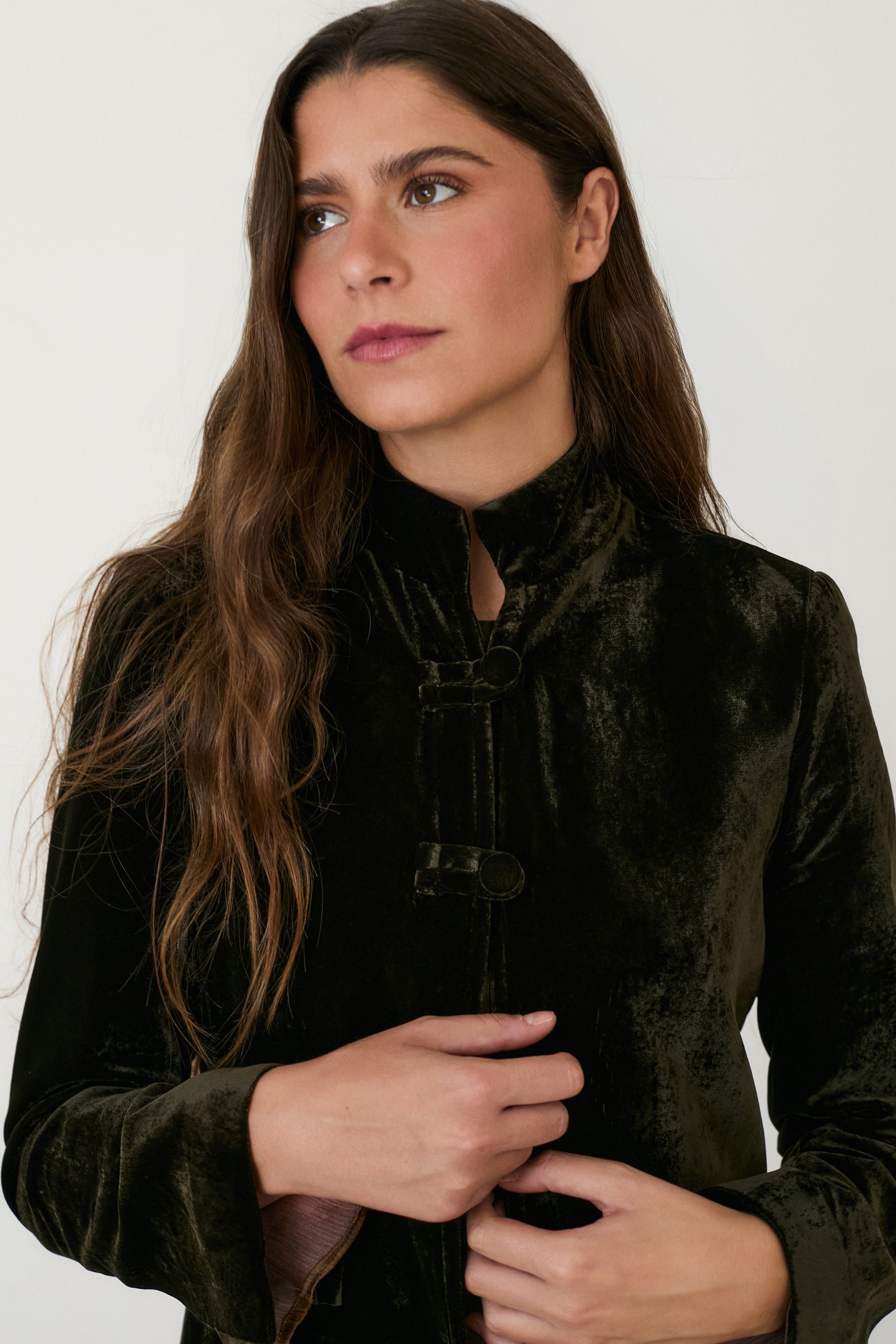 Abrigo armado tres cuartos con hombreras en terciopelo kaki. Cuello mao y botones entelados. Detalle de ajuste en cintura y apertura trasera.