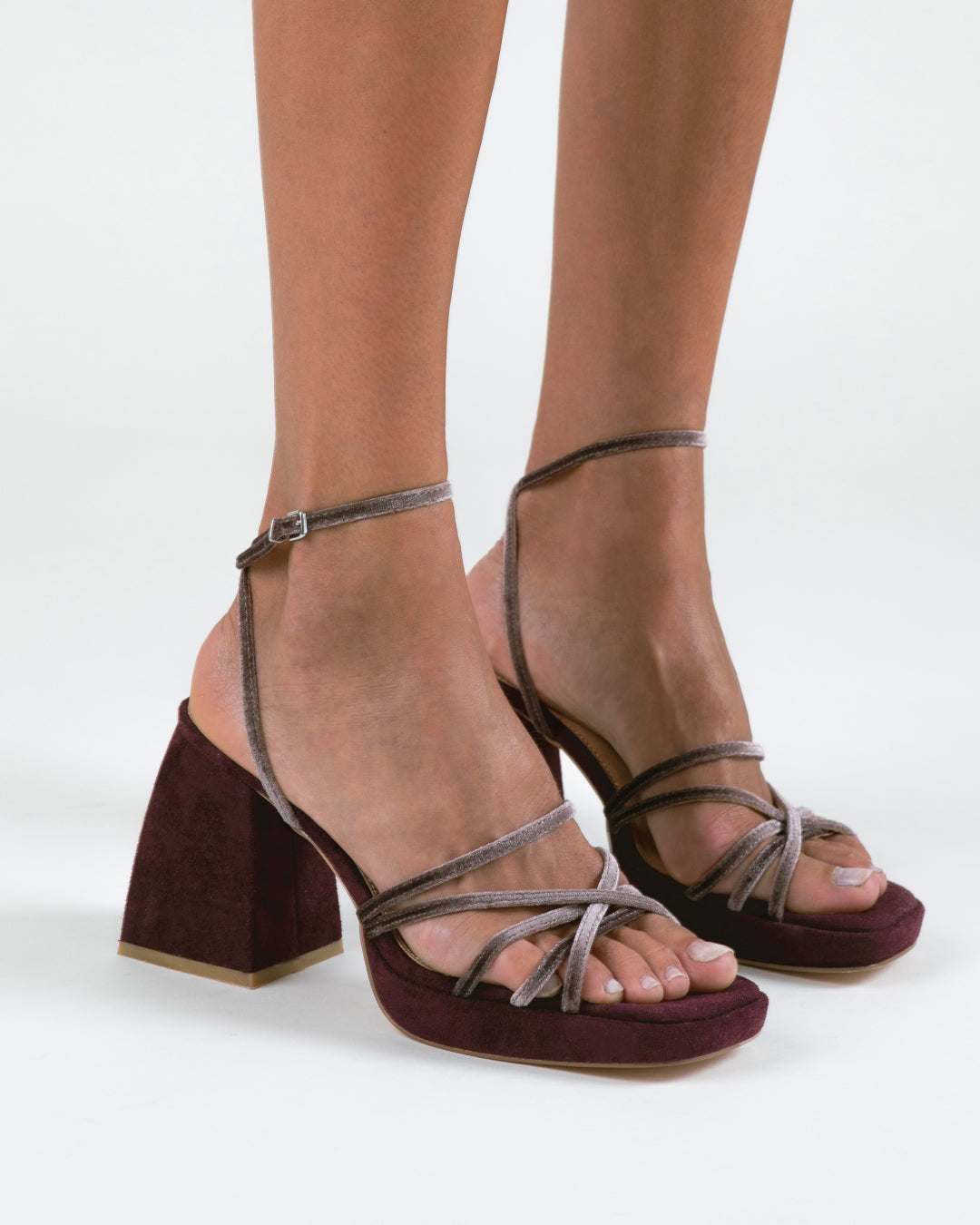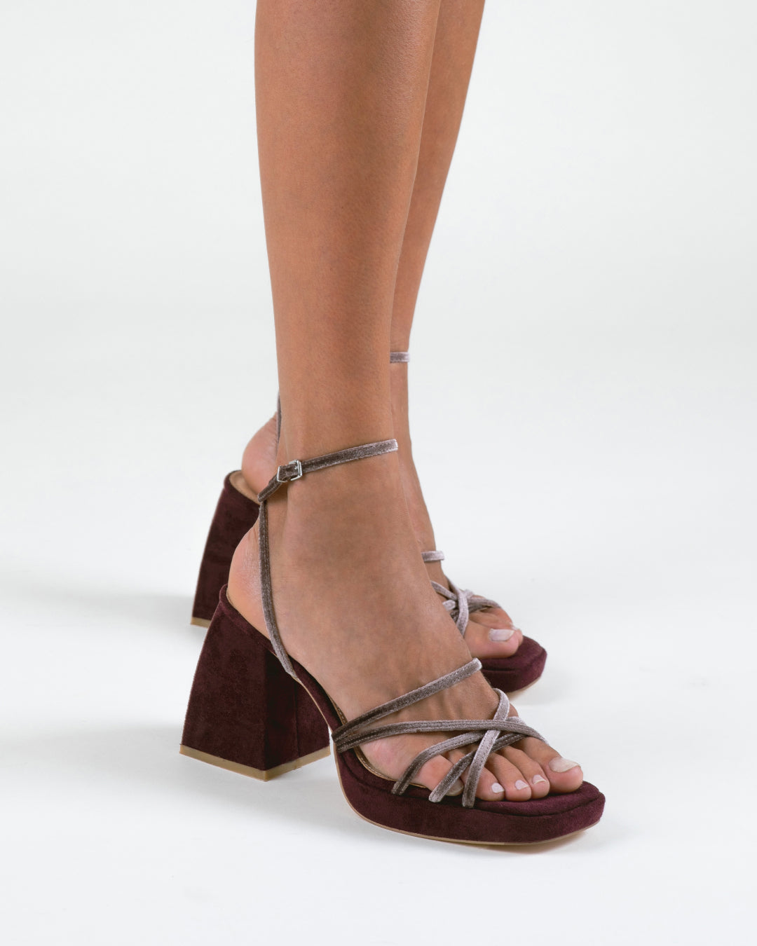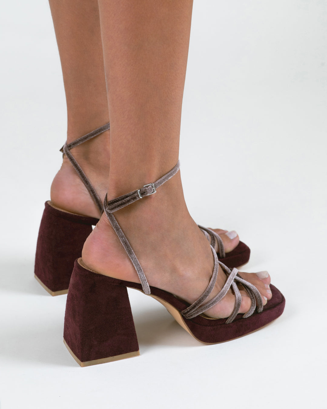 Sandale à talon en daim végétalien dans les tons bordeaux avec plusieurs brides fines à l'avant et des brides de cheville à l'arrière avec fermeture à boucle.