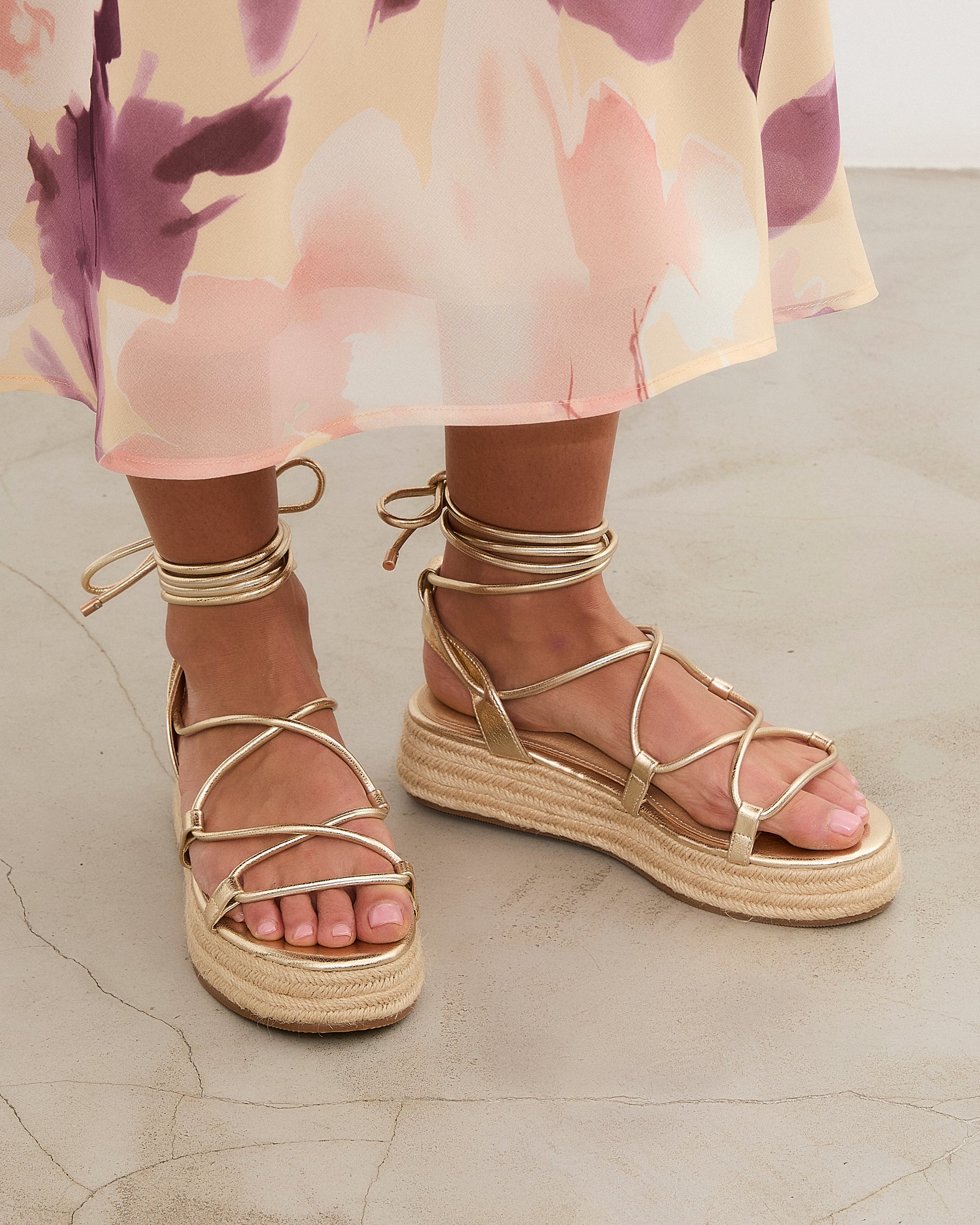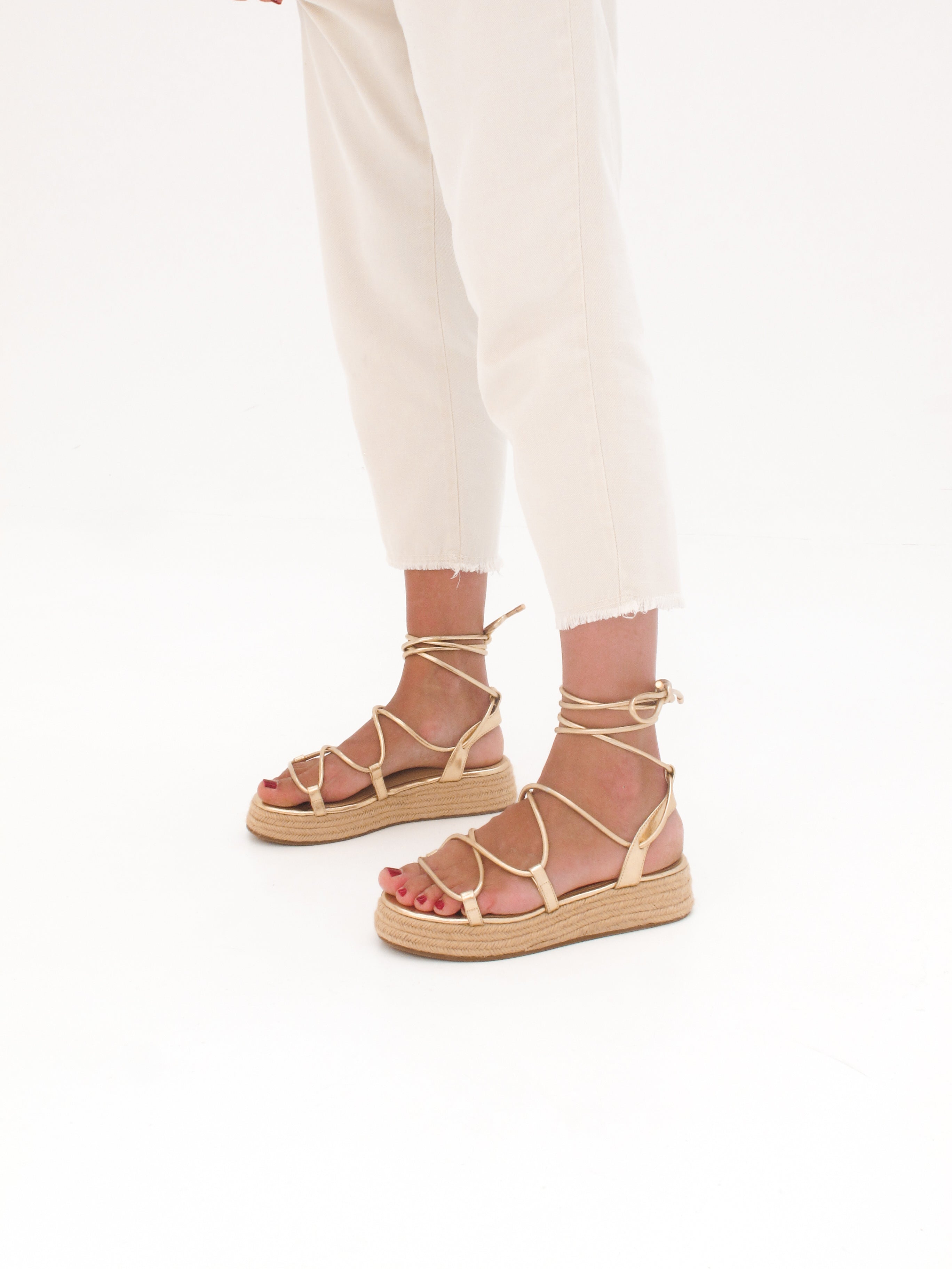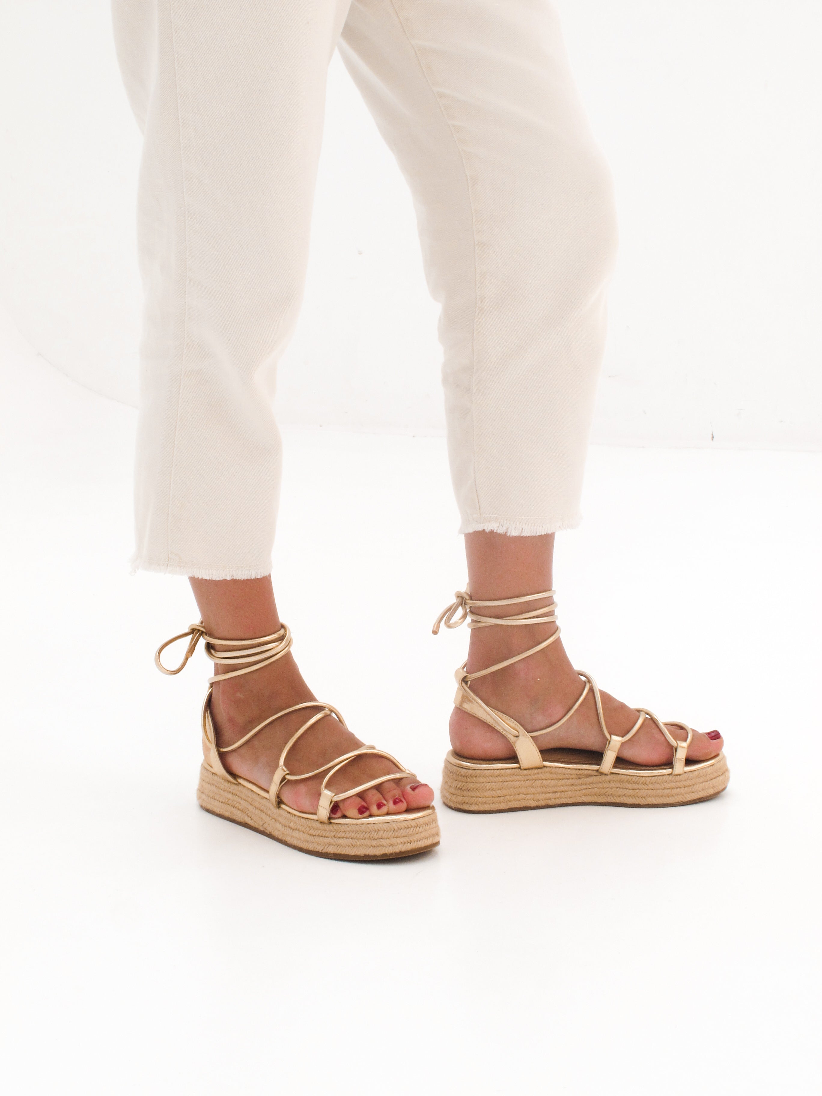Sandalia esparto con plataforma en color dorado. Compuesto por varias tiras tubulares y cierre con tiras anudadas al tobillo.
