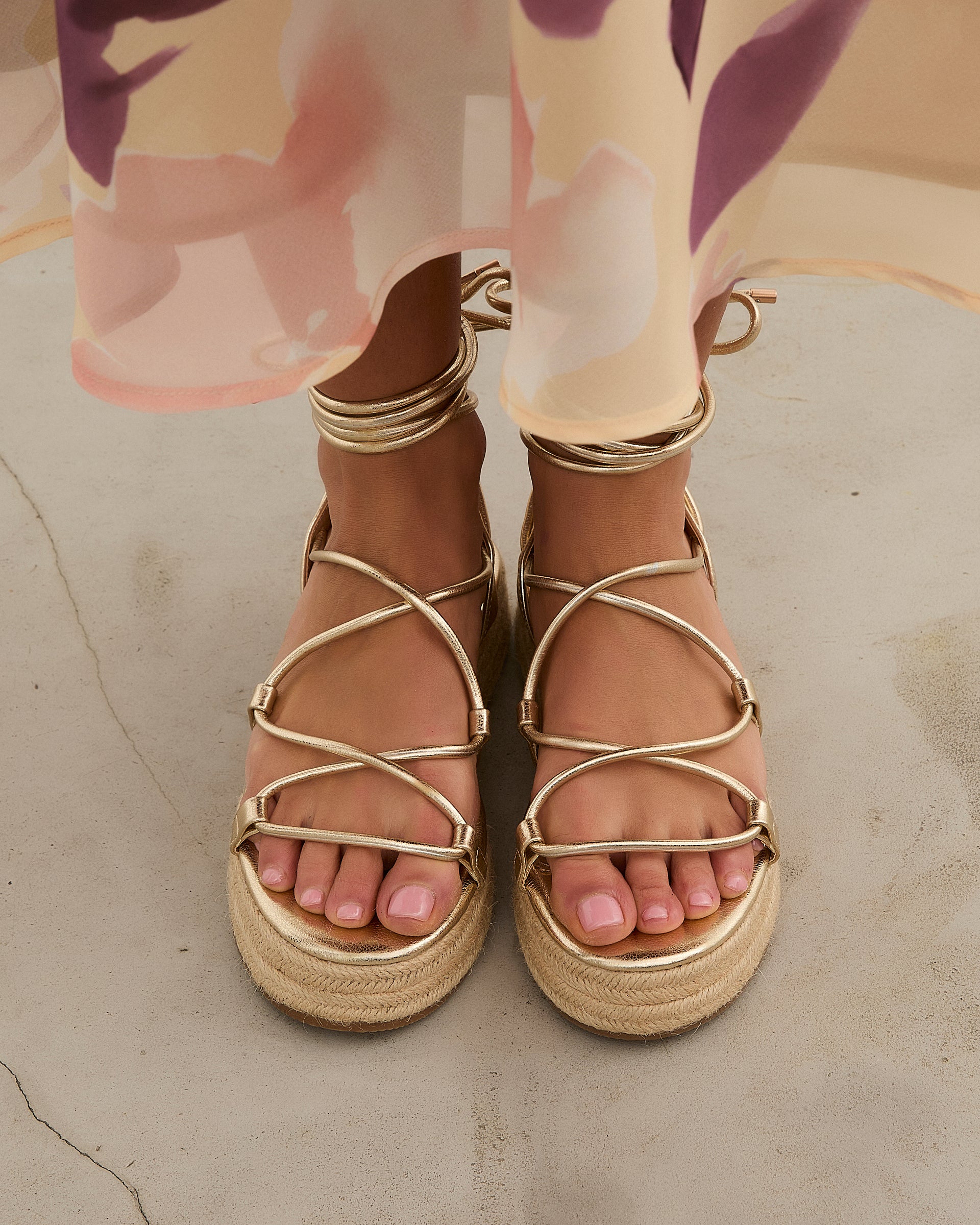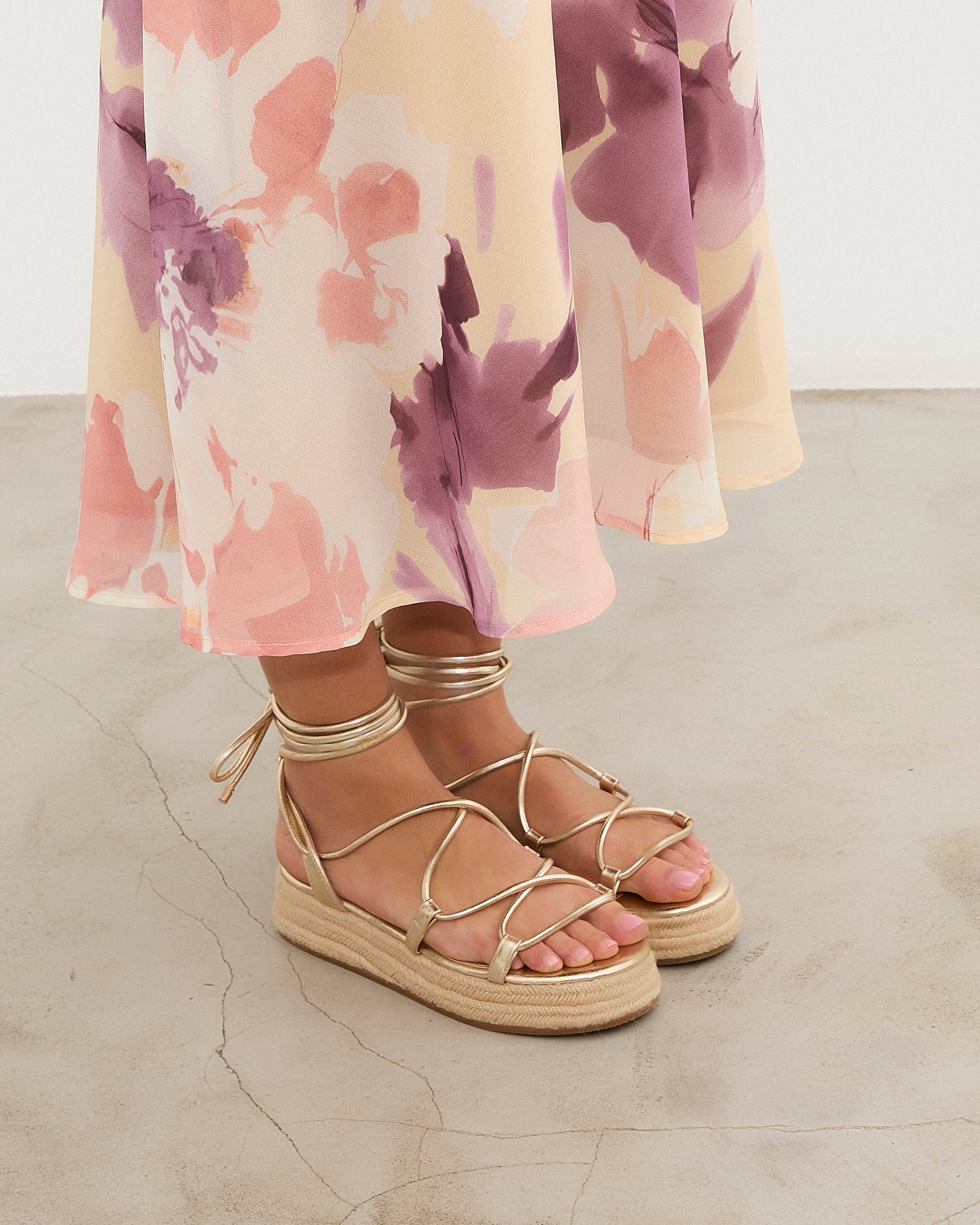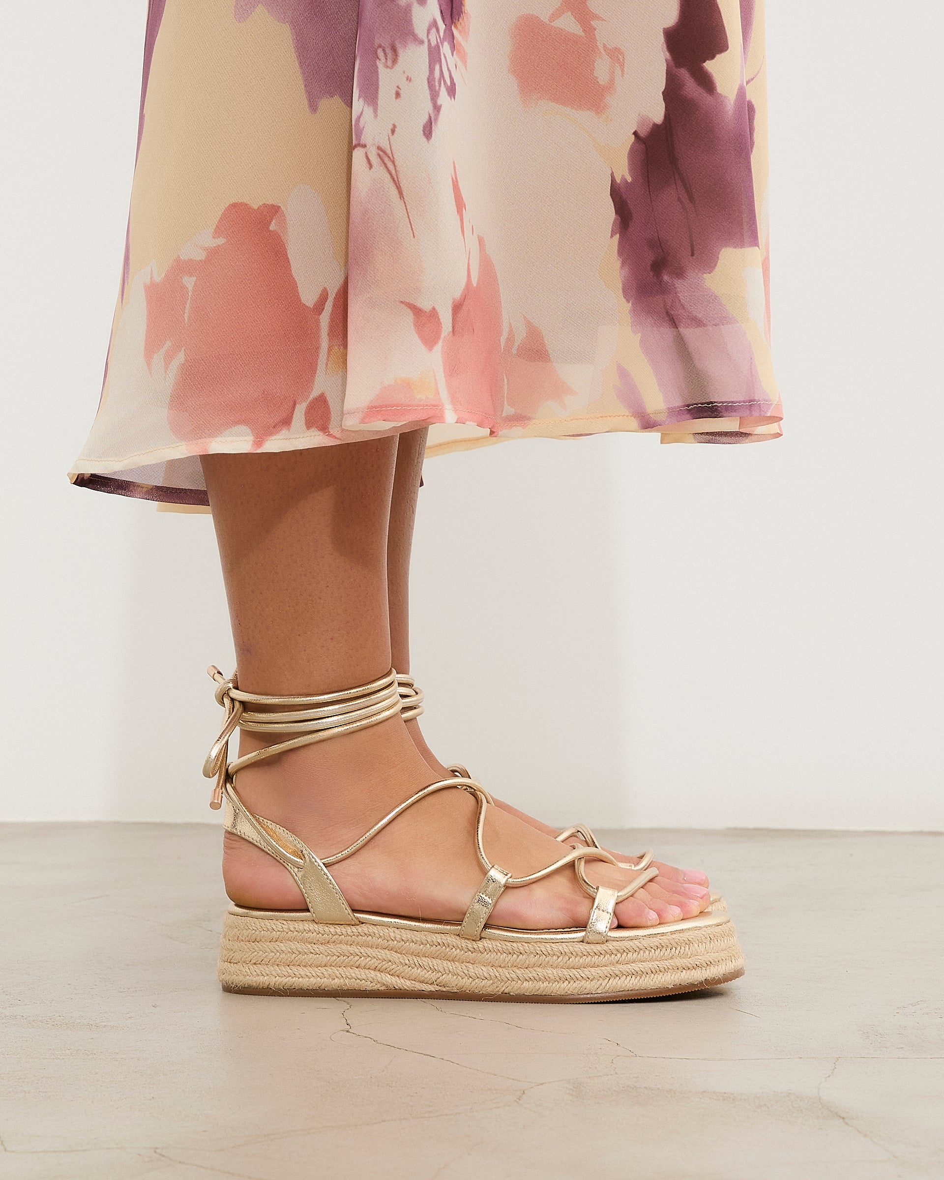 Sandalia esparto con plataforma en color dorado. Compuesto por varias tiras tubulares y cierre con tiras anudadas al tobillo.