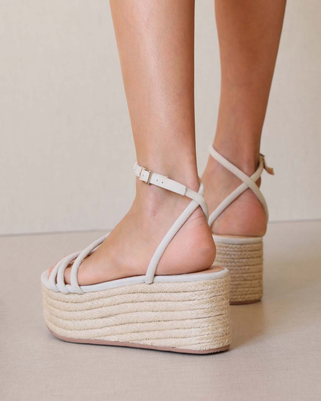 Sandale plateforme en sparte avec brides en daim vegan écru sur la partie supérieure et nouées à la cheville comme un bracelet.