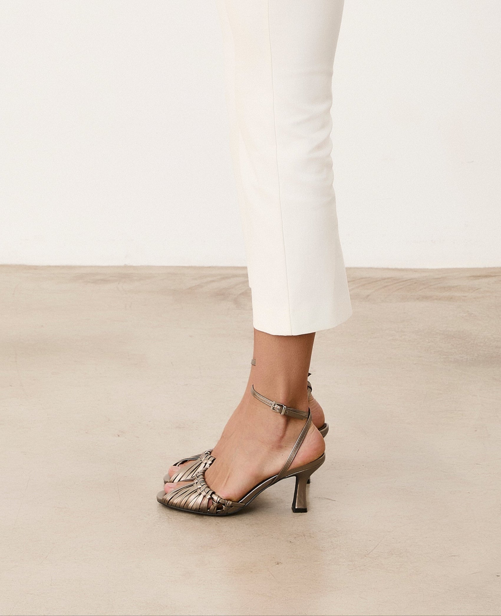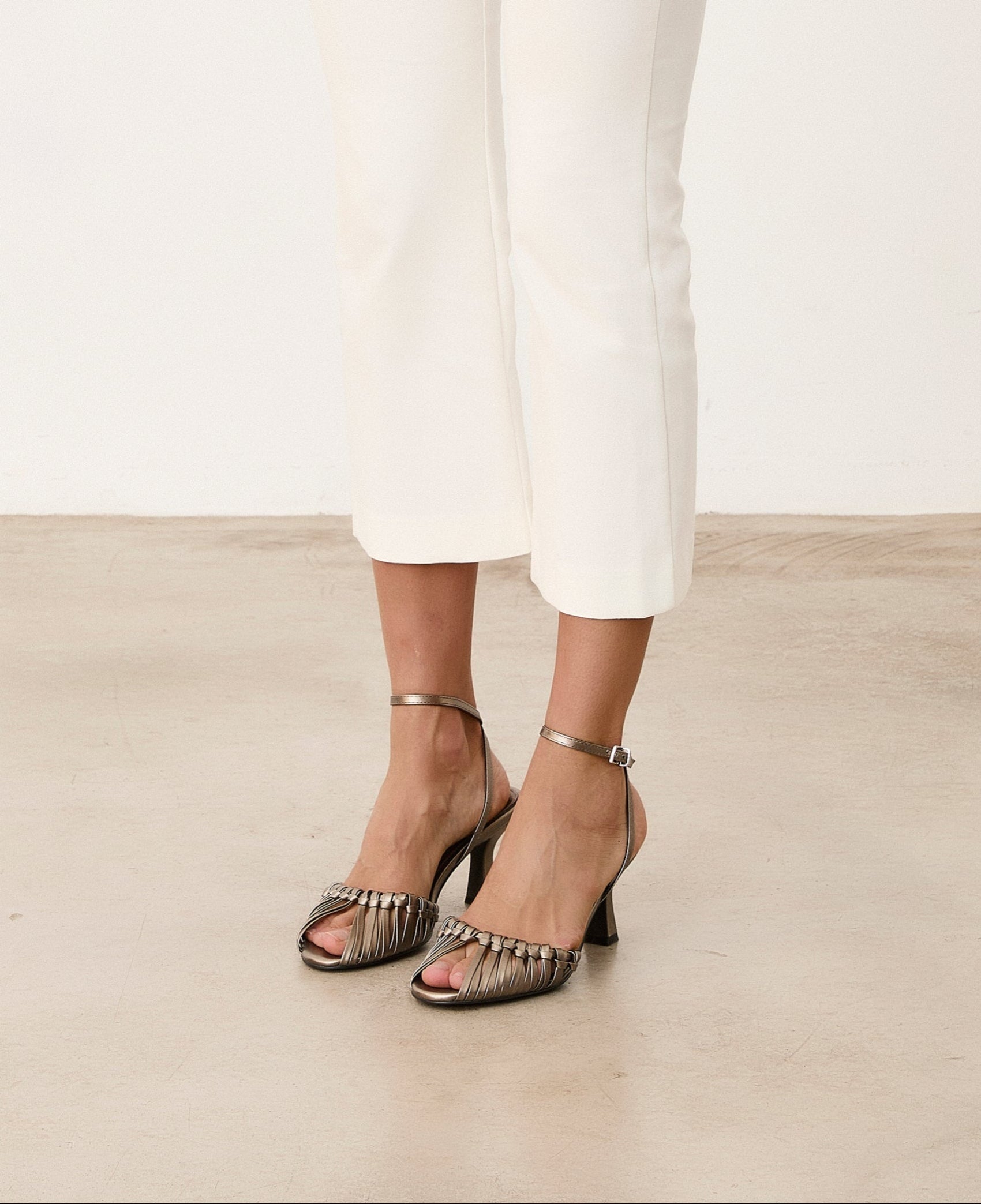 Sandalia de tacón con puntera redondeada en color metalizado. Parte delantera con detalle de nudos. Pulsera al tobillo para sujección. Tacón tipo aguja de base ancha.