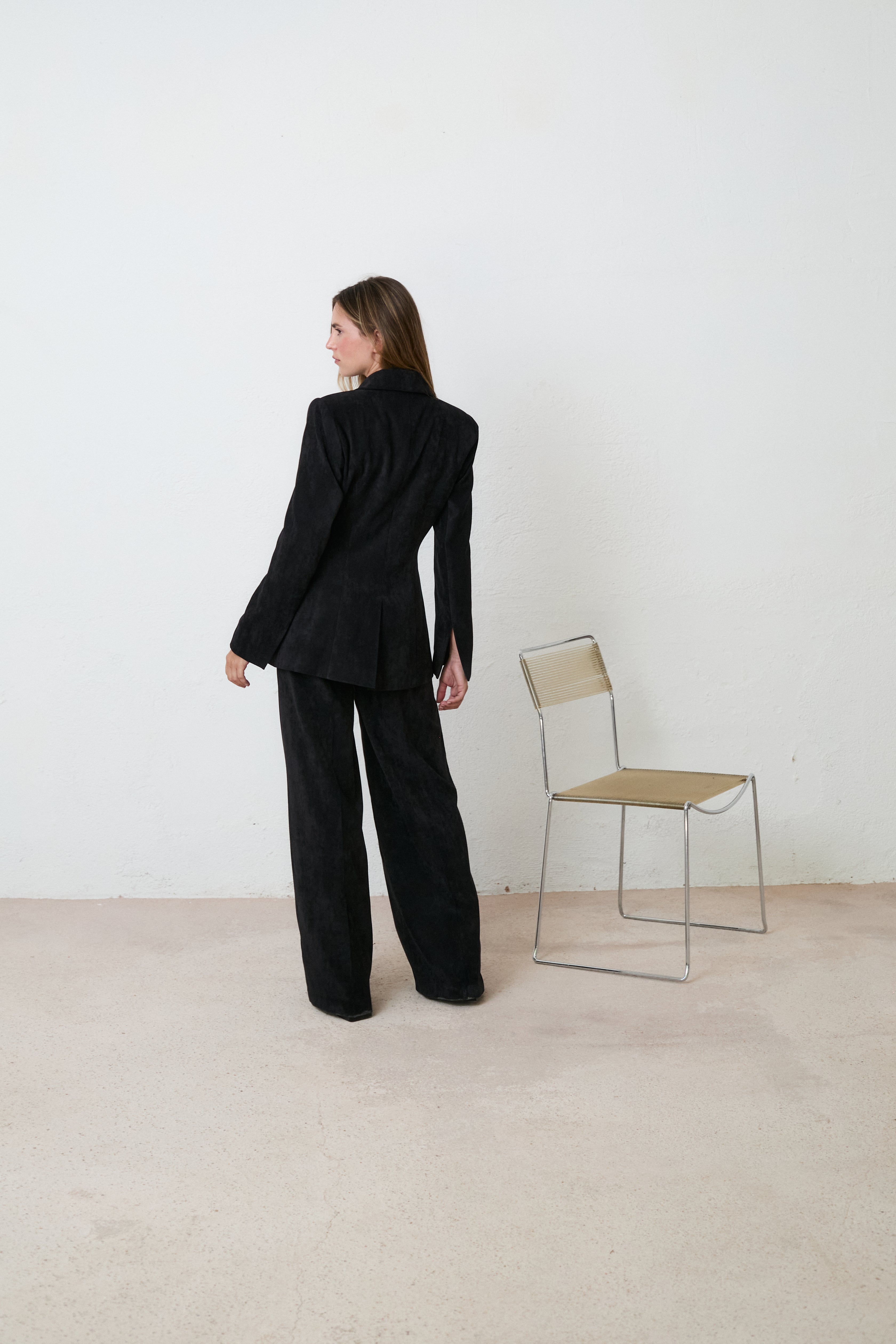 Blazer entallada con hombreras en color negro. Cierre cruzado con botón.