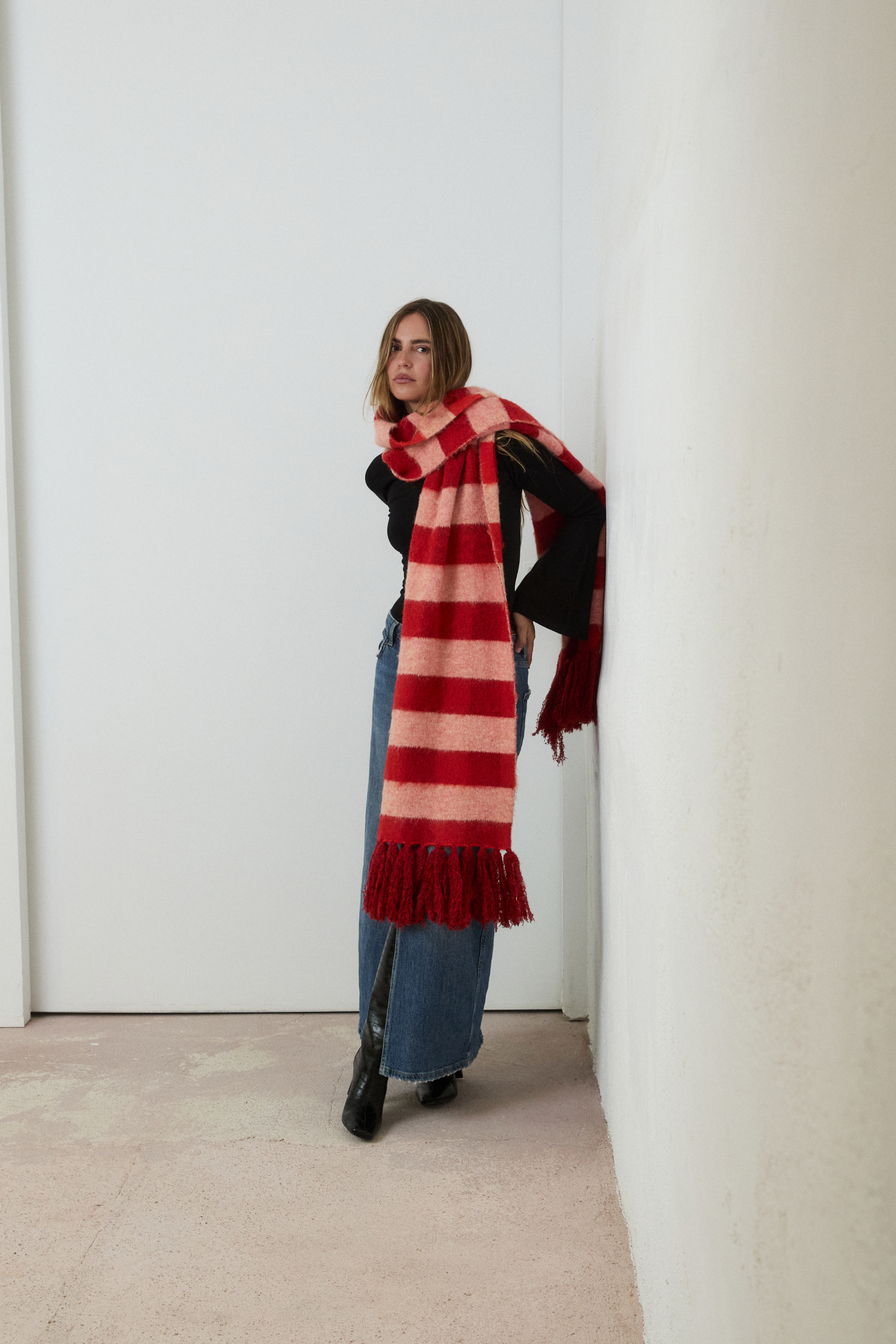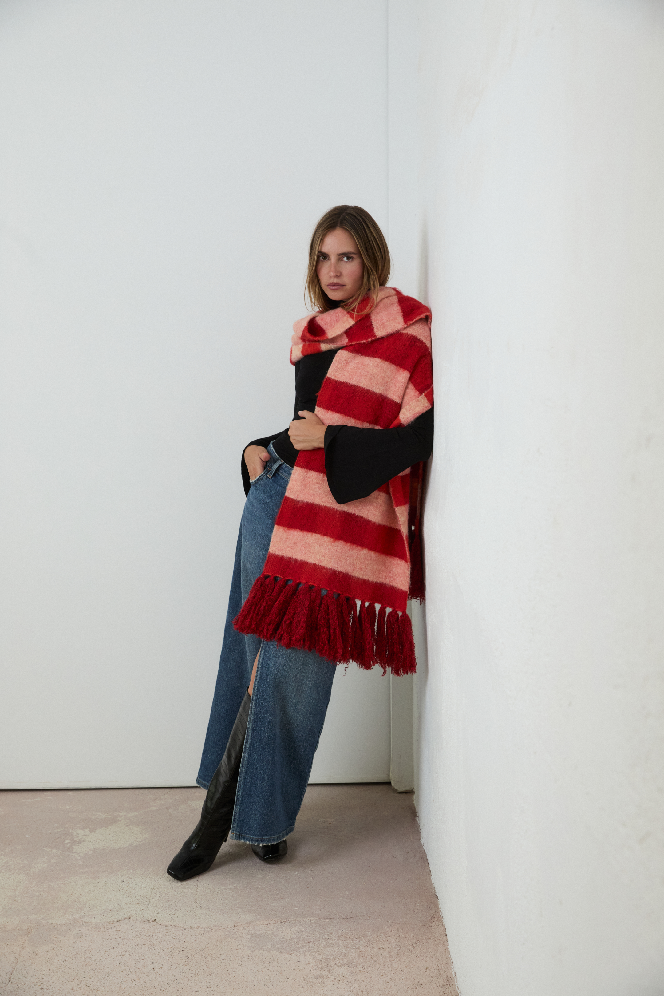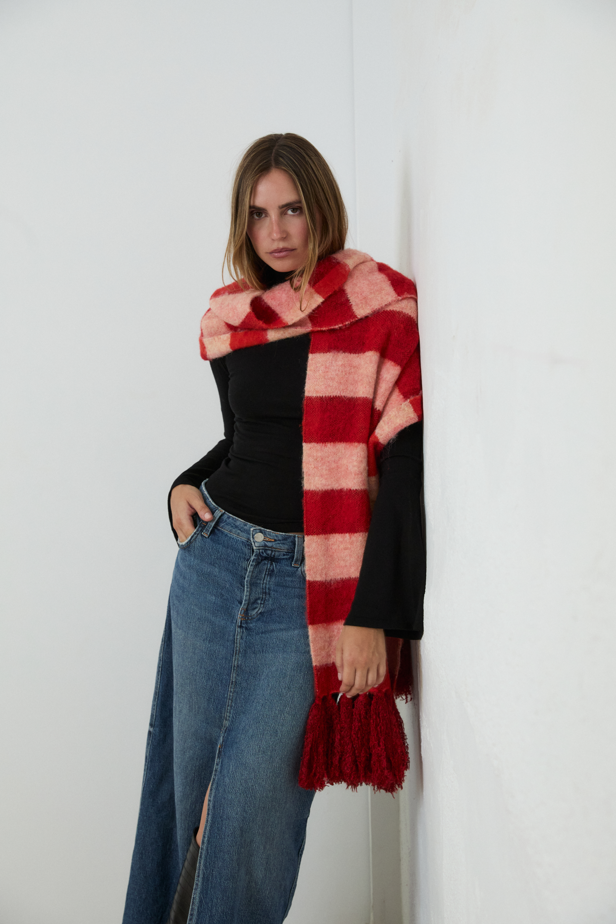 Maxi Bufanda de cuadros en tonos rojos. Detalle de flecos en los extremos.