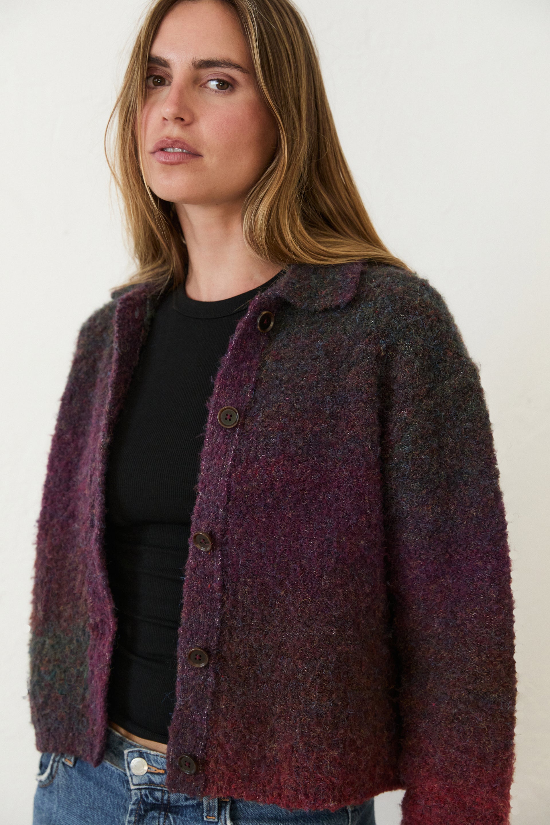 Chaqueta con cuello de punto en degradado en tonos burdeos. Cierre con botones. Cada chaqueta es única debido al colorido desigual del hilo utilizado.