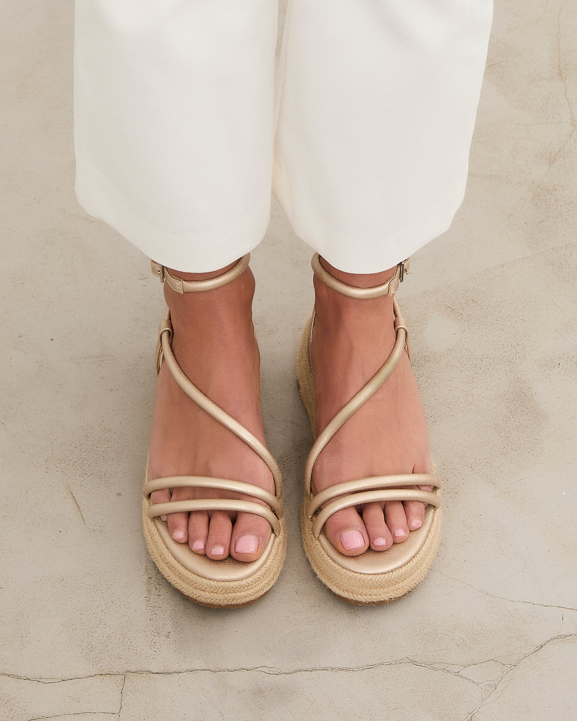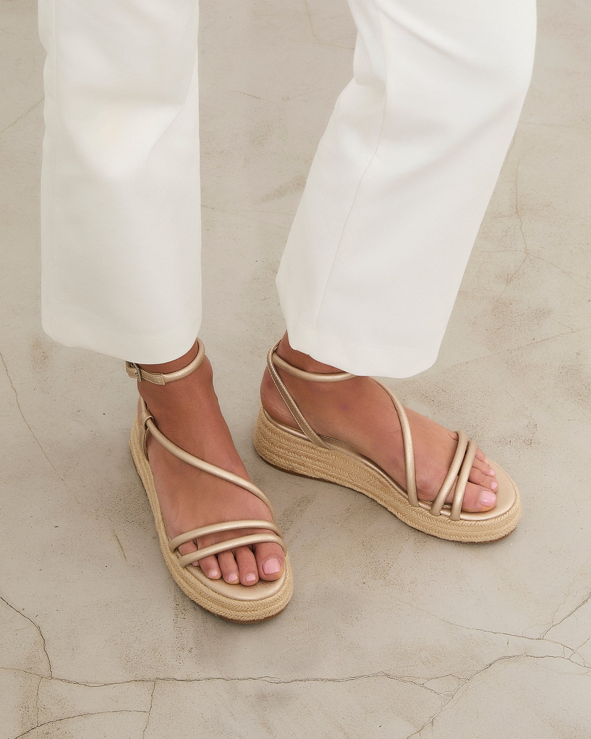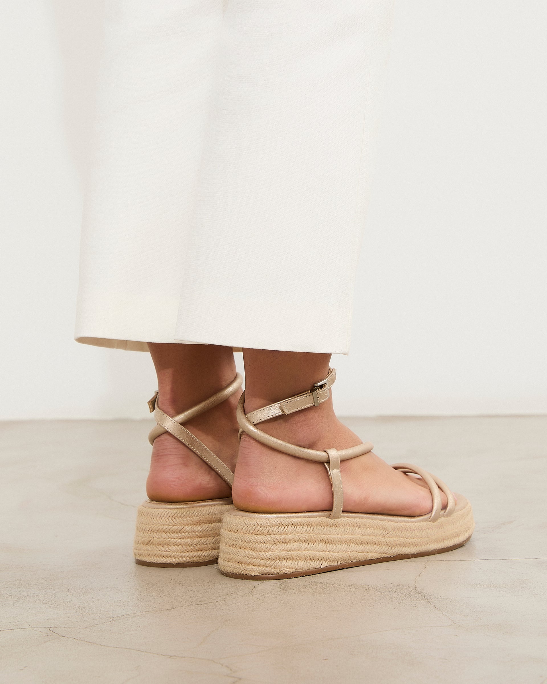 Sandale basse plateforme en alfa. Deux brides sur le devant et une fine bride autour de la cheville en cuir vegan doré. Fermeture à boucle.