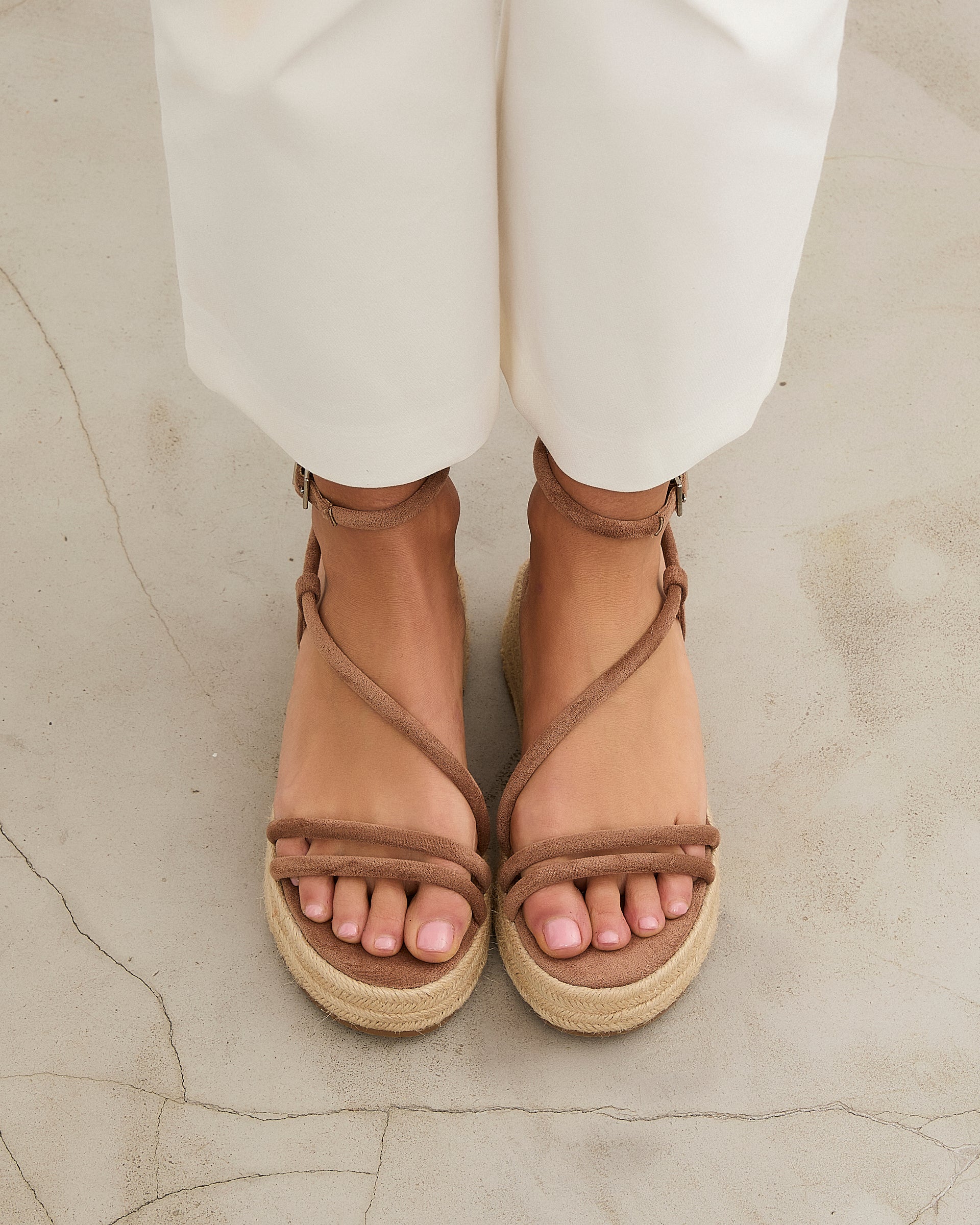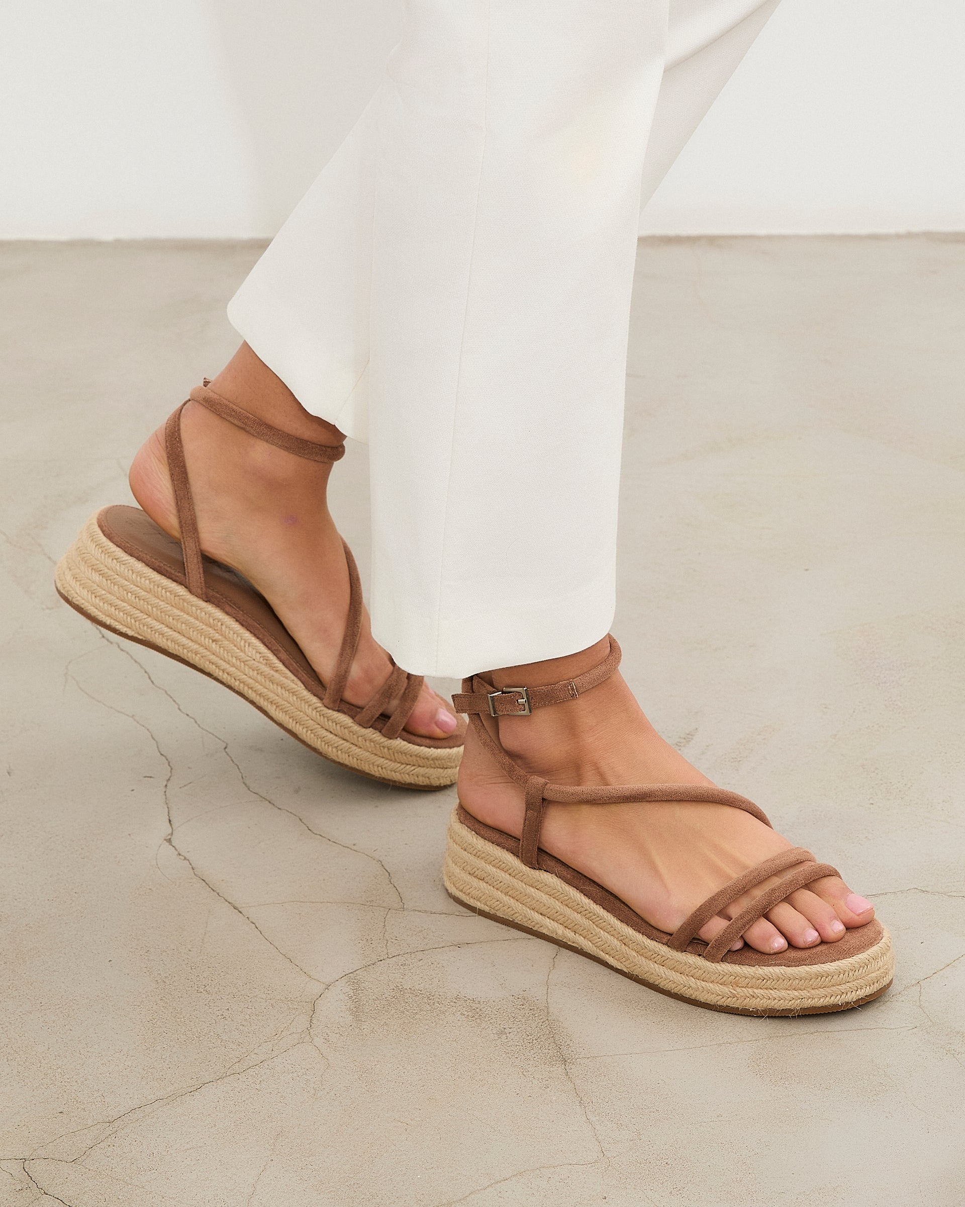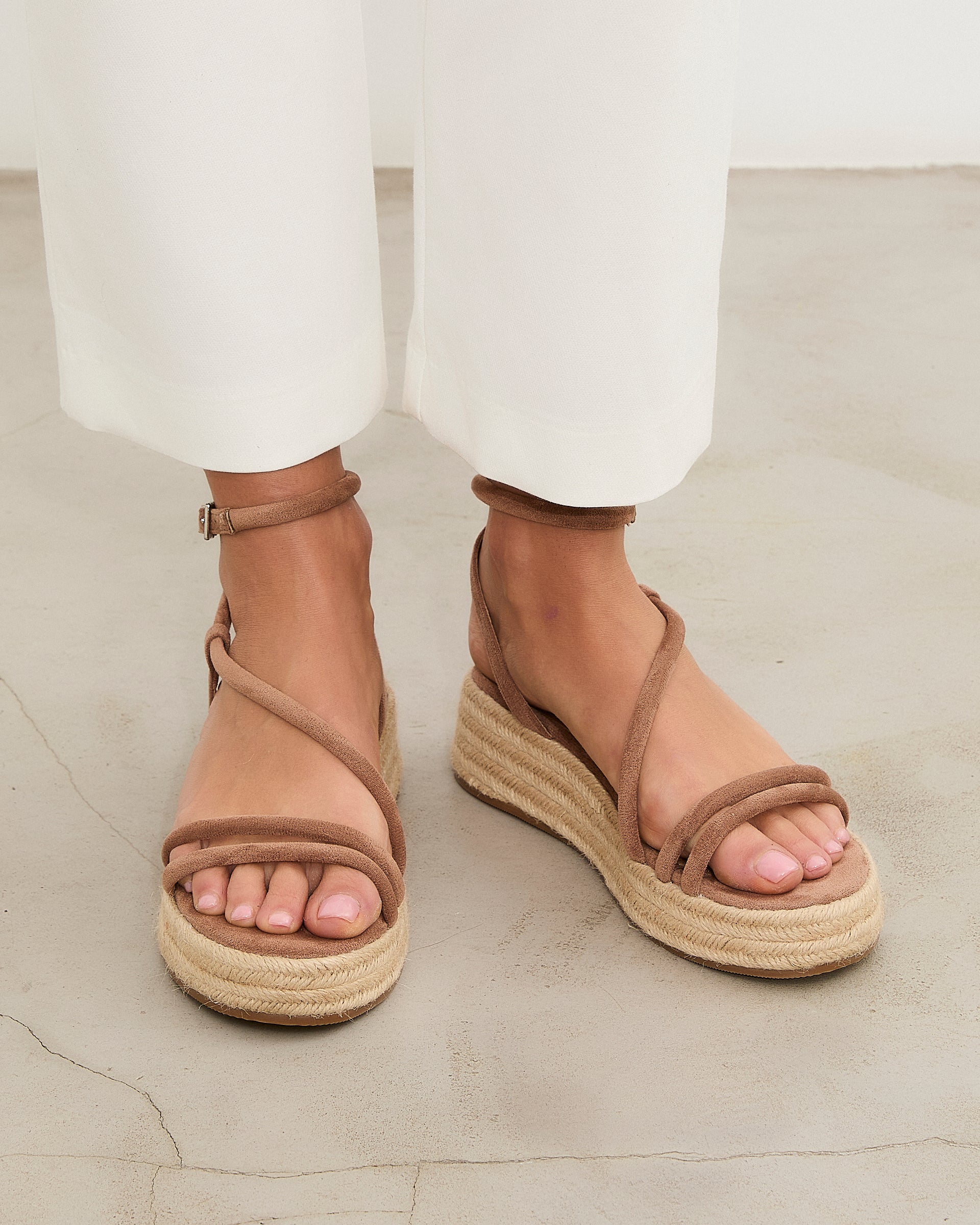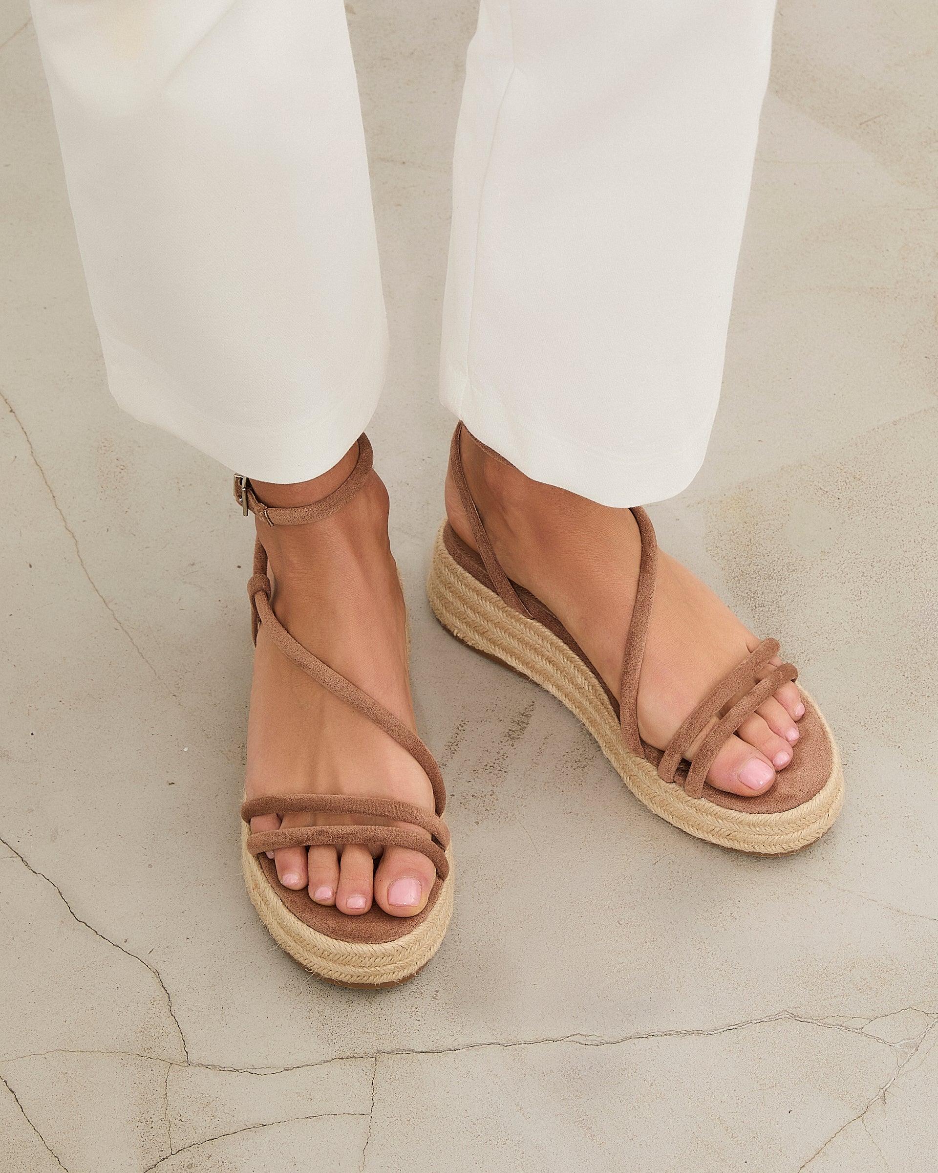 Sandalia de plataforma baja en esparto en color topo. Dos tiras en la parte delantera y tira fina alrededor del tobillo. Cierre con hebilla.