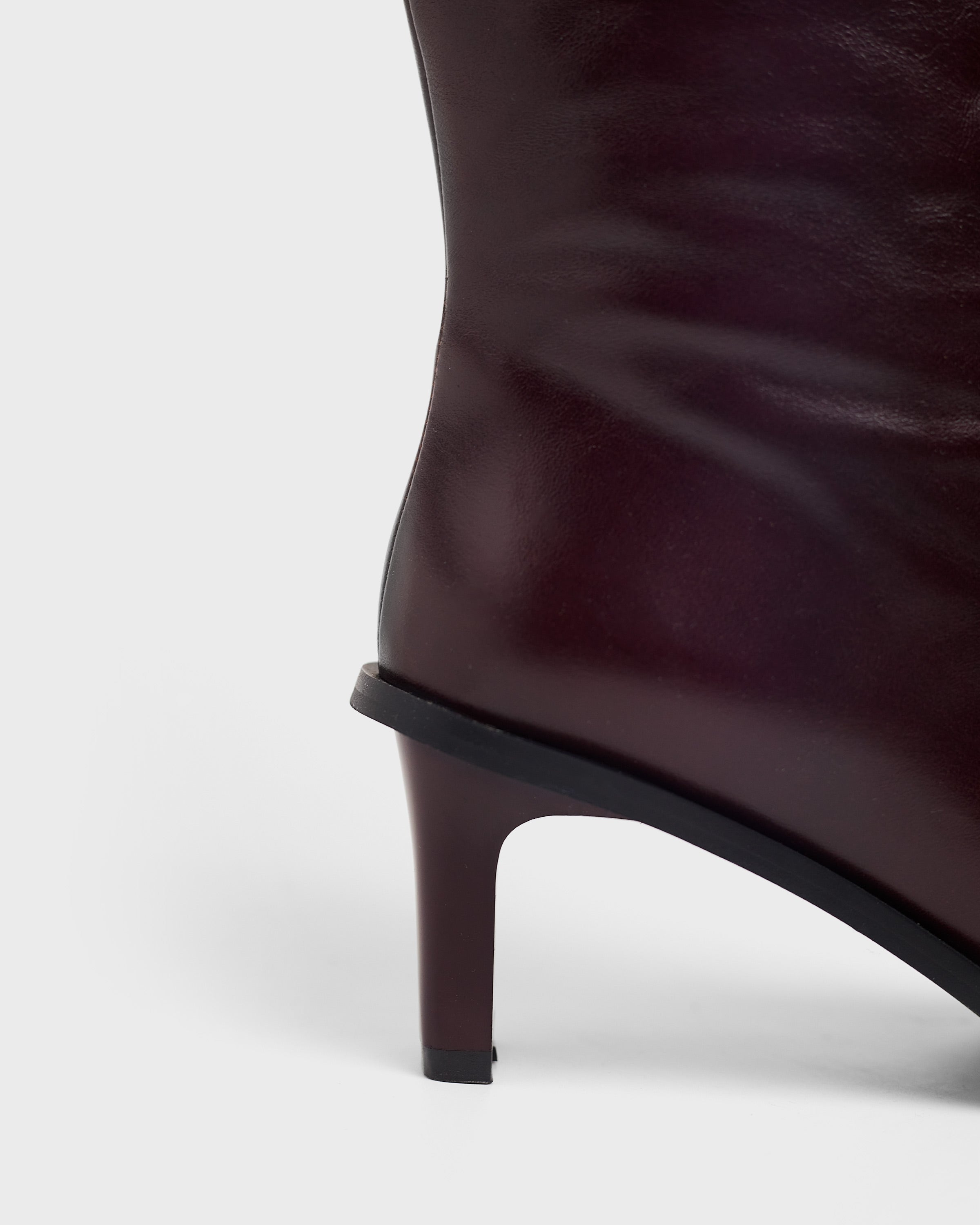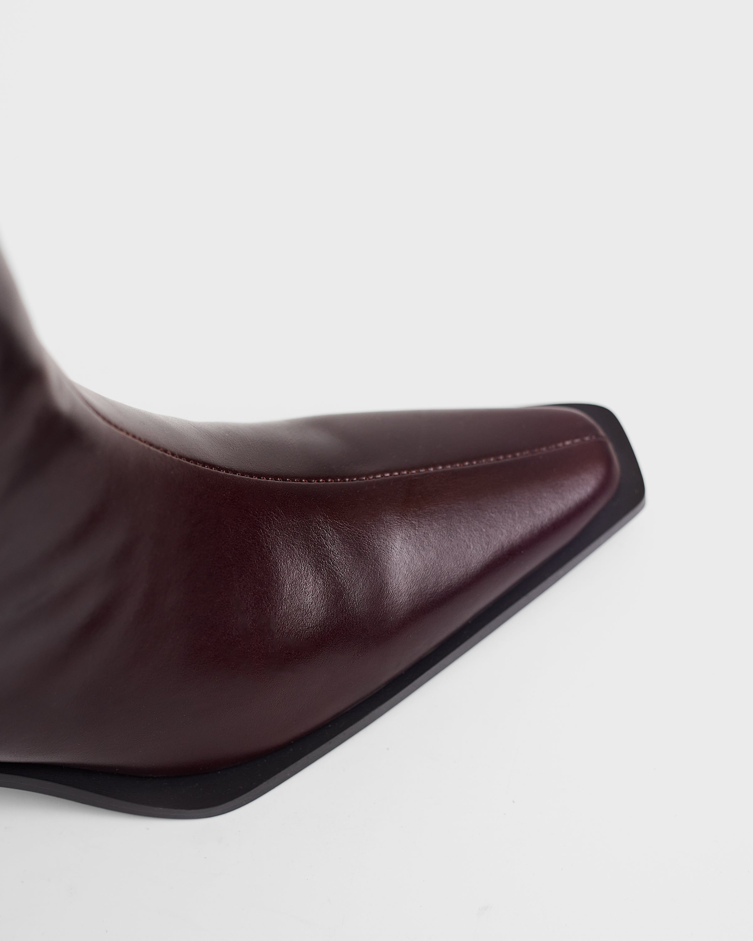 Bota de tacón de caña alta en piel color chocolate. Caña ancha, parte delantera en punta y tacón de forma plana.