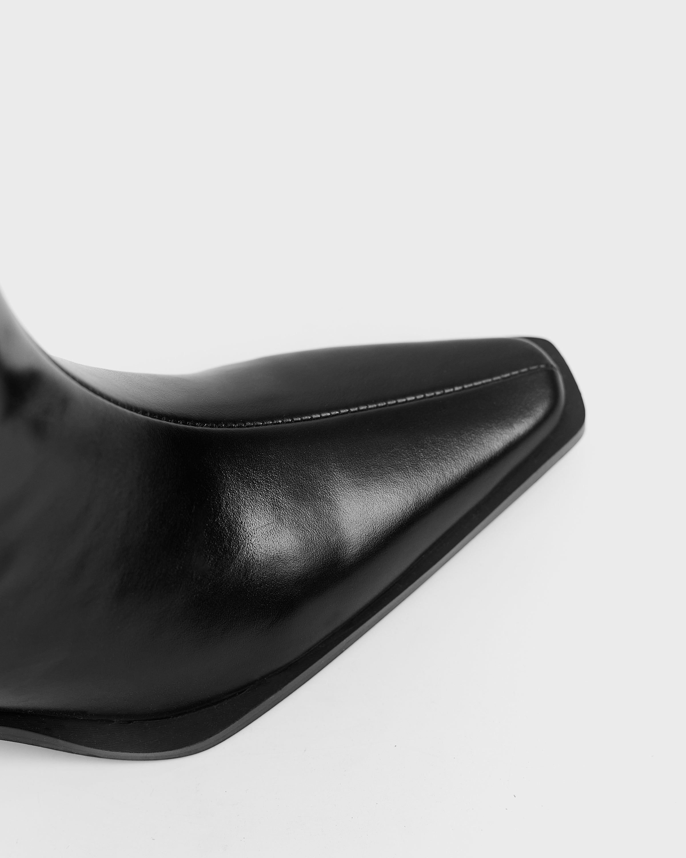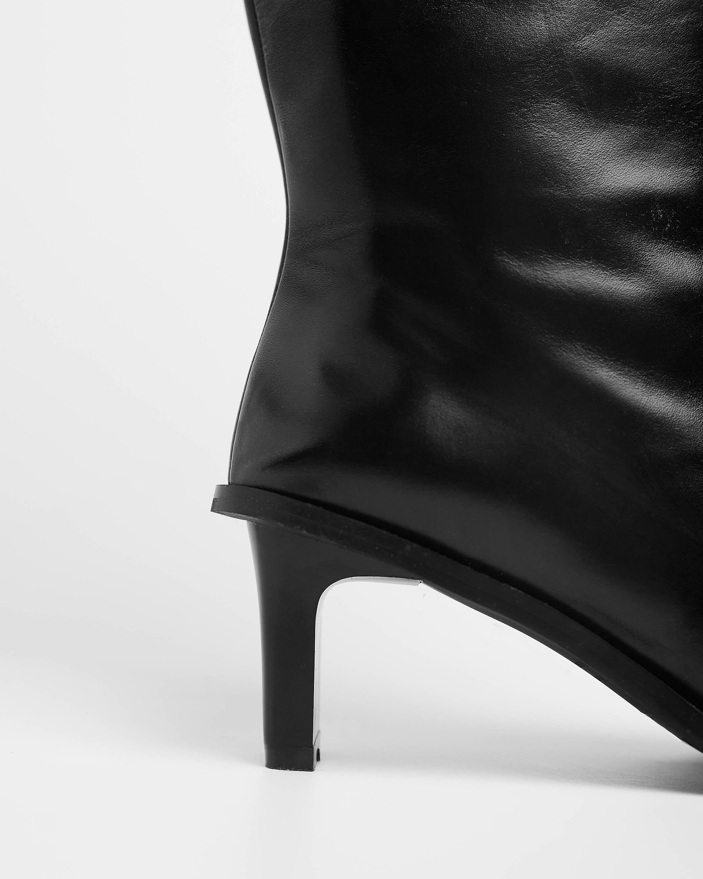 Bota de tacón de caña alta en piel color negro. Caña ancha, parte delantera en punta y tacón de forma plana.
