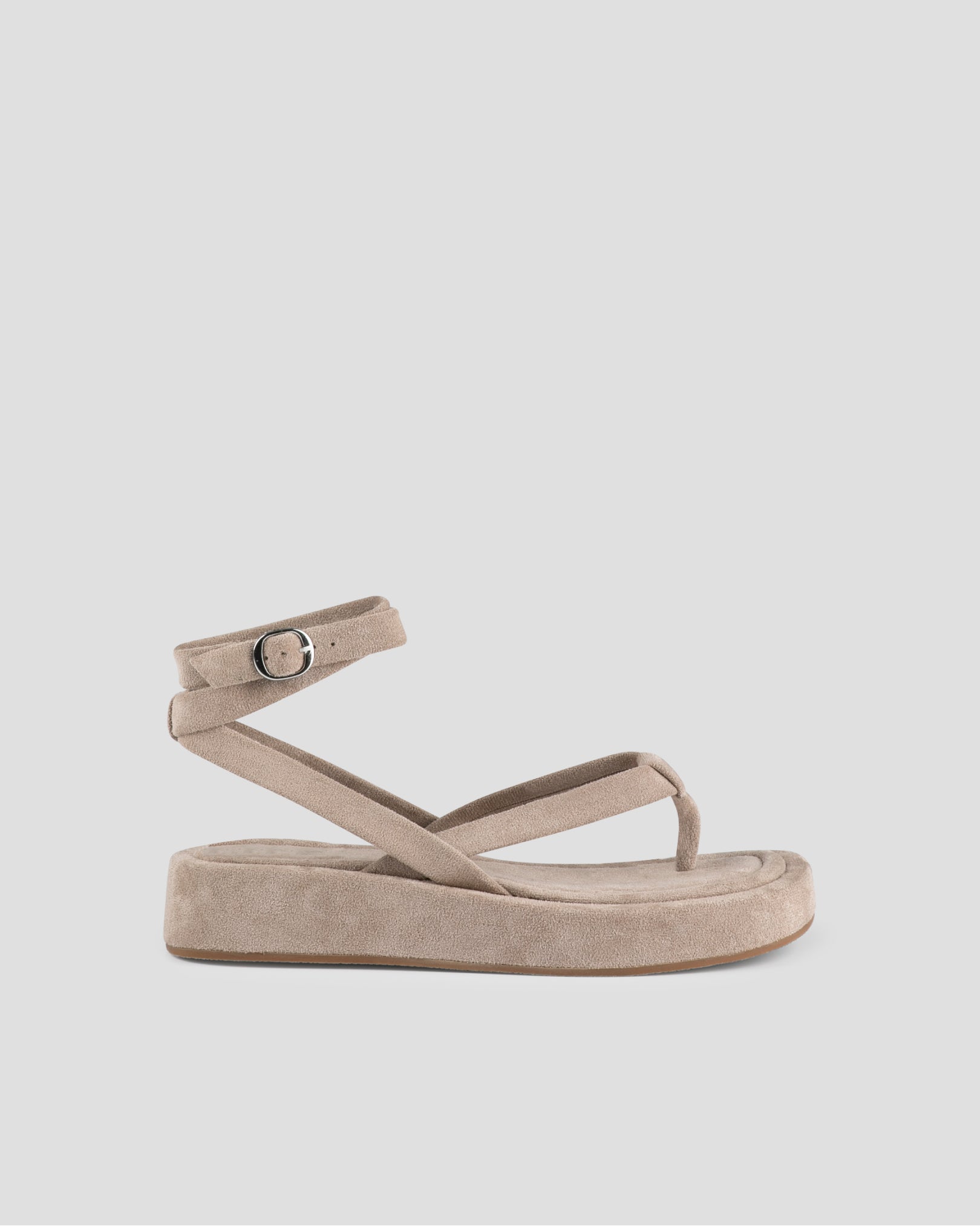 Sandale plateforme en daim vegan taupe. Bretelles avant et fermeture bracelet à l'arrière.