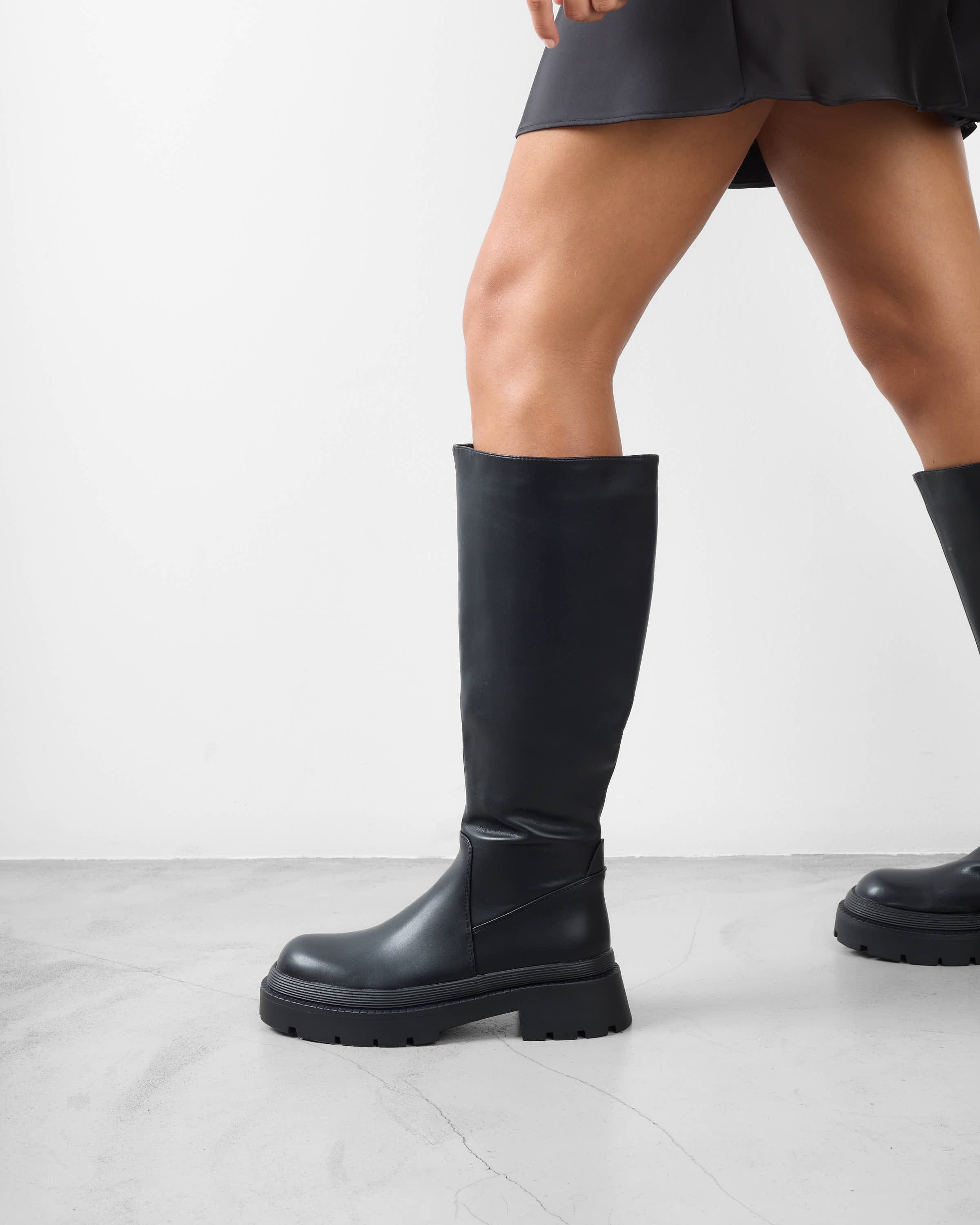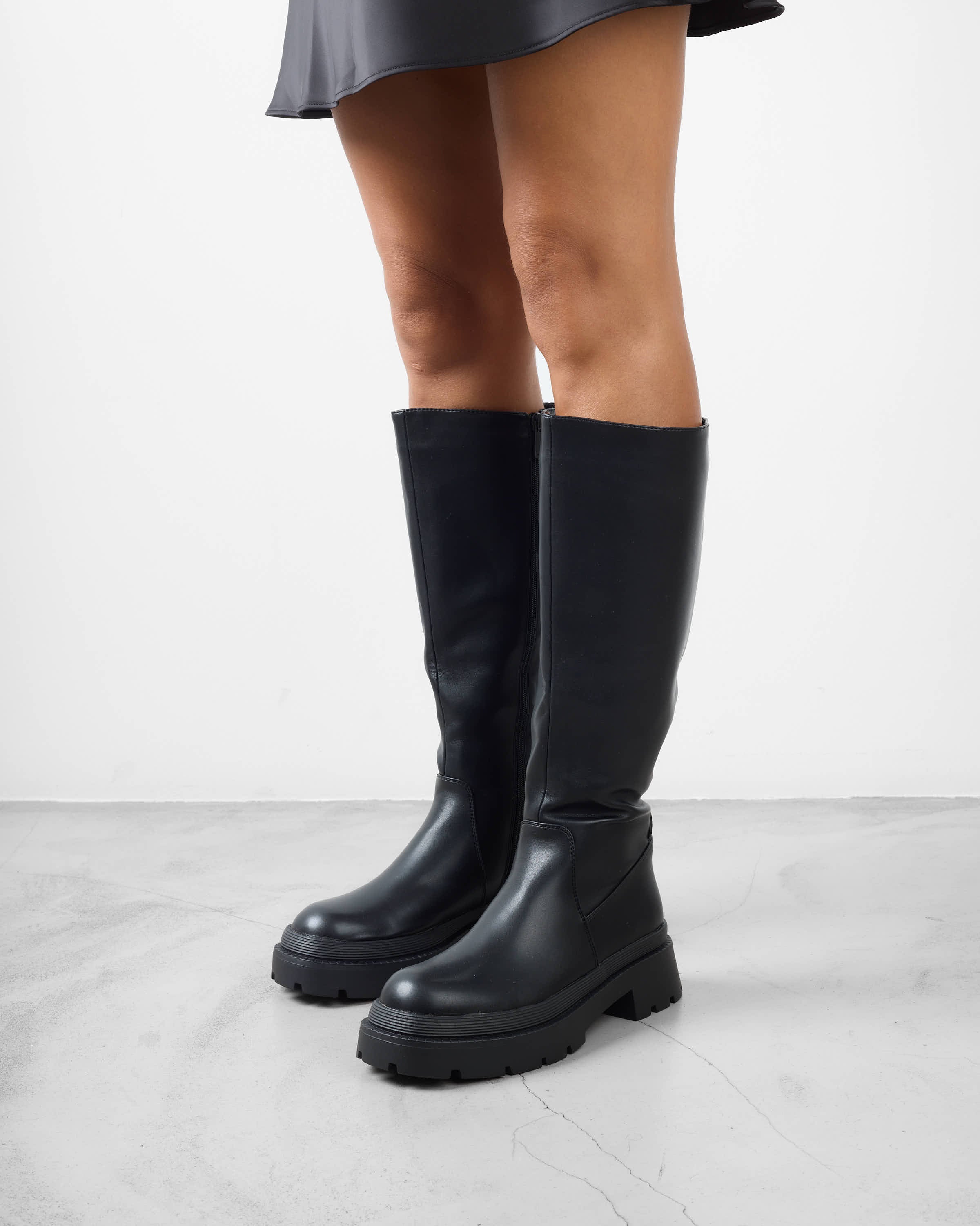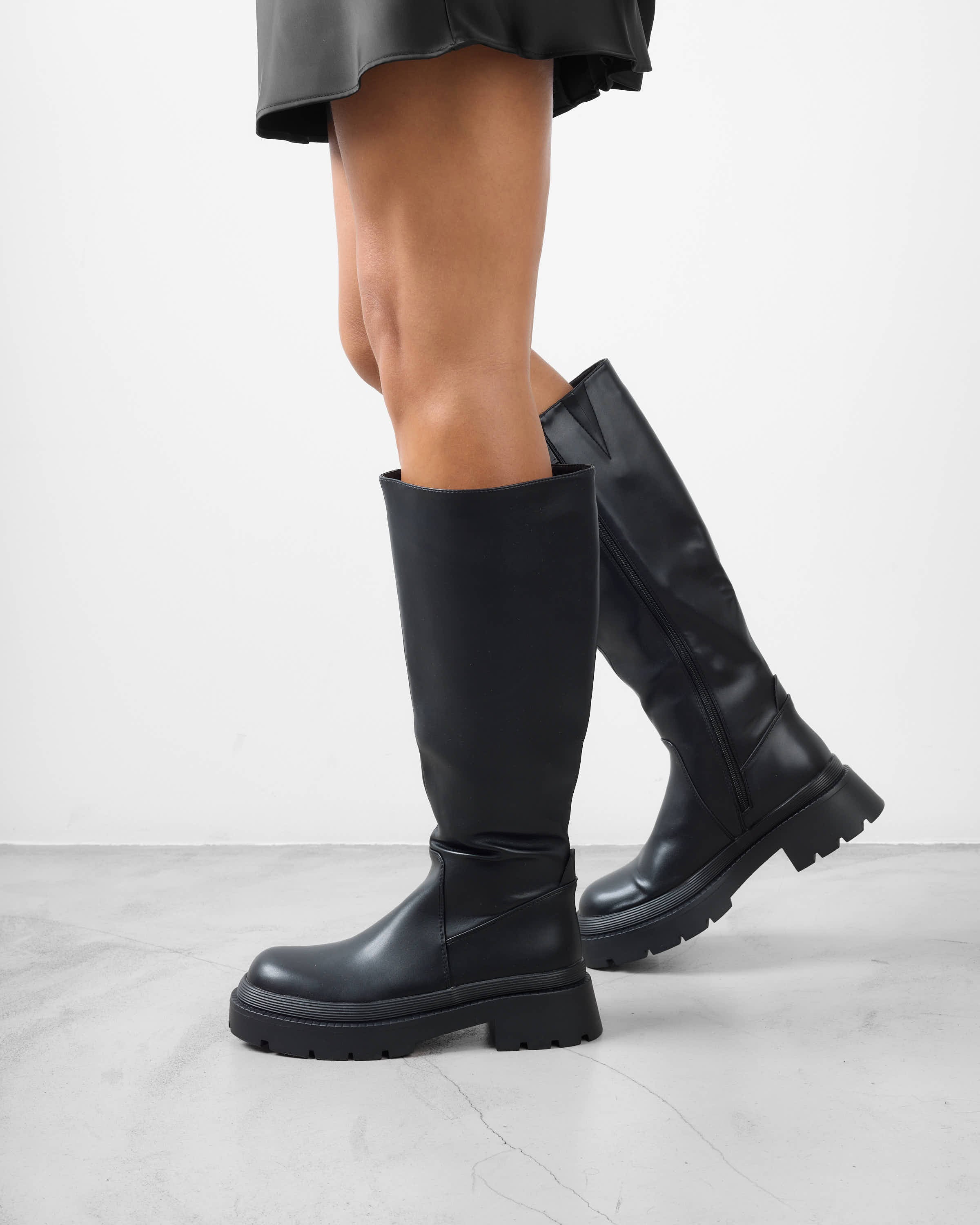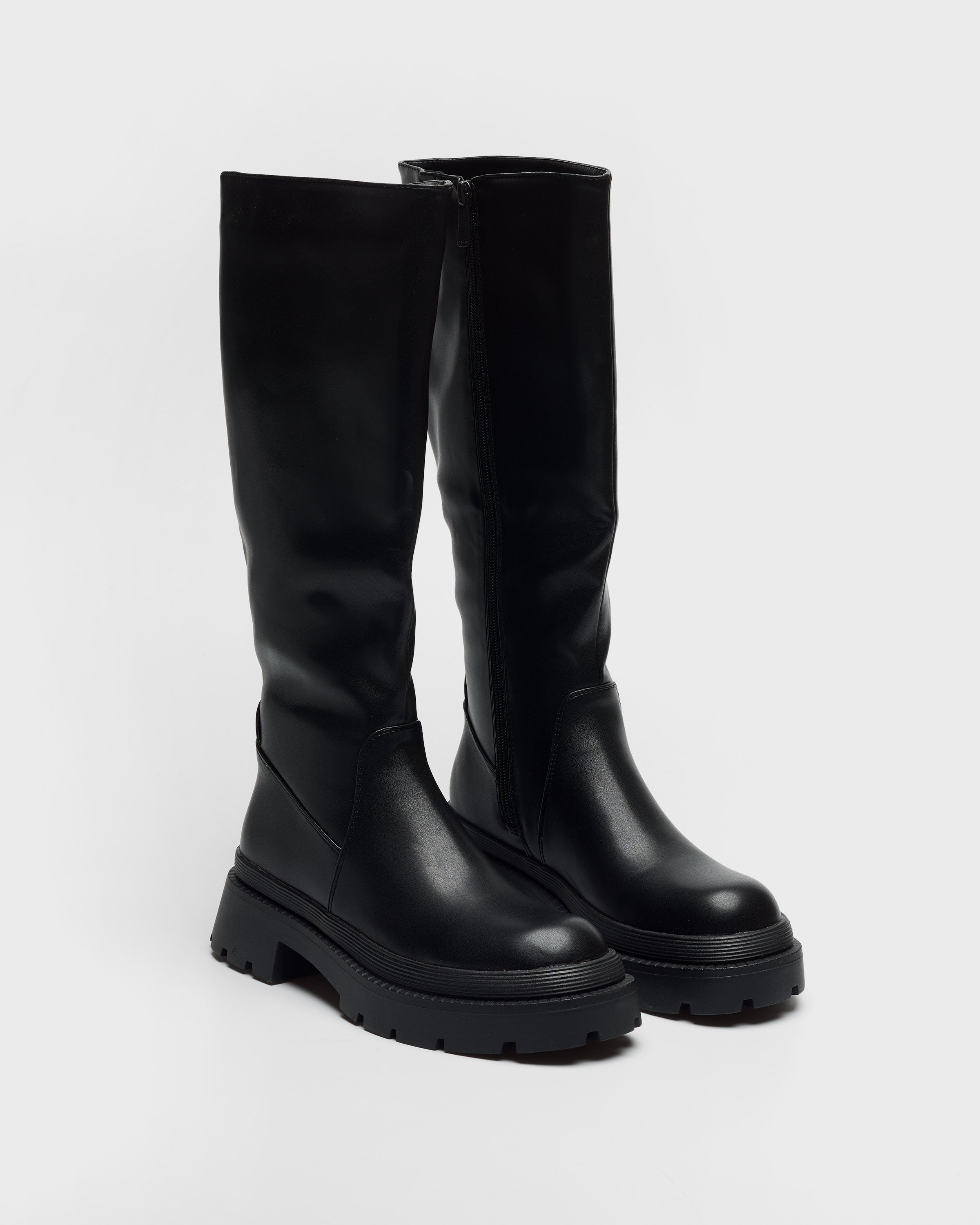 Bota de caña alta en piel sintética color negro. Suela tipo track. Cremallera interior para el cierre.