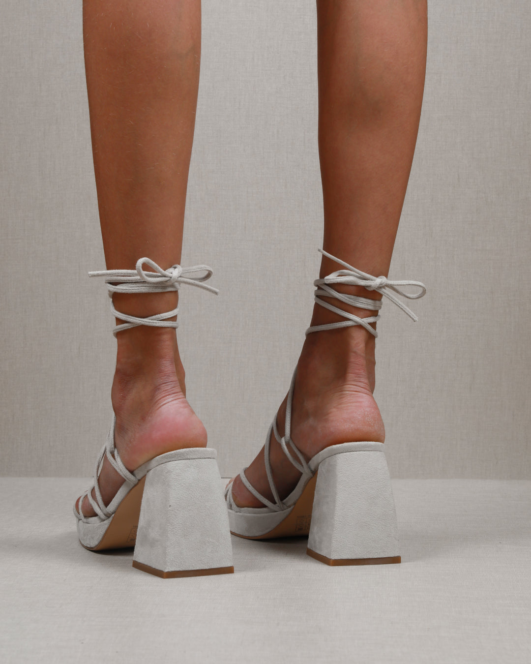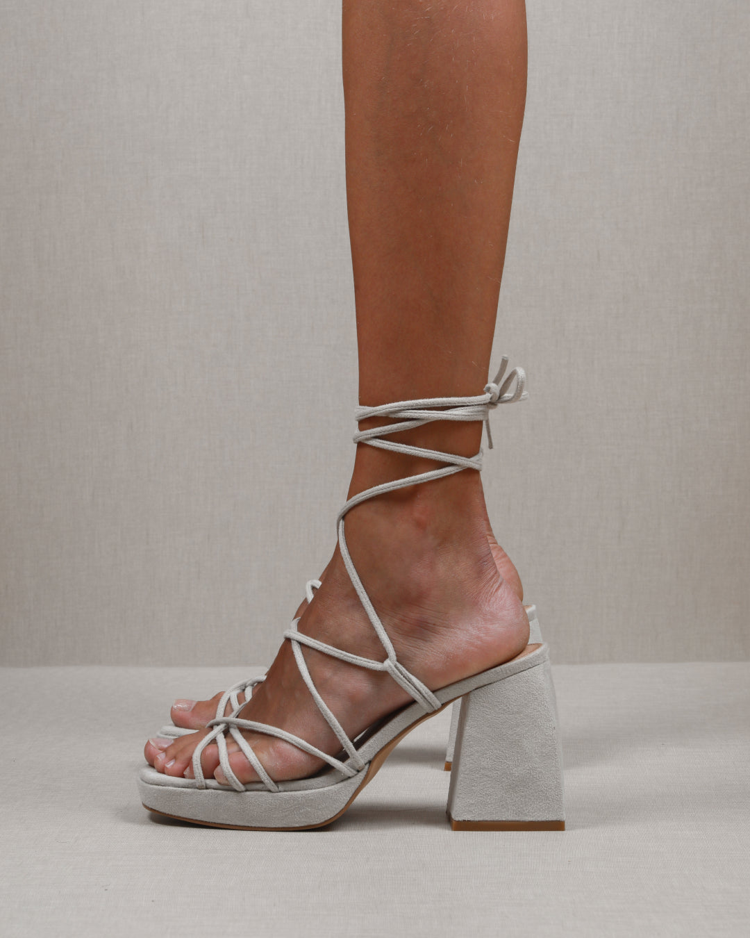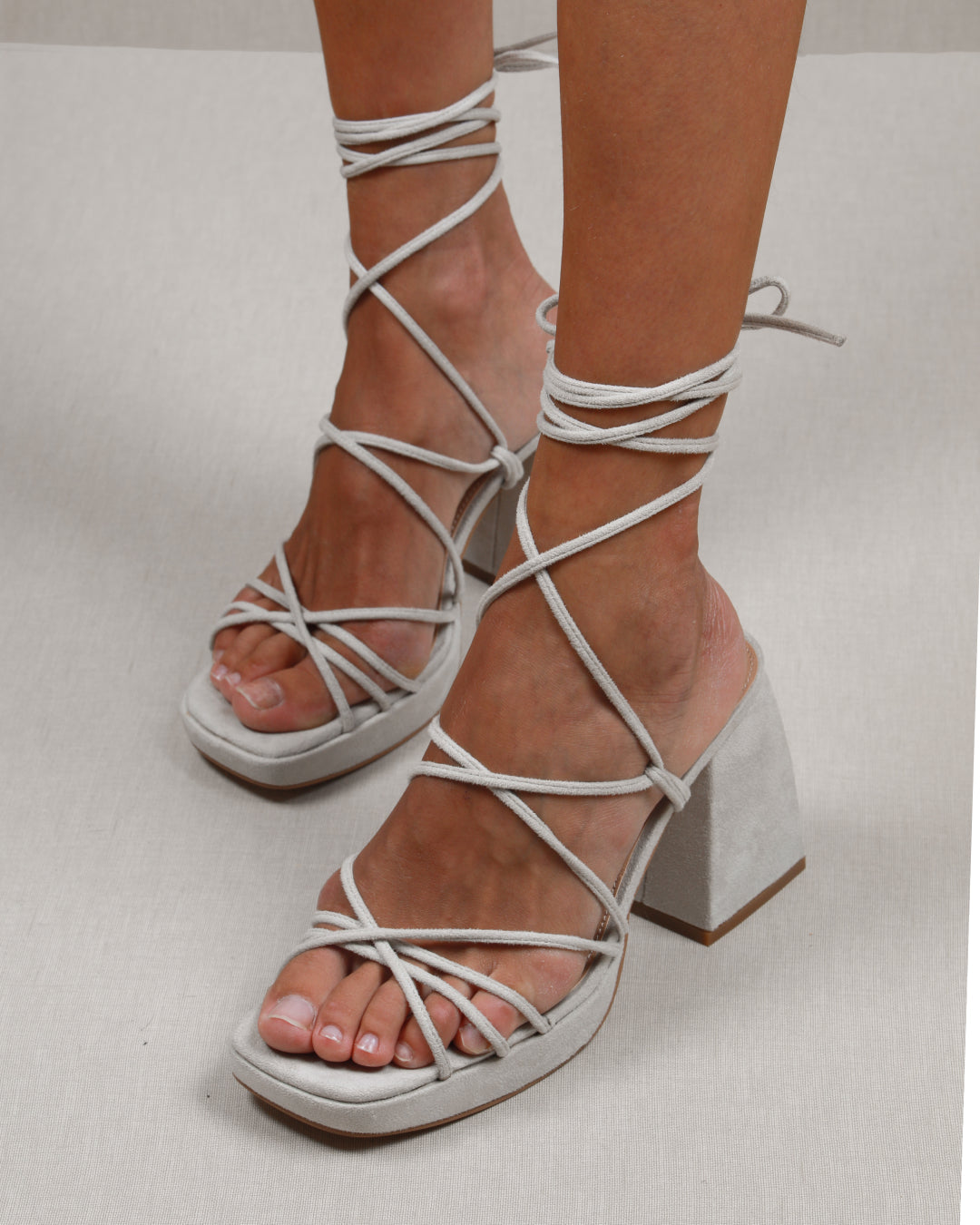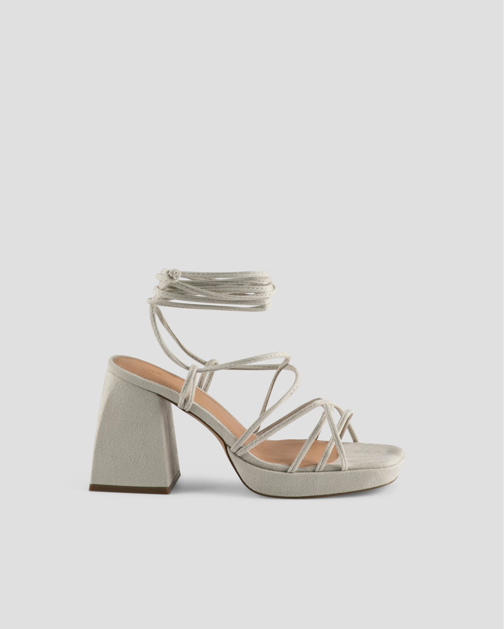 Sandale à talon en daim vegan écru avec plusieurs fines lanières, à nouer à la cheville.