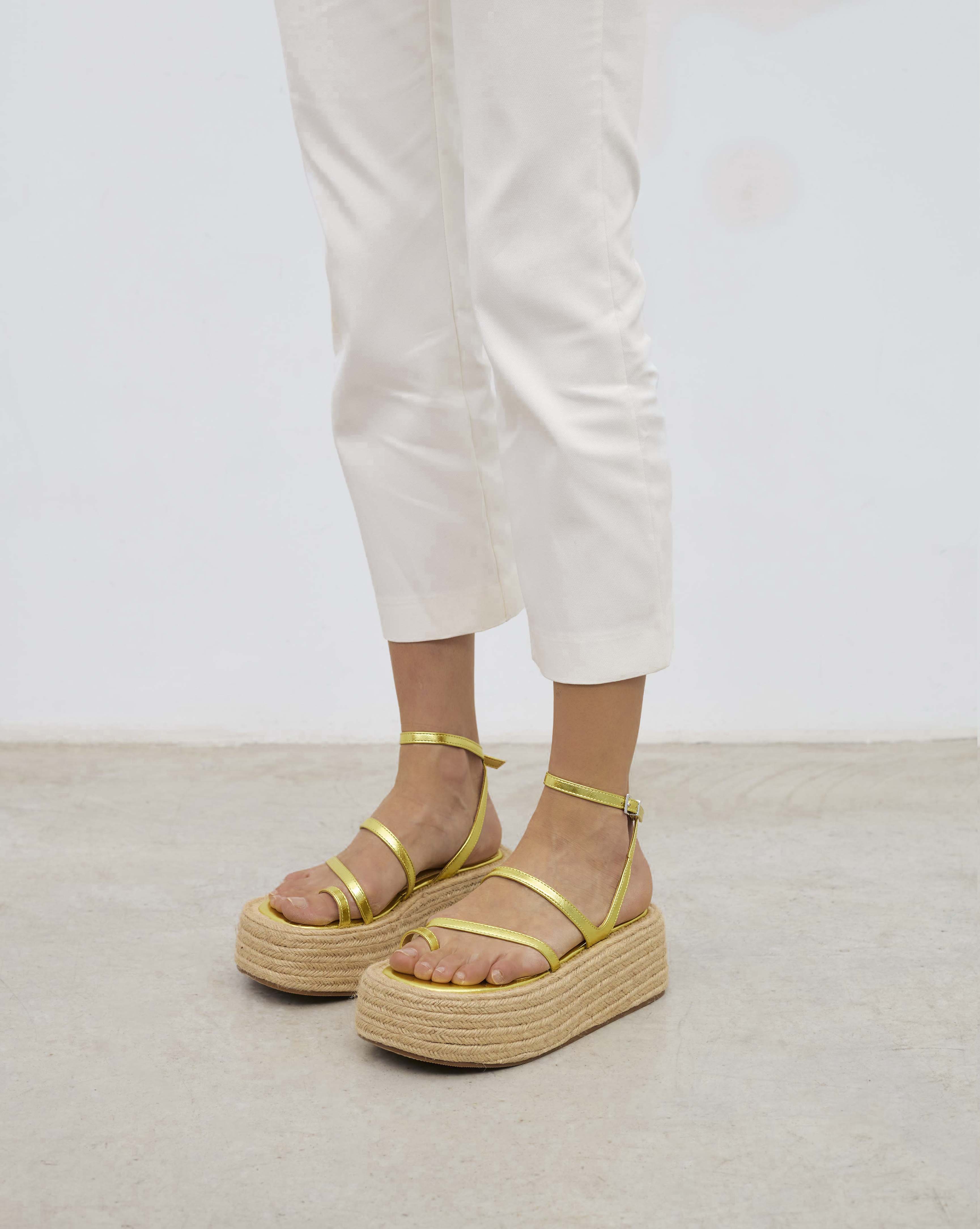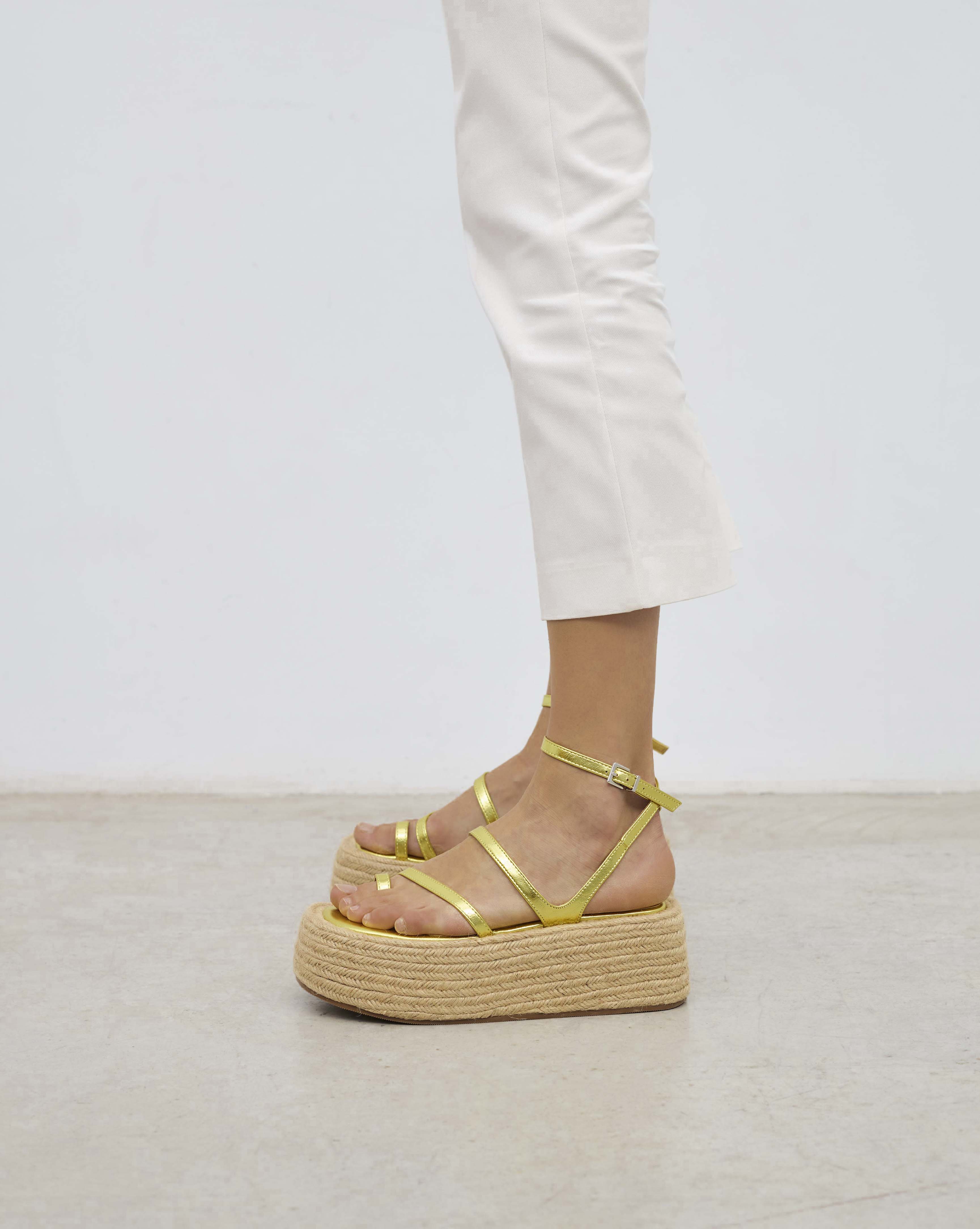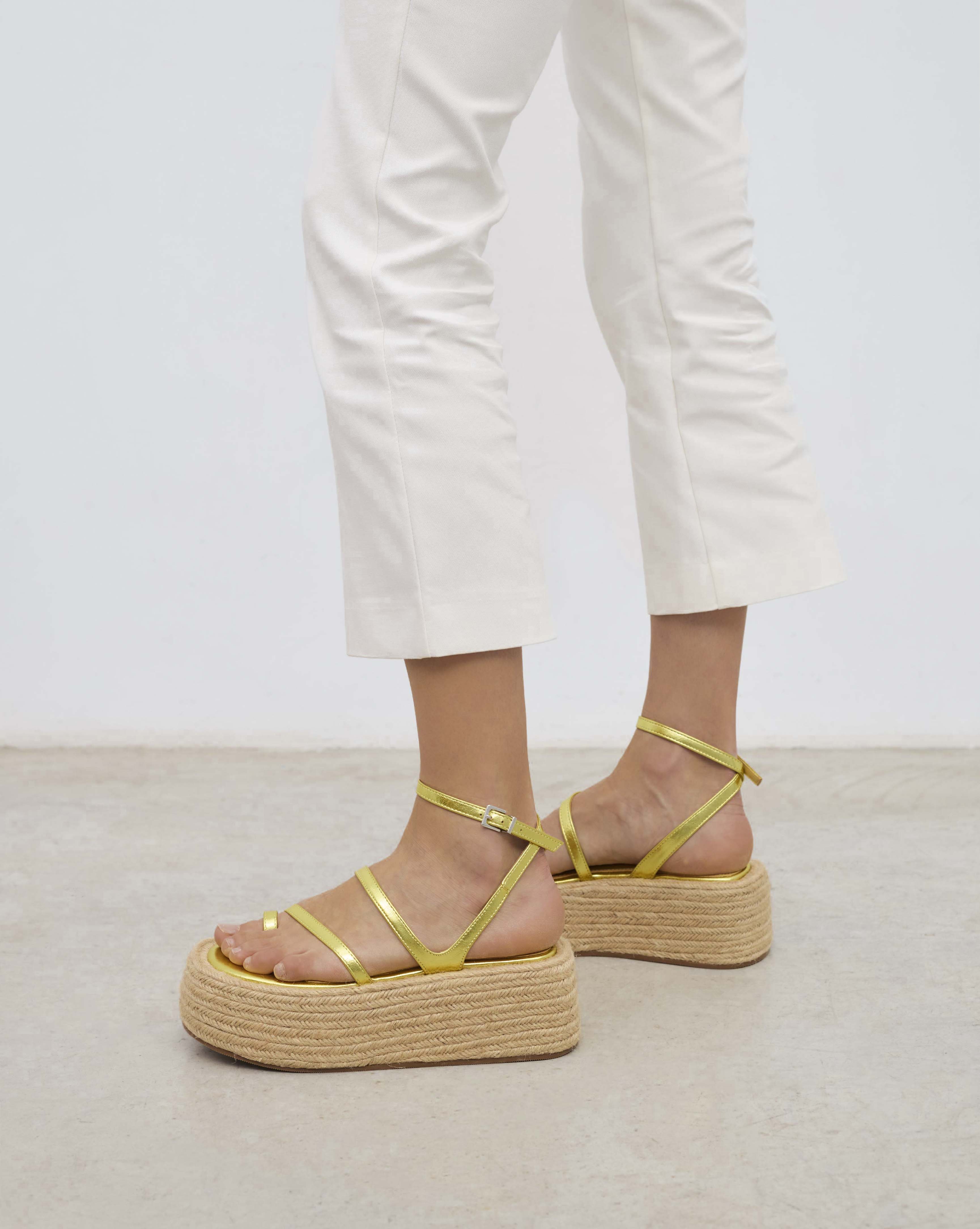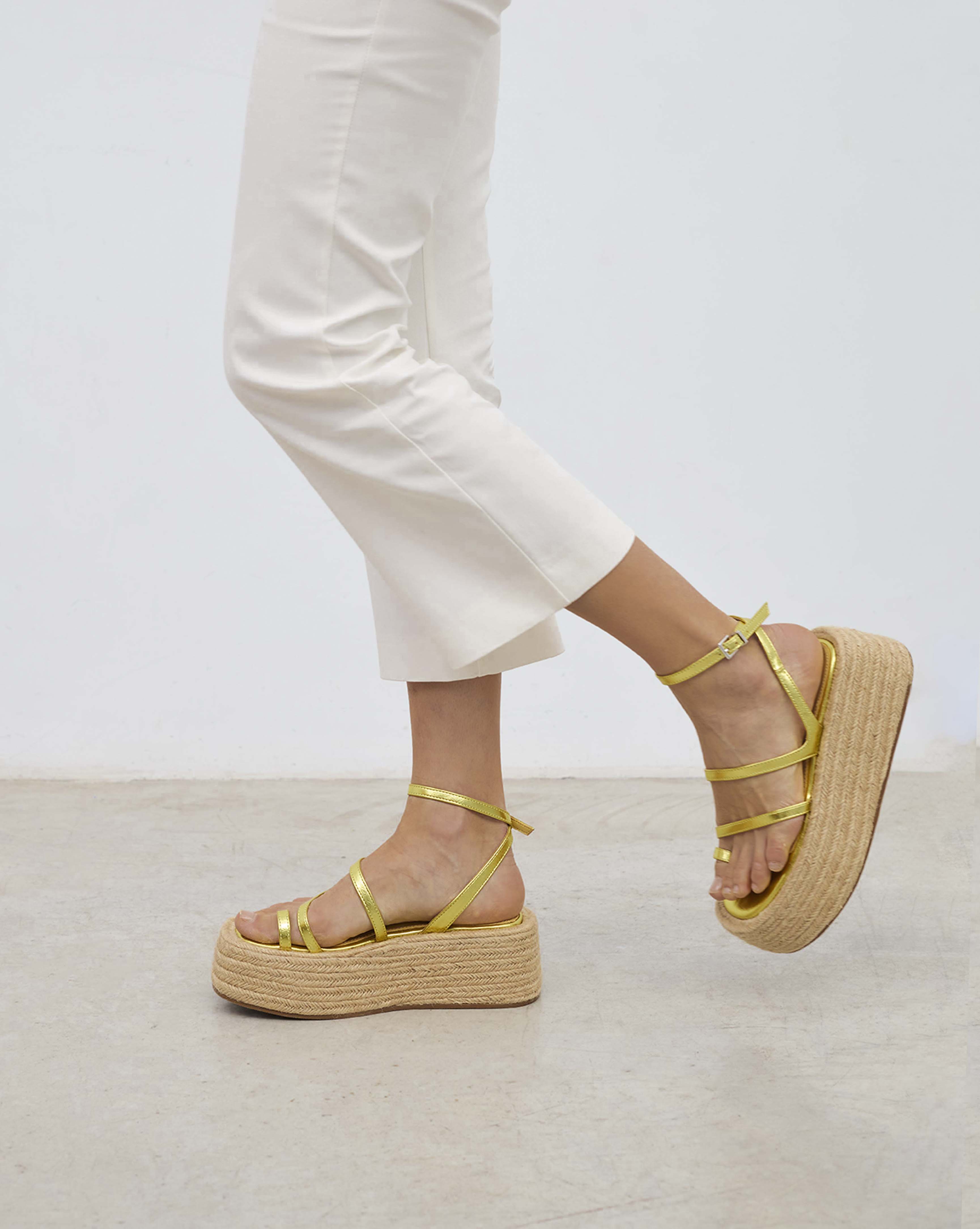 Sandalia con plataforma en bloque de esparto en color dorado brillante. Parte delantera con tiras a diferentes niveles. Cierre de tiras al tobillo con hebilla.