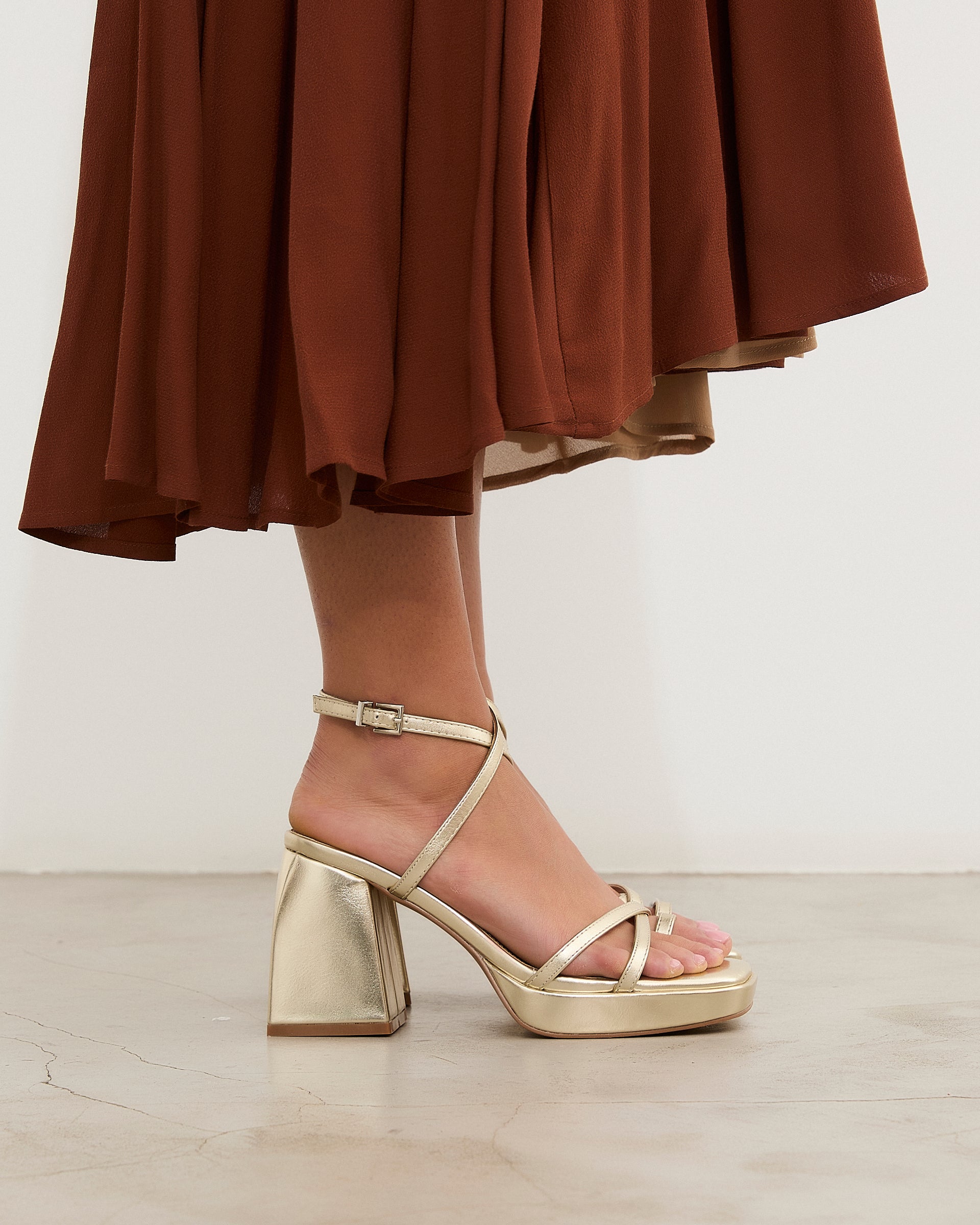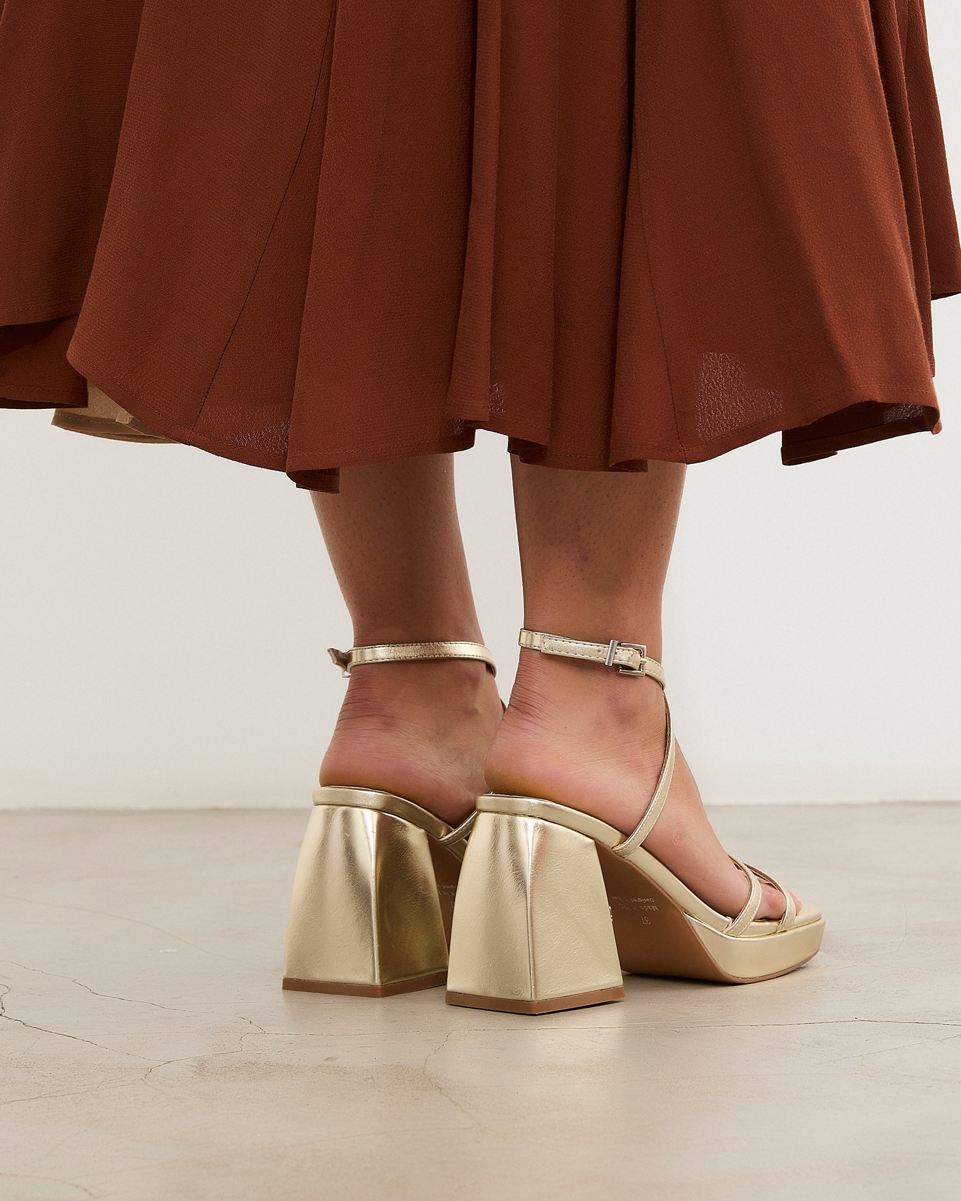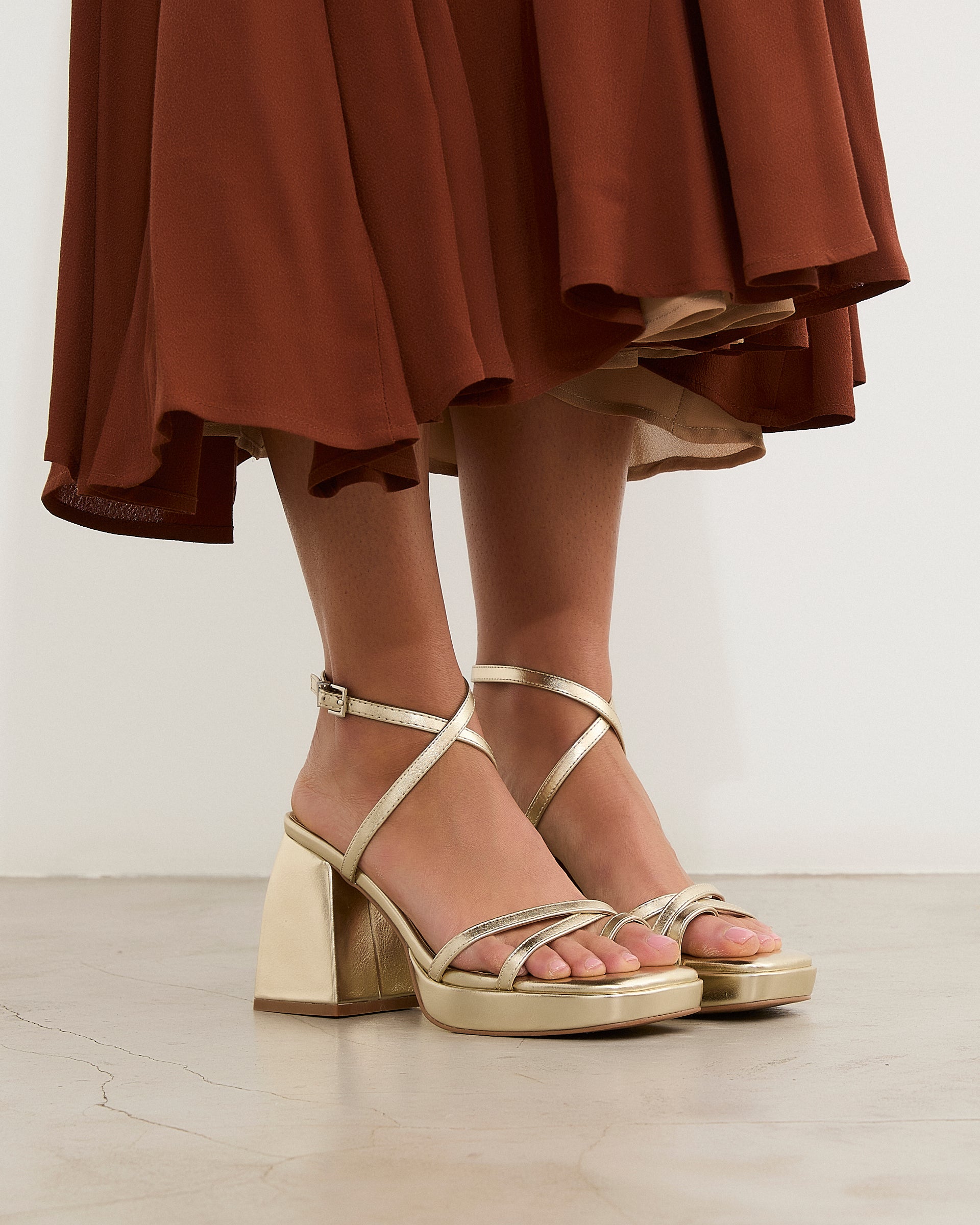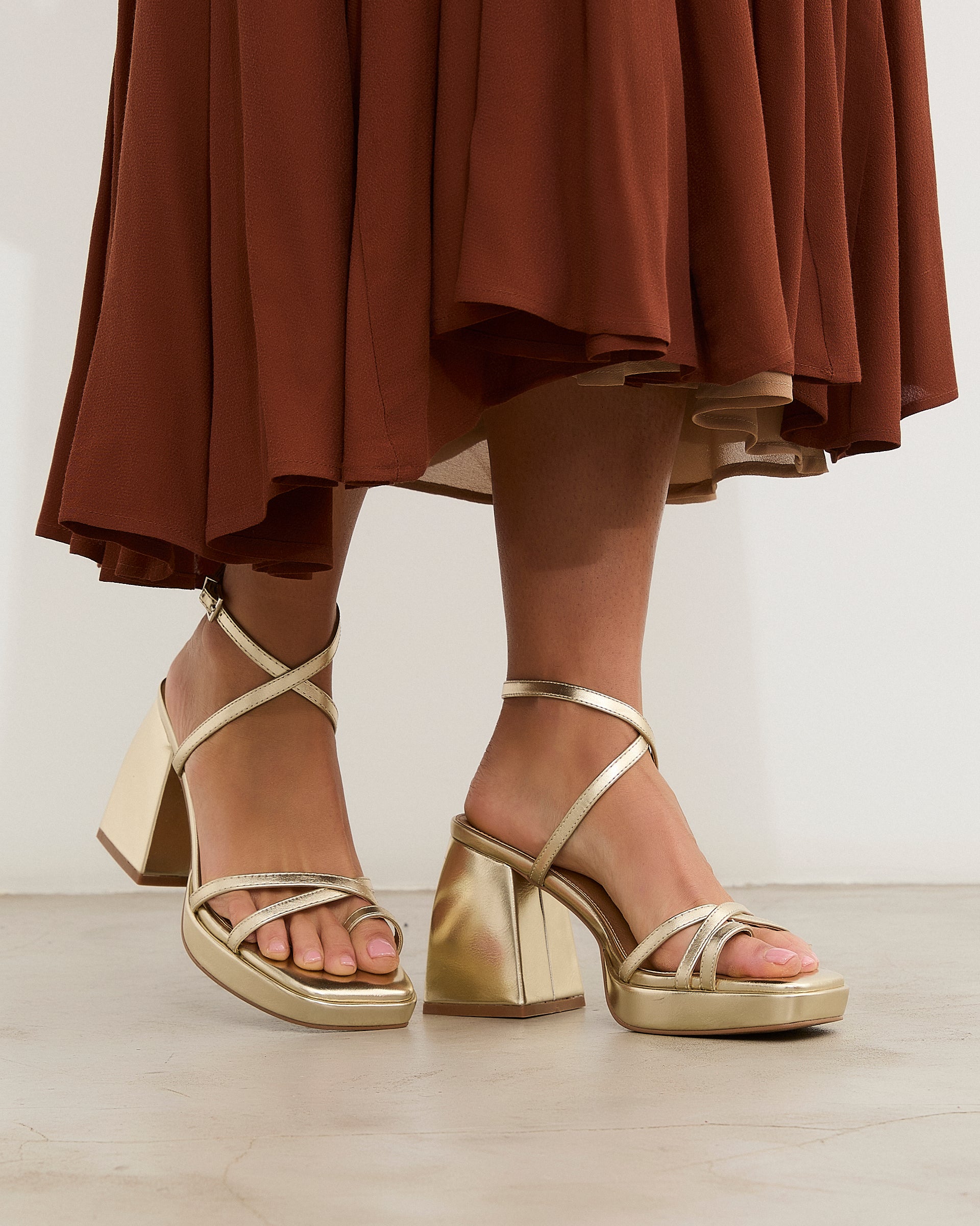 Sandale à talon haut en cuir vegan doré avec deux lanières croisées sur le devant et une lanière sur la pointe. Sangles de cheville à l'arrière avec fermeture à boucle.