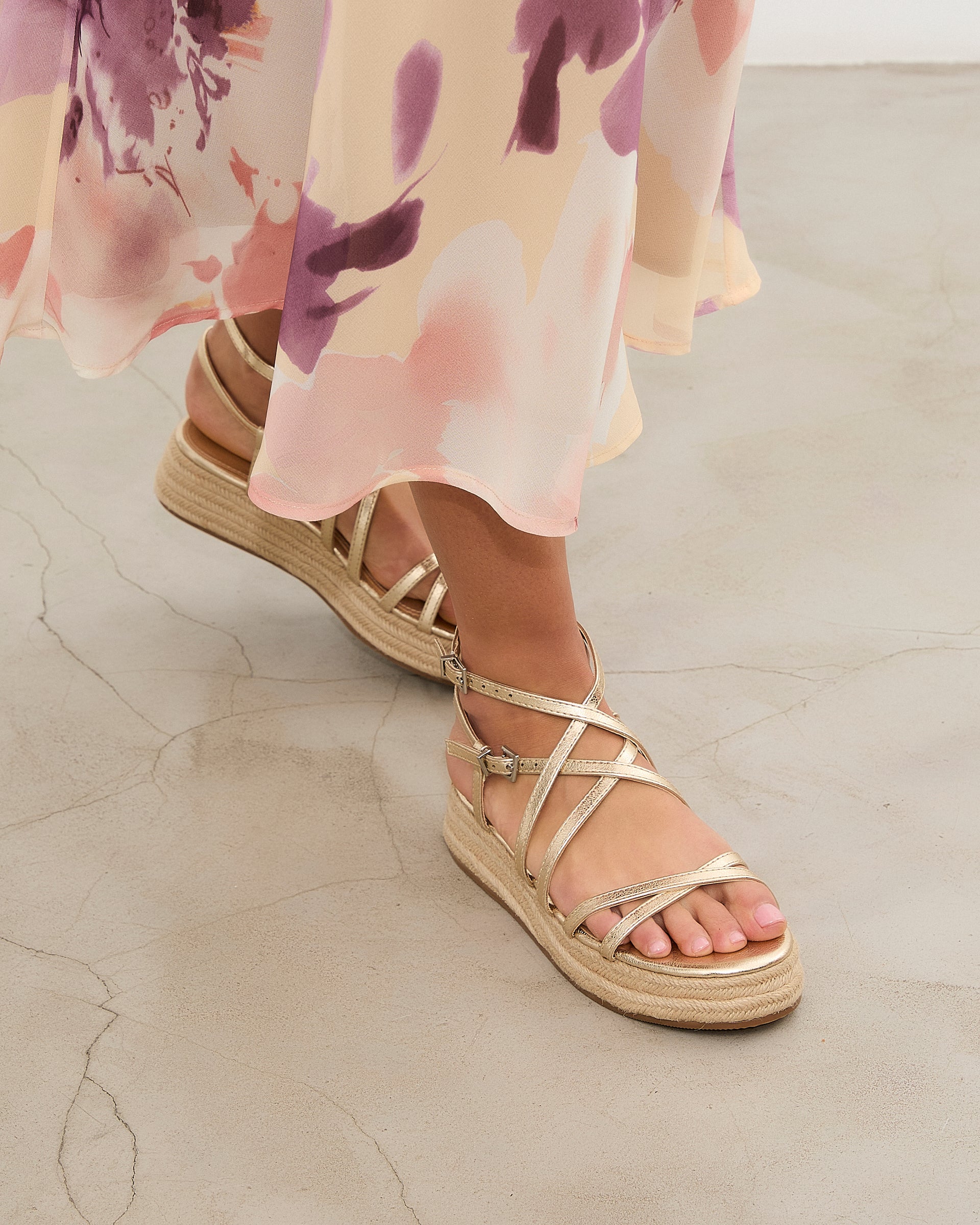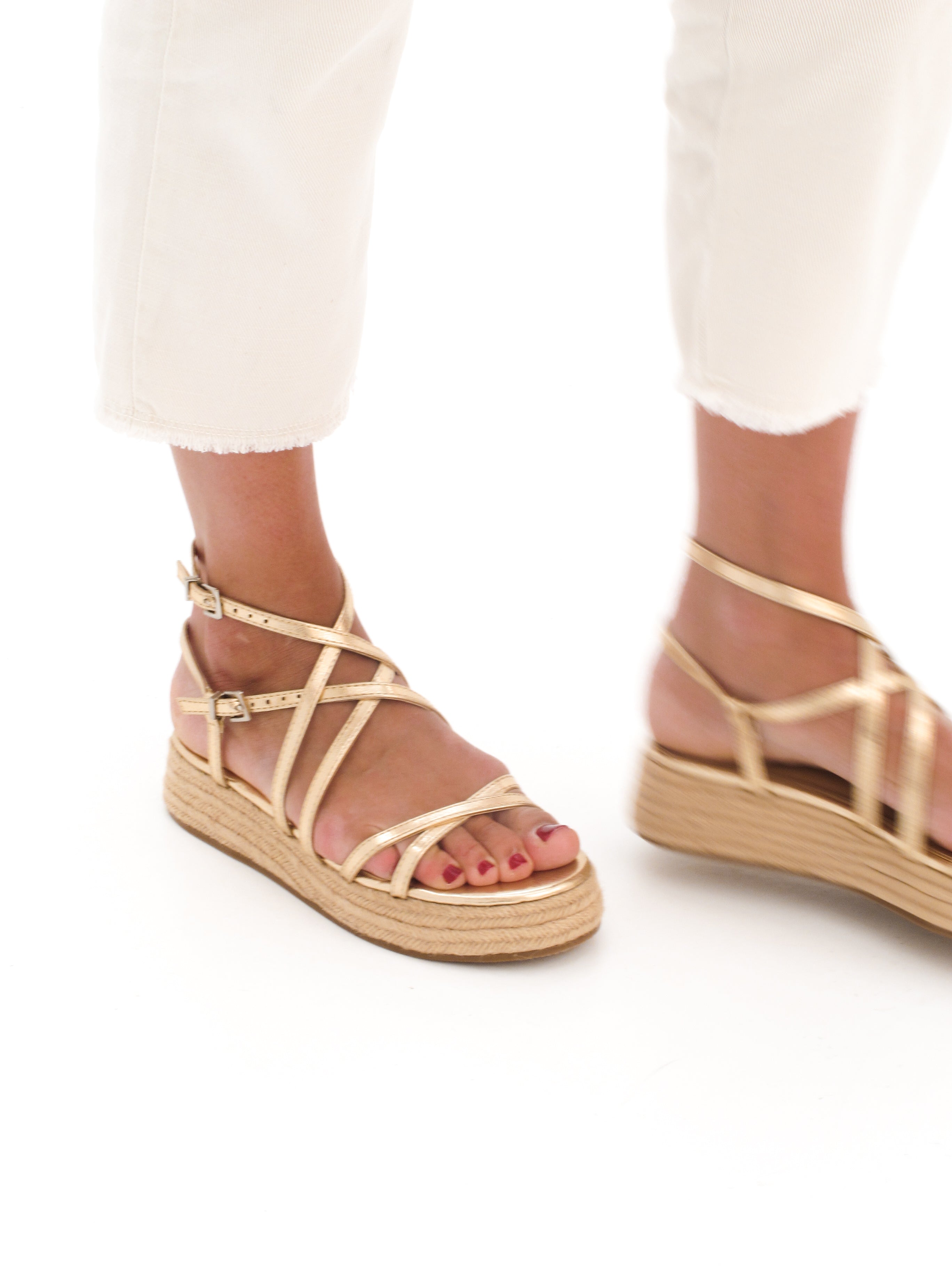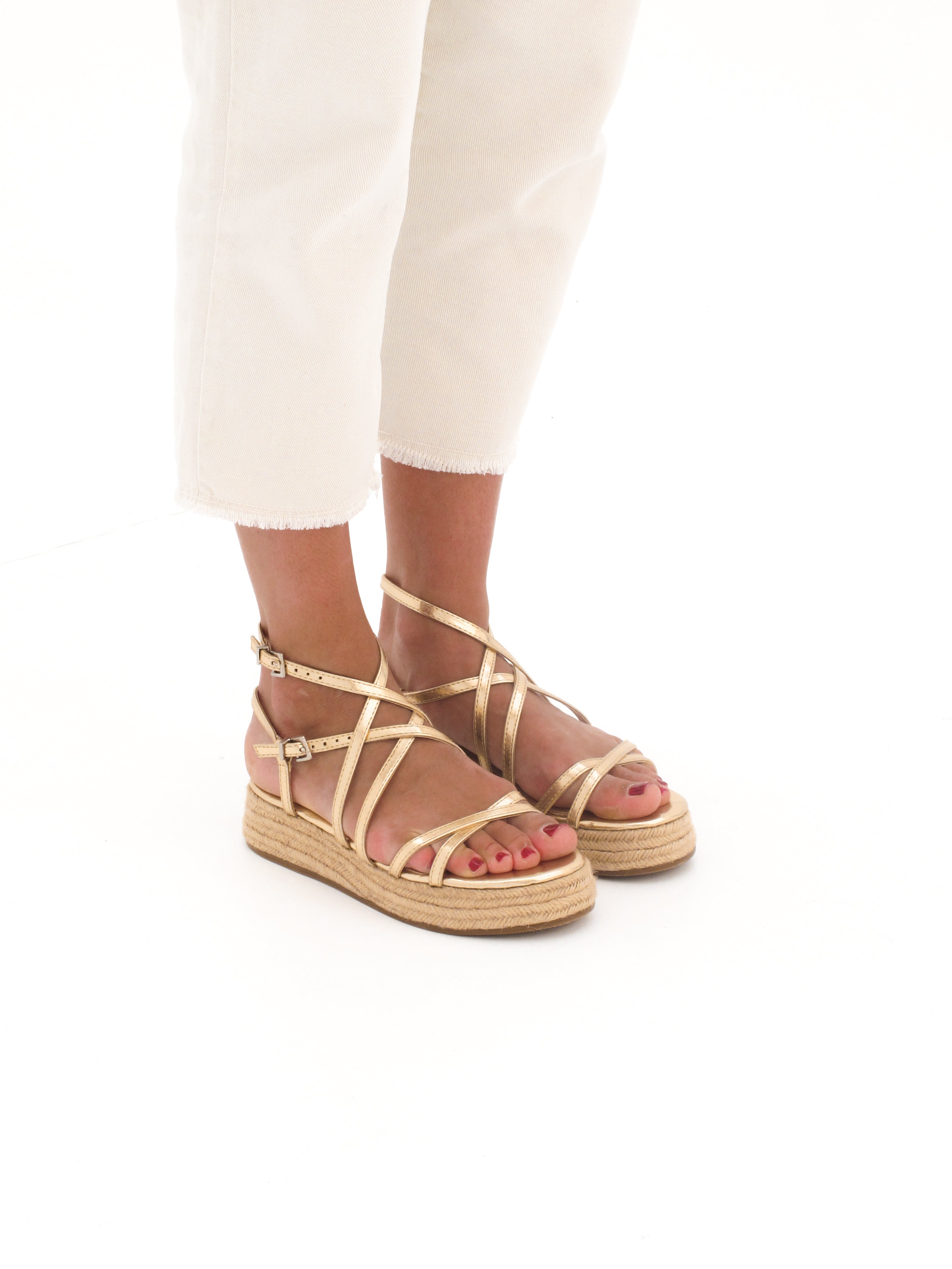 Sandale avec double semelle en sparte. Sangles à différentes hauteurs et support de cheville en cuir vegan doré.