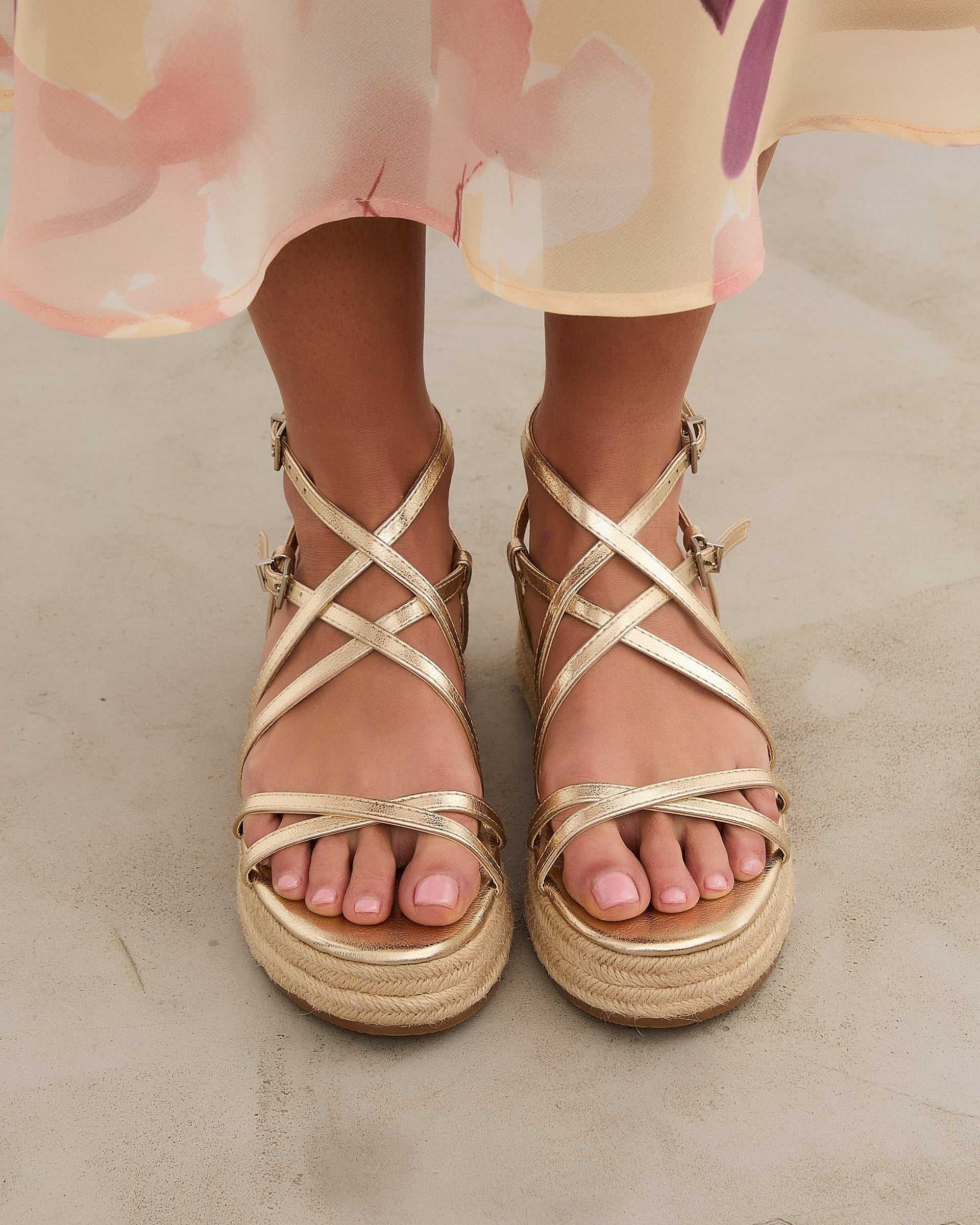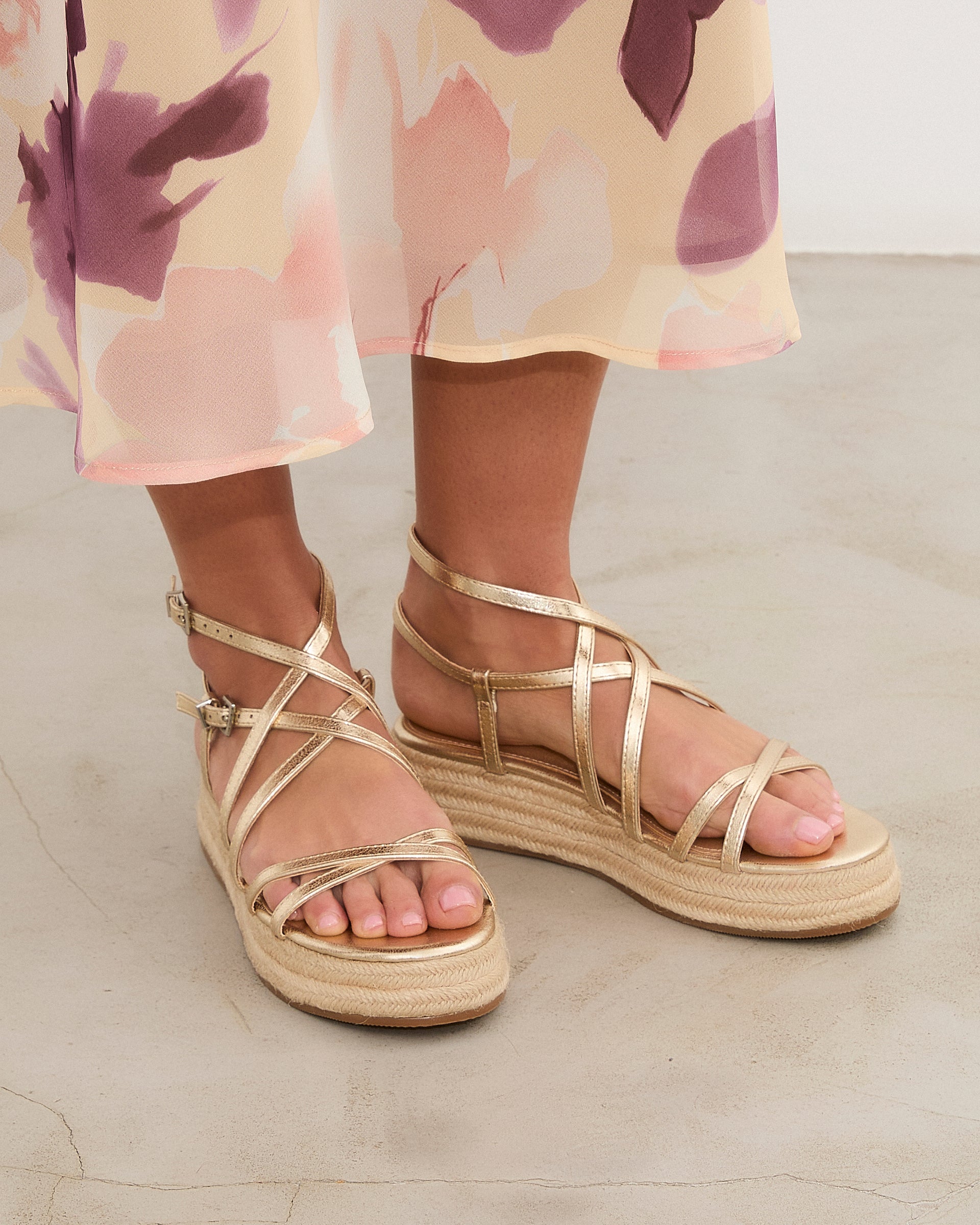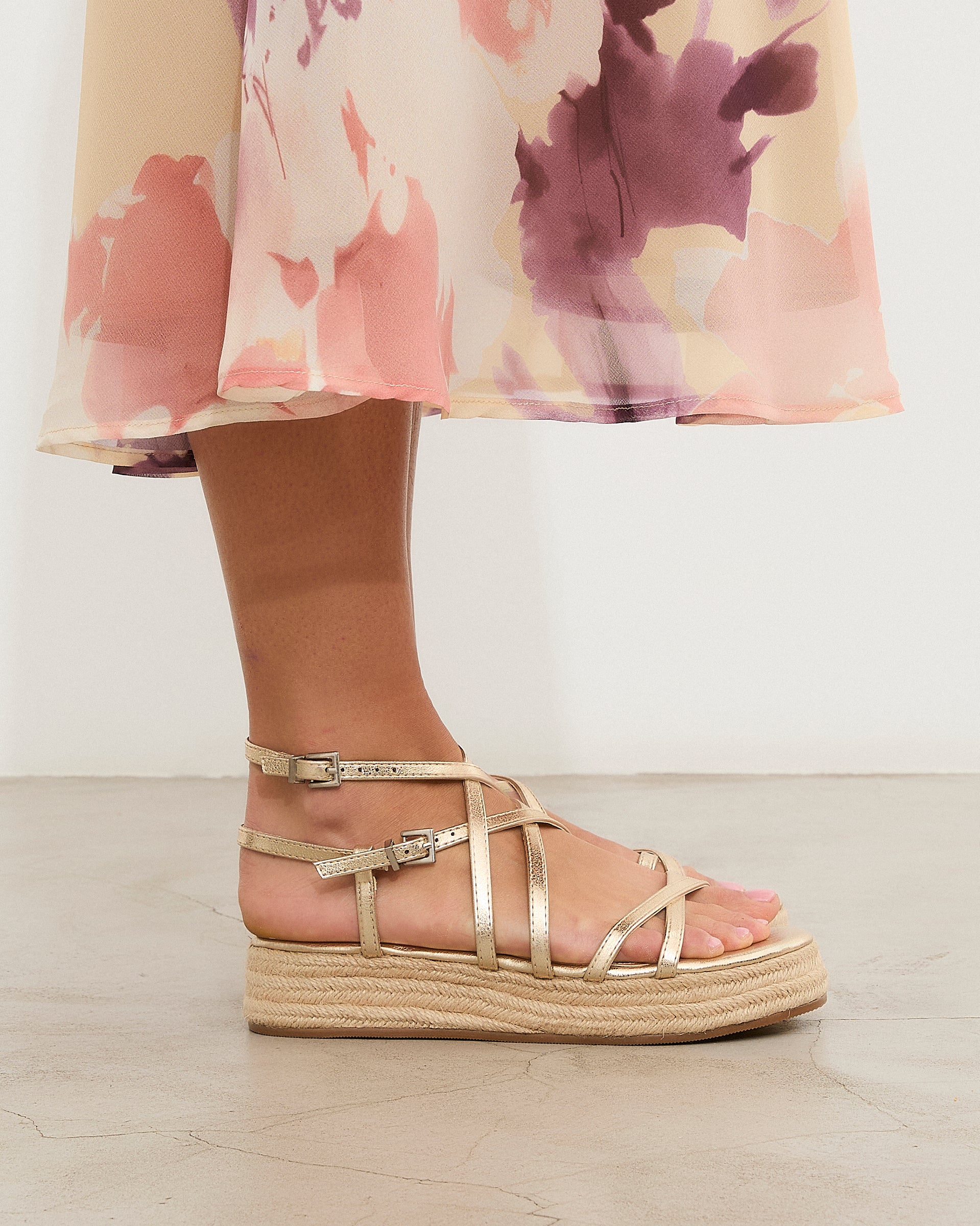 Sandale avec double semelle en sparte. Sangles à différentes hauteurs et support de cheville en cuir vegan doré.