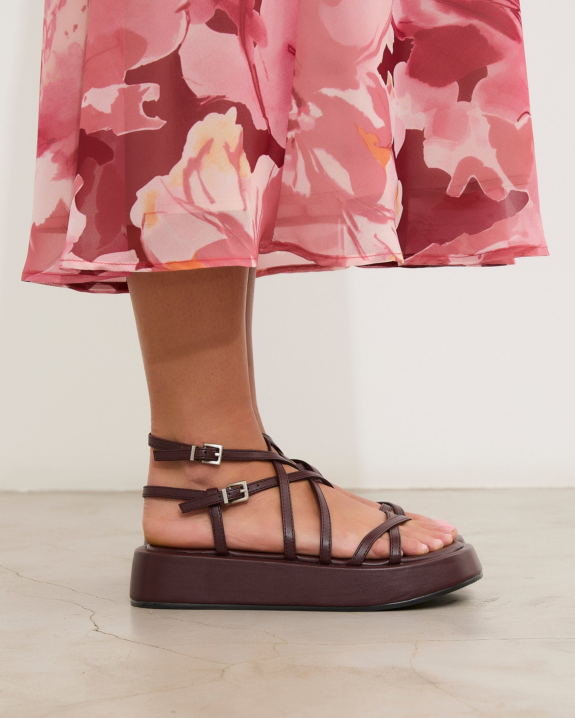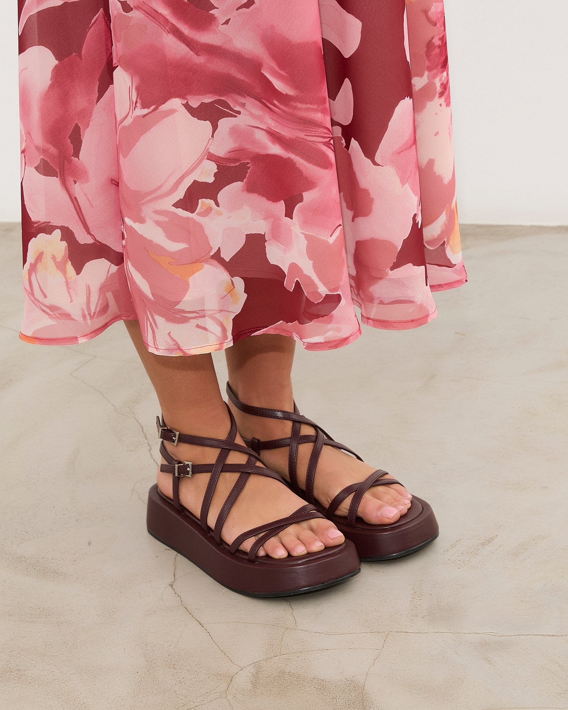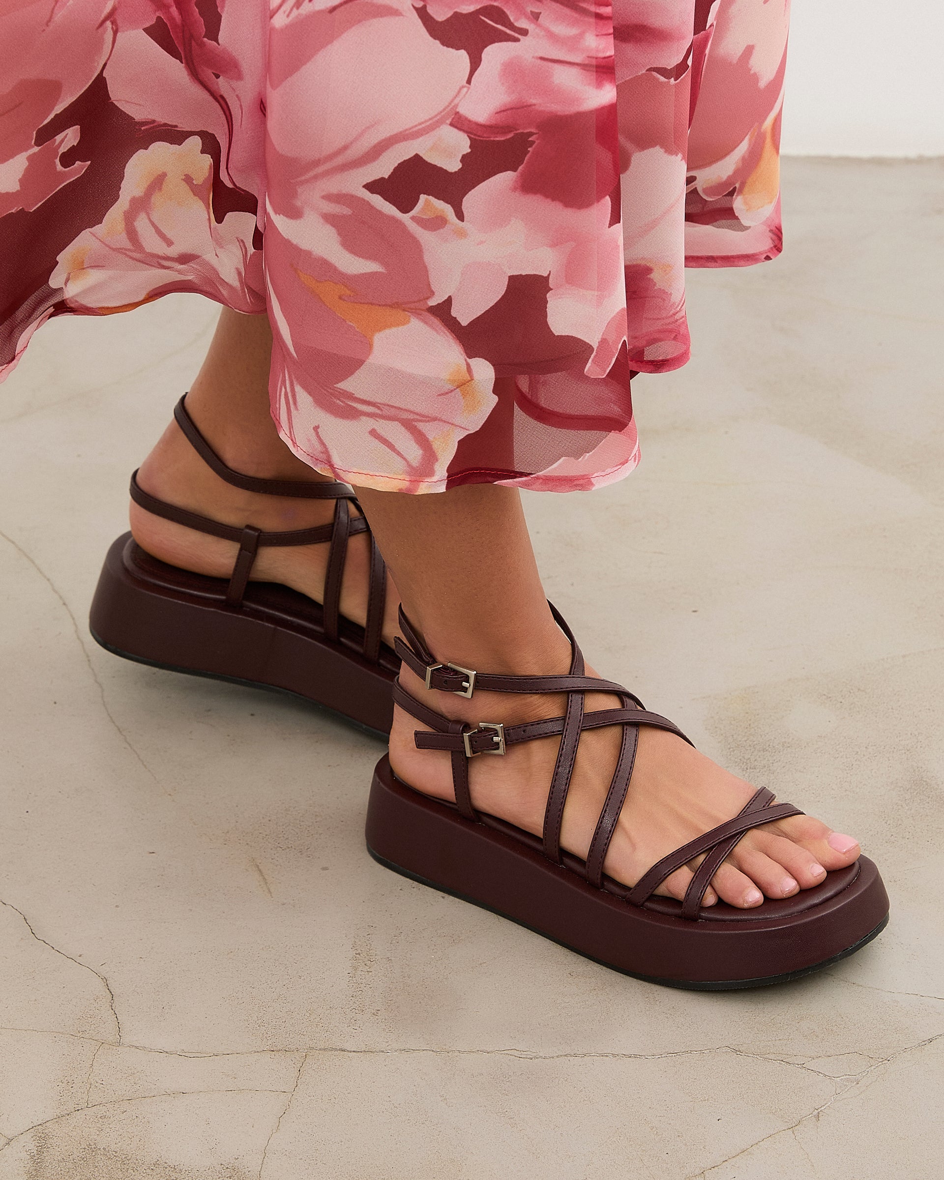 Sandalia plana con plataforma en color burdeos. Tiras a distintas alturas y sujeción en el tobillo con doble hebilla.