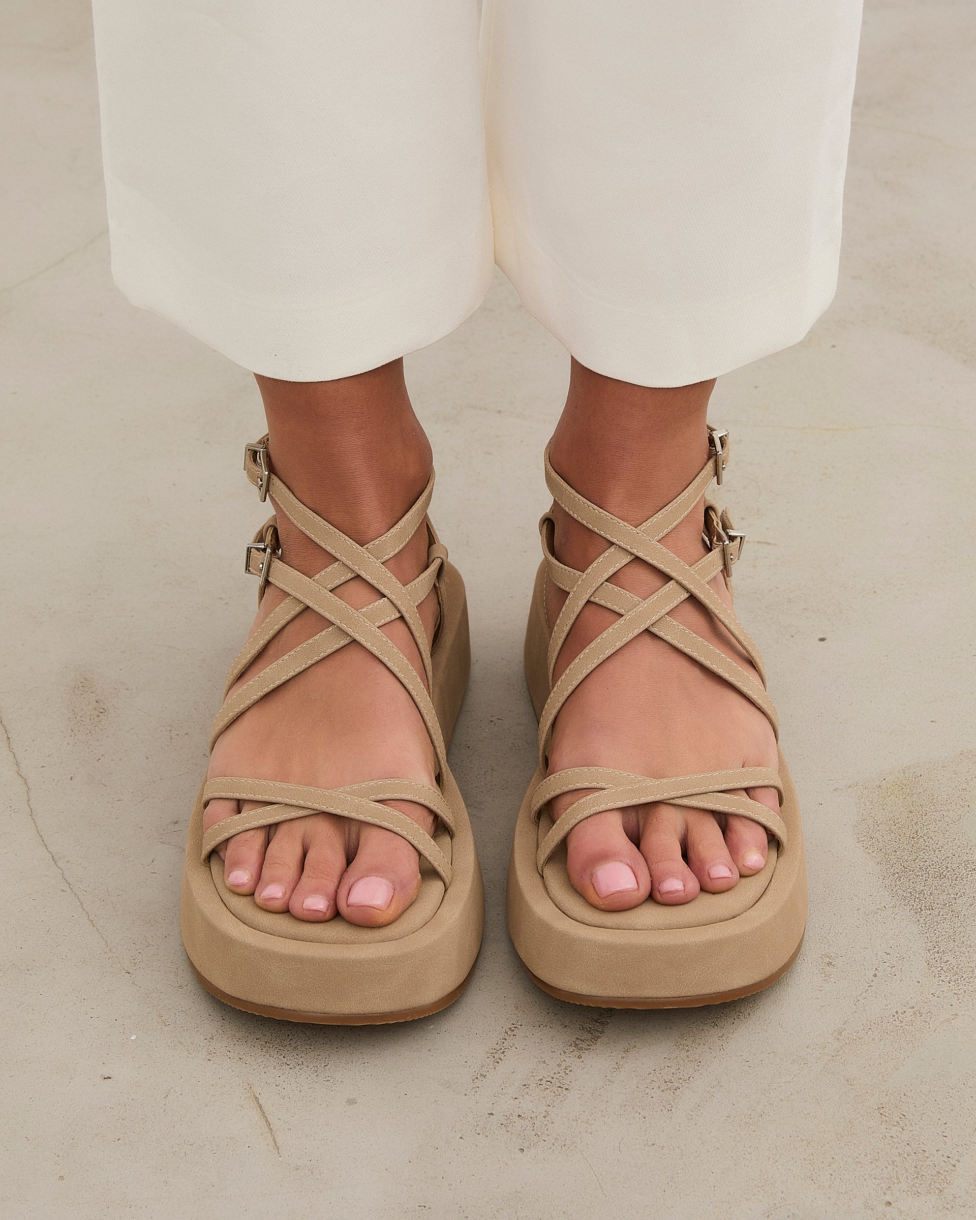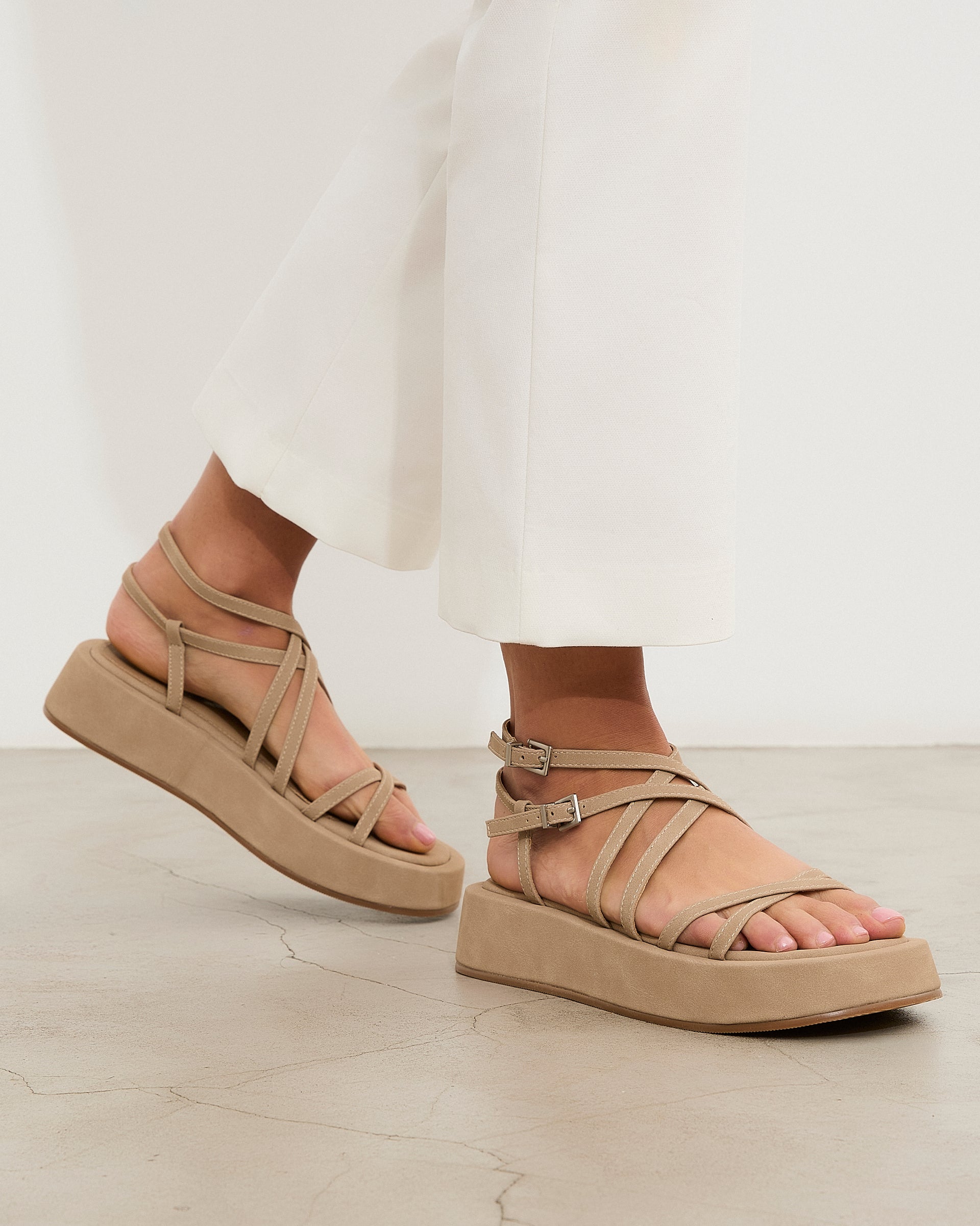 Sandalia plana con plataforma en color topo. Tiras a distintas alturas y sujeción en el tobillo con doble hebilla.