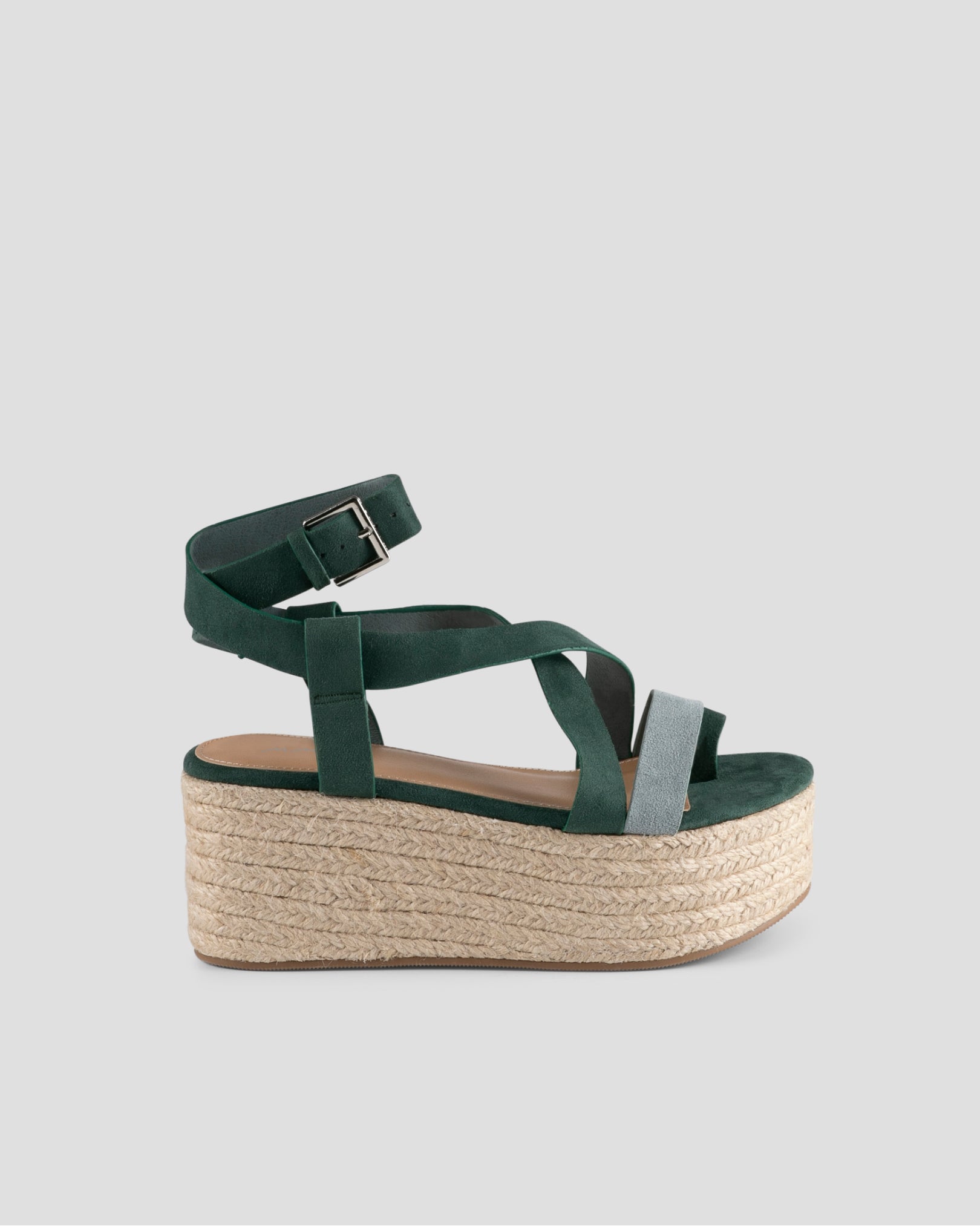 Sandales à larges brides tons aigue-marine en daim vegan avec plateforme en sparte.