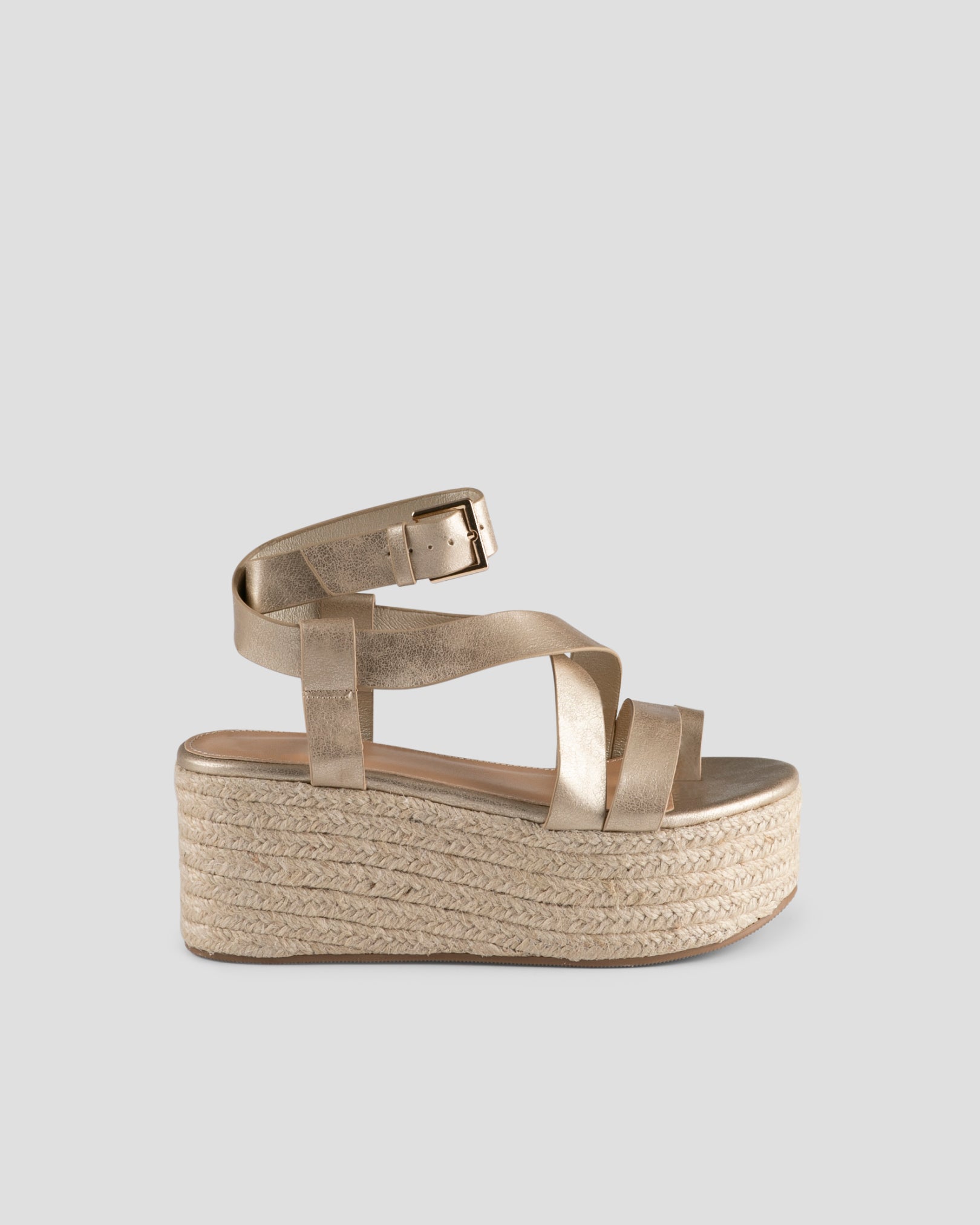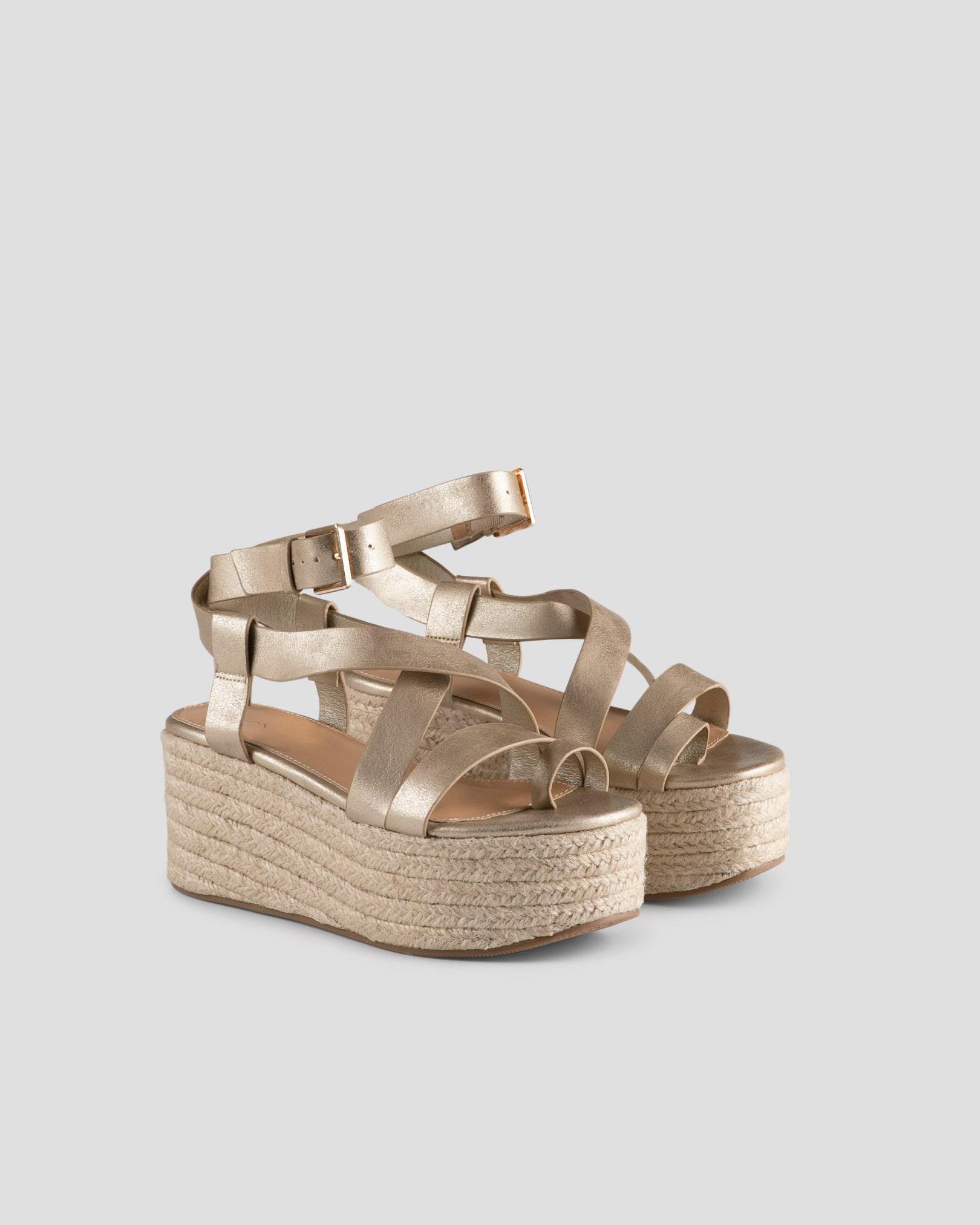 Sandales à larges brides en cuir vegan doré avec plateforme en herbe d'alfa.