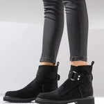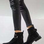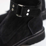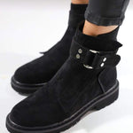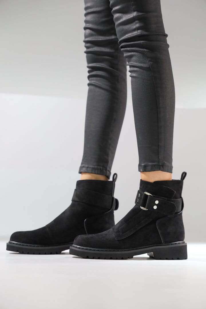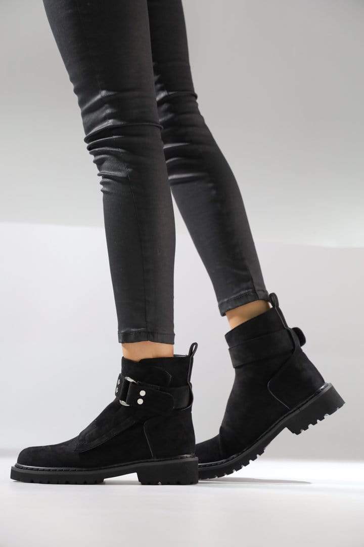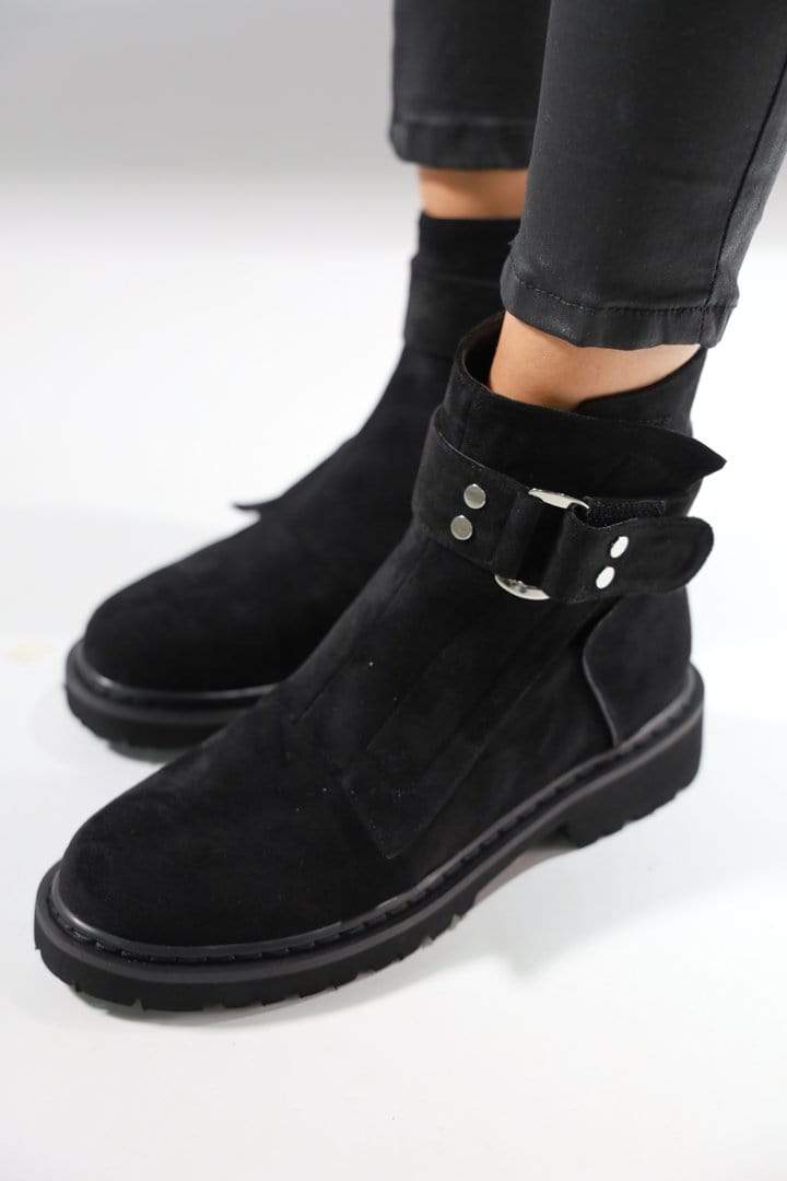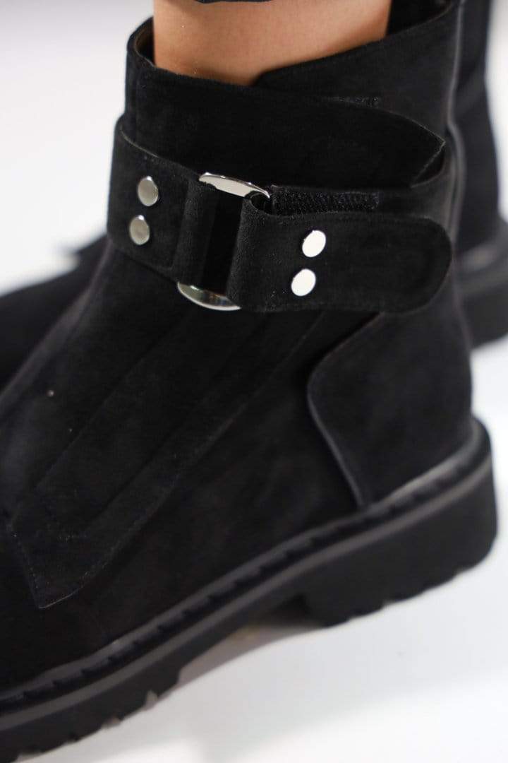 Bottine en daim vegan noir. Fermeture velcro, créant un petit rabat sur un côté de la botte. De plus, il se compose d'une sangle autour de la cheville avec velcro pour la fermeture avec une boucle métallique carrée.