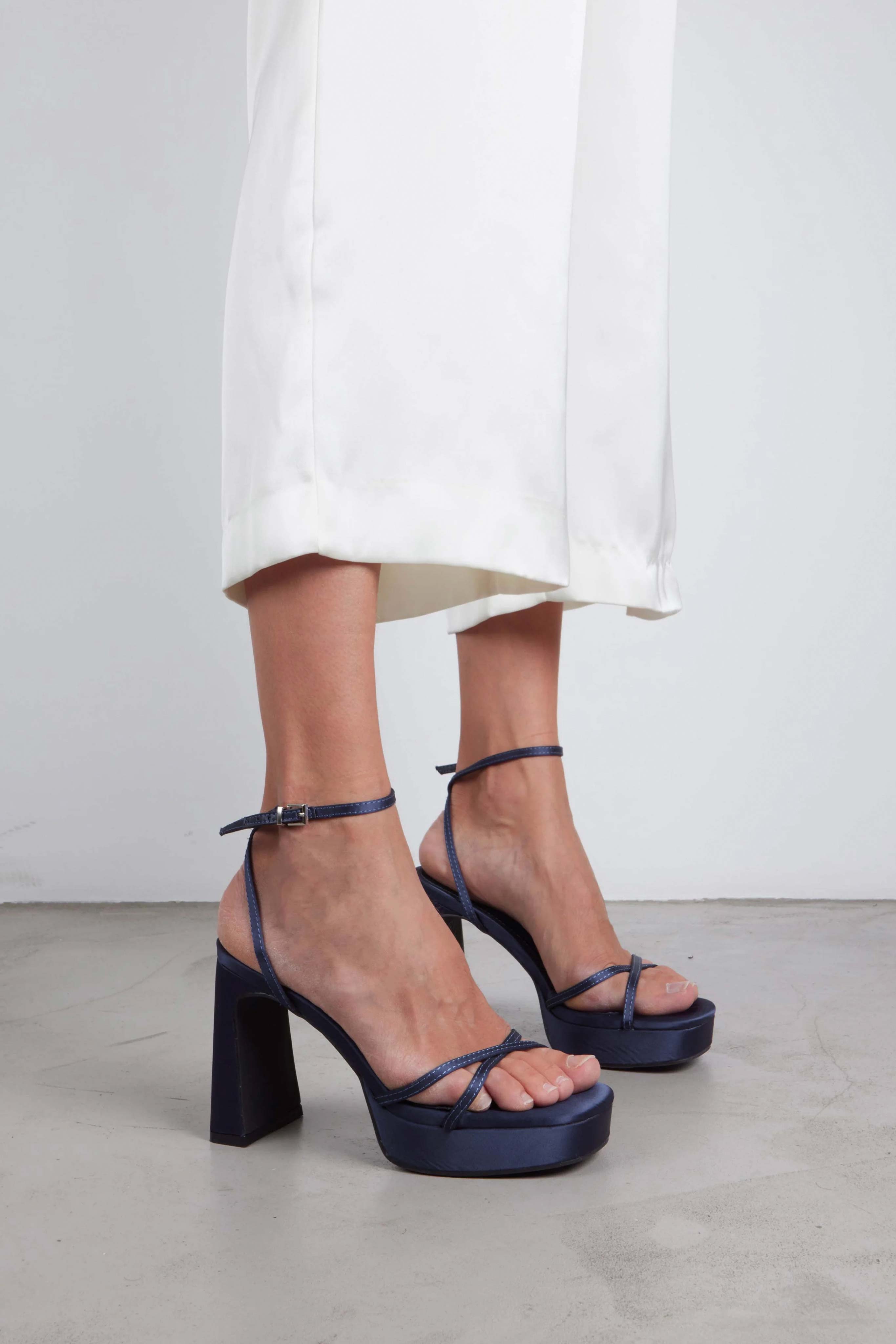 Sandale à talon et plateforme en satin bleu marine. Ouvert sur le devant avec brides et talon rectangulaire. Fermeture du bracelet de cheville avec boucle en métal.