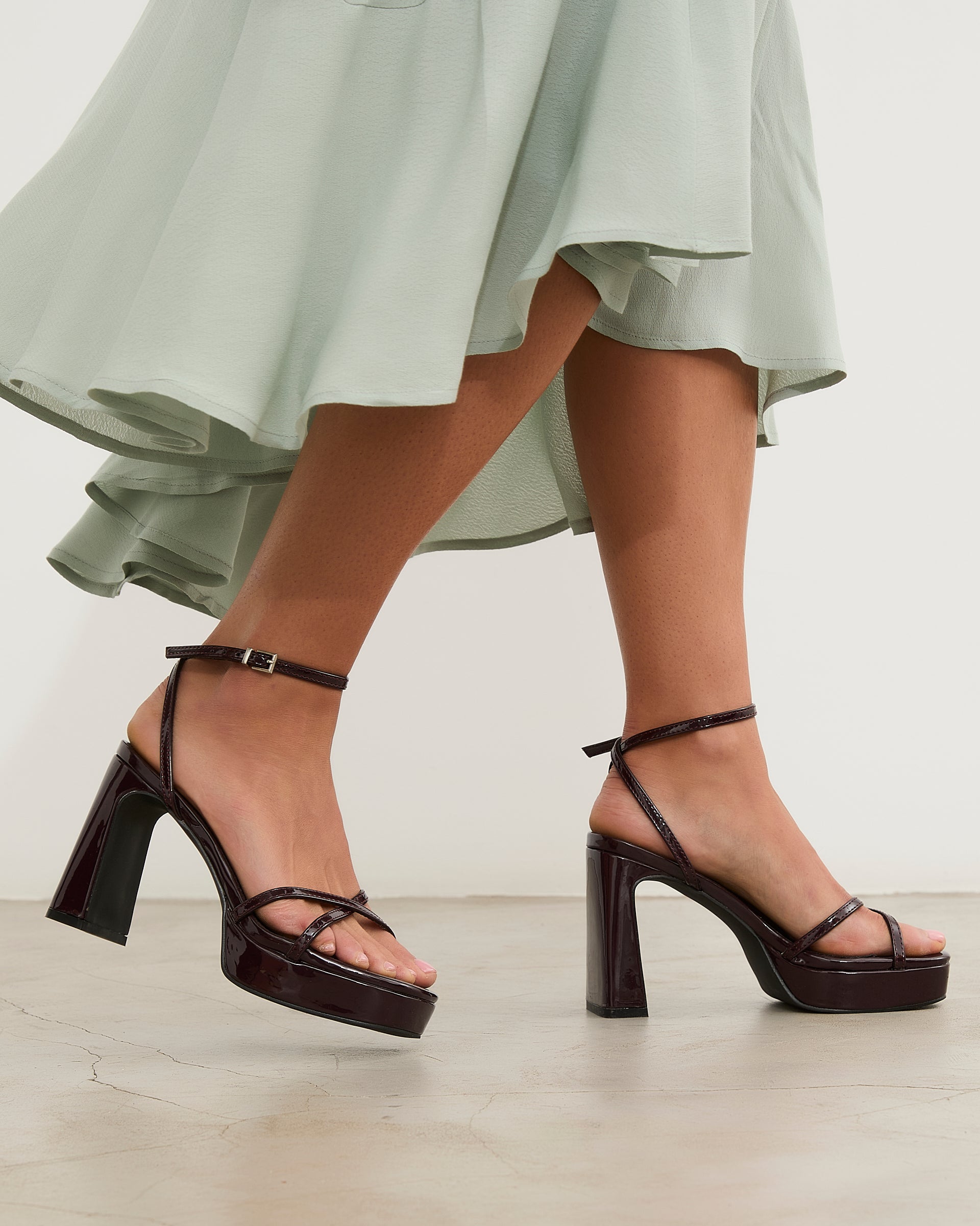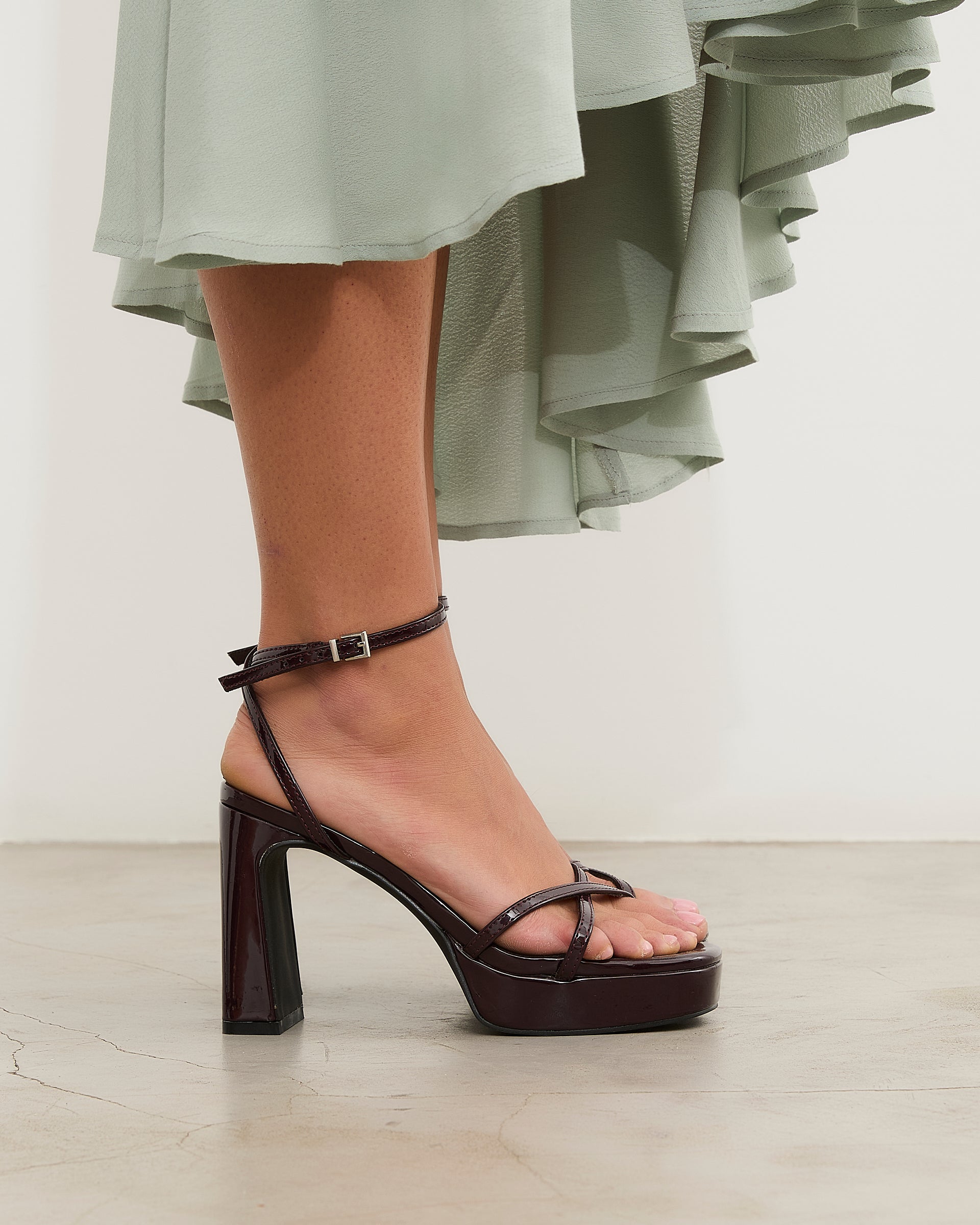 Sandale à talon plateforme en daim vegan bordeaux avec brides à l'avant. Fermeture à la cheville avec boucle.