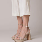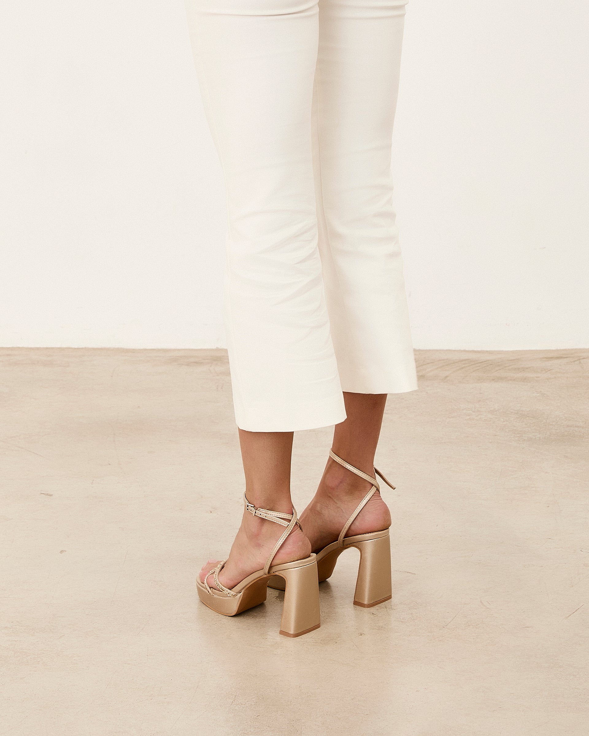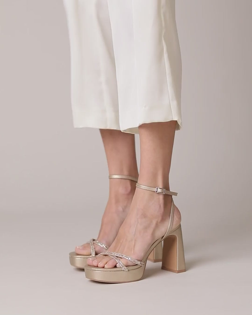 Sandale à talon plateforme en cuir vegan doré avec brides sur le devant avec paillettes. Fermeture à la cheville avec boucle.