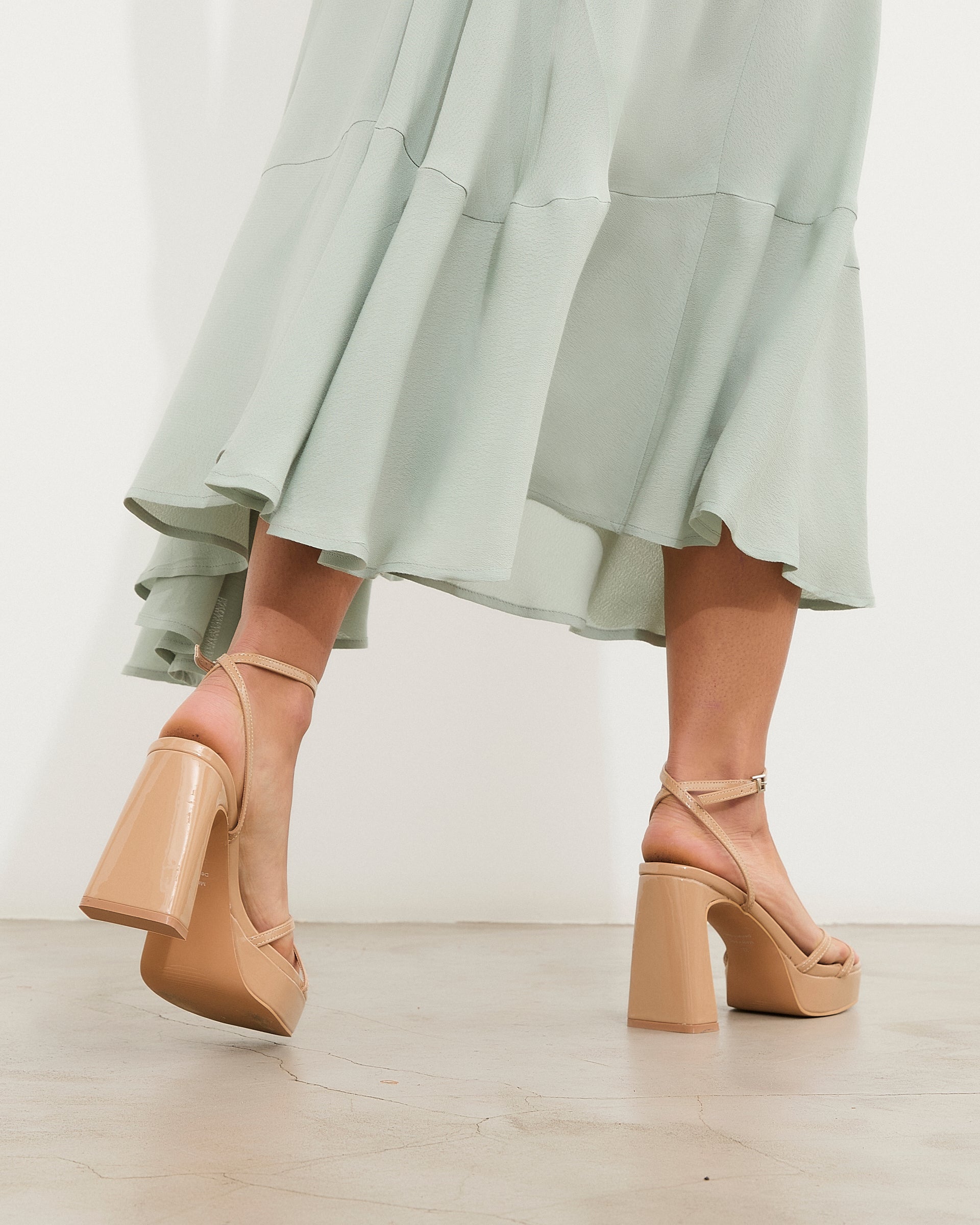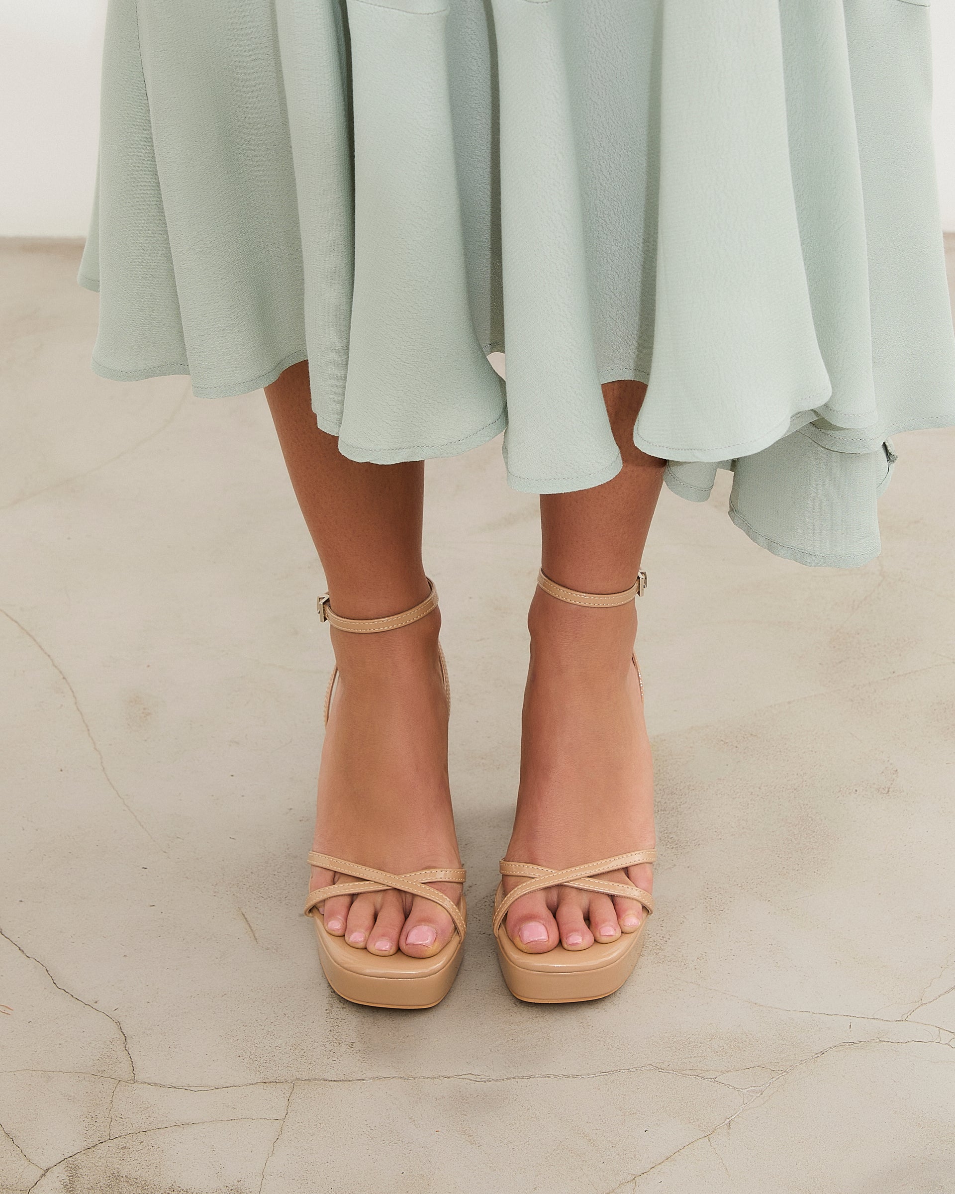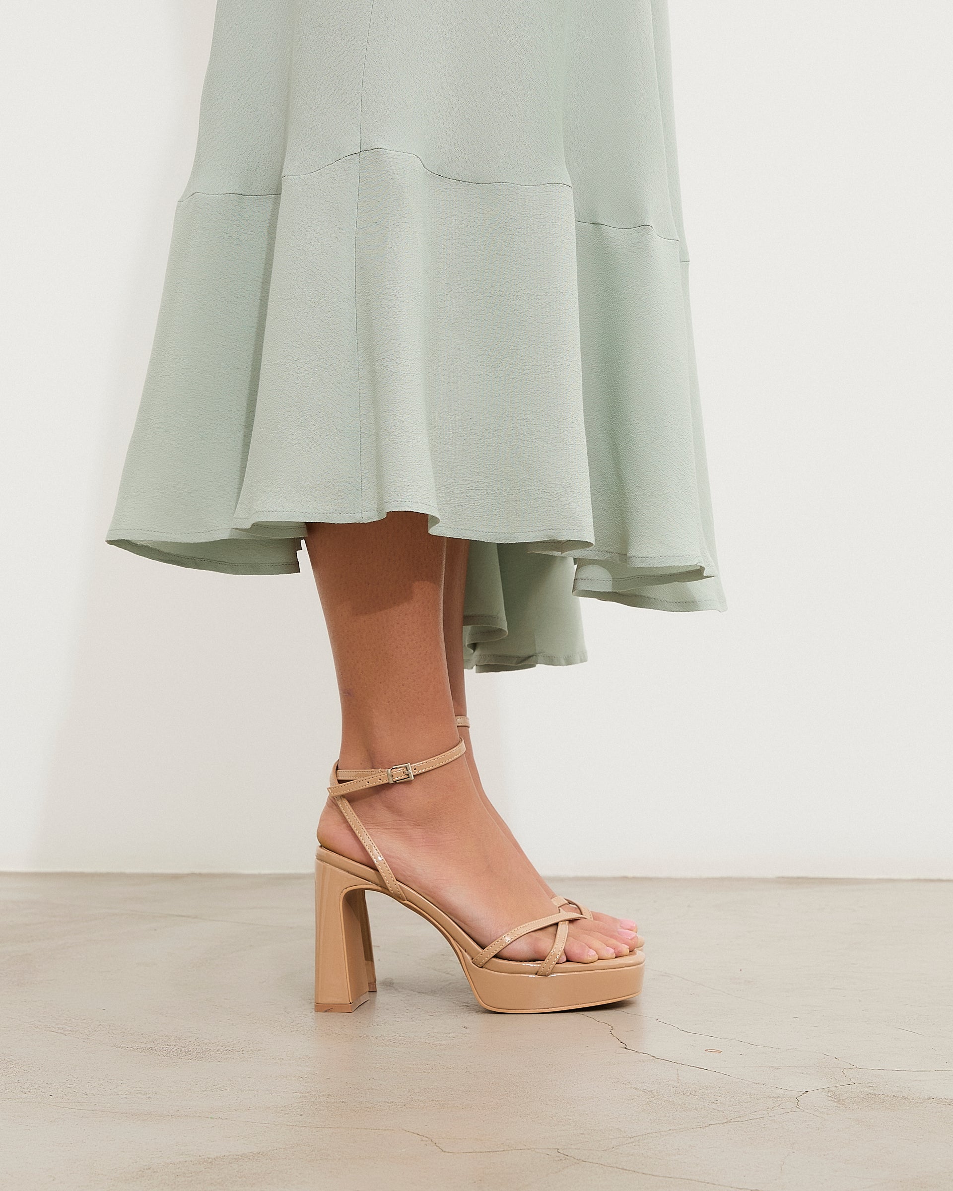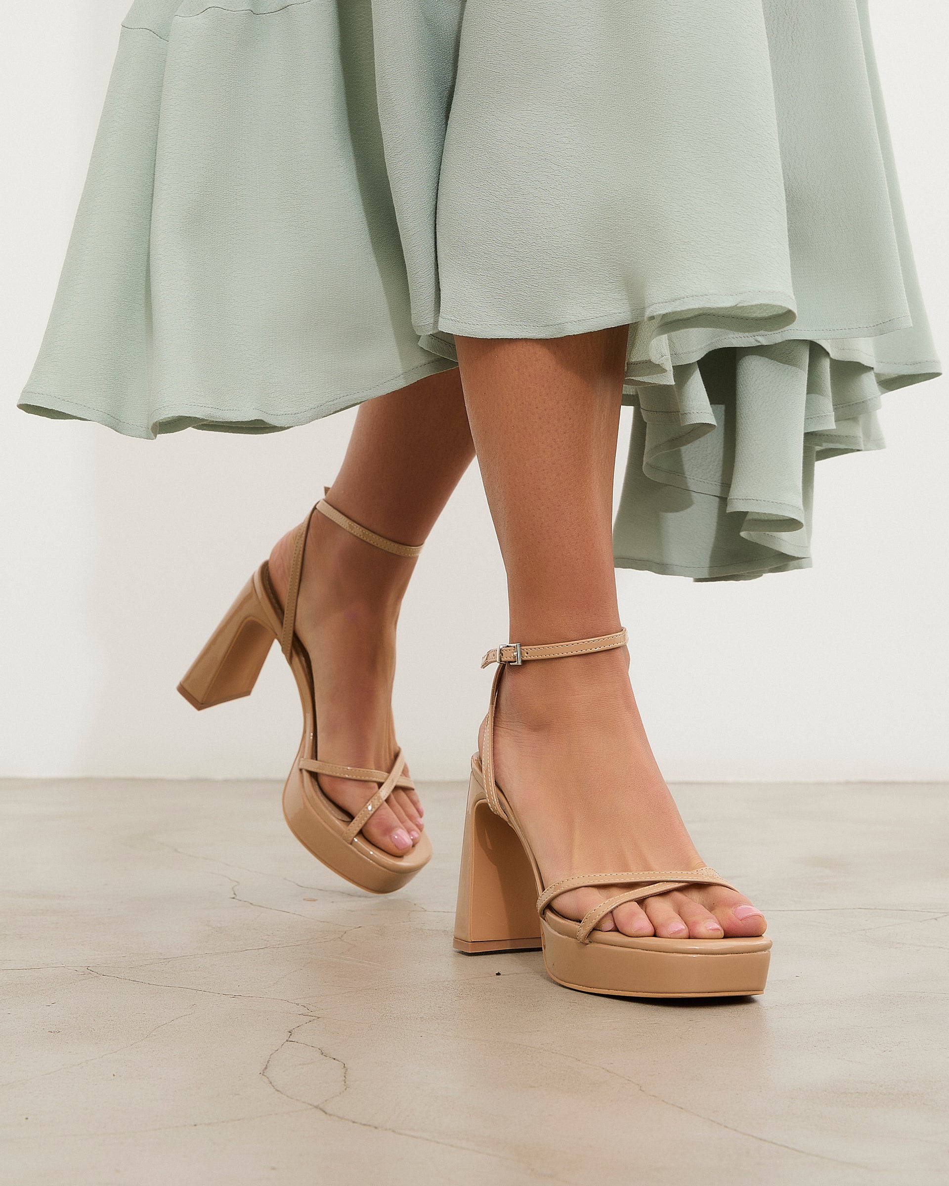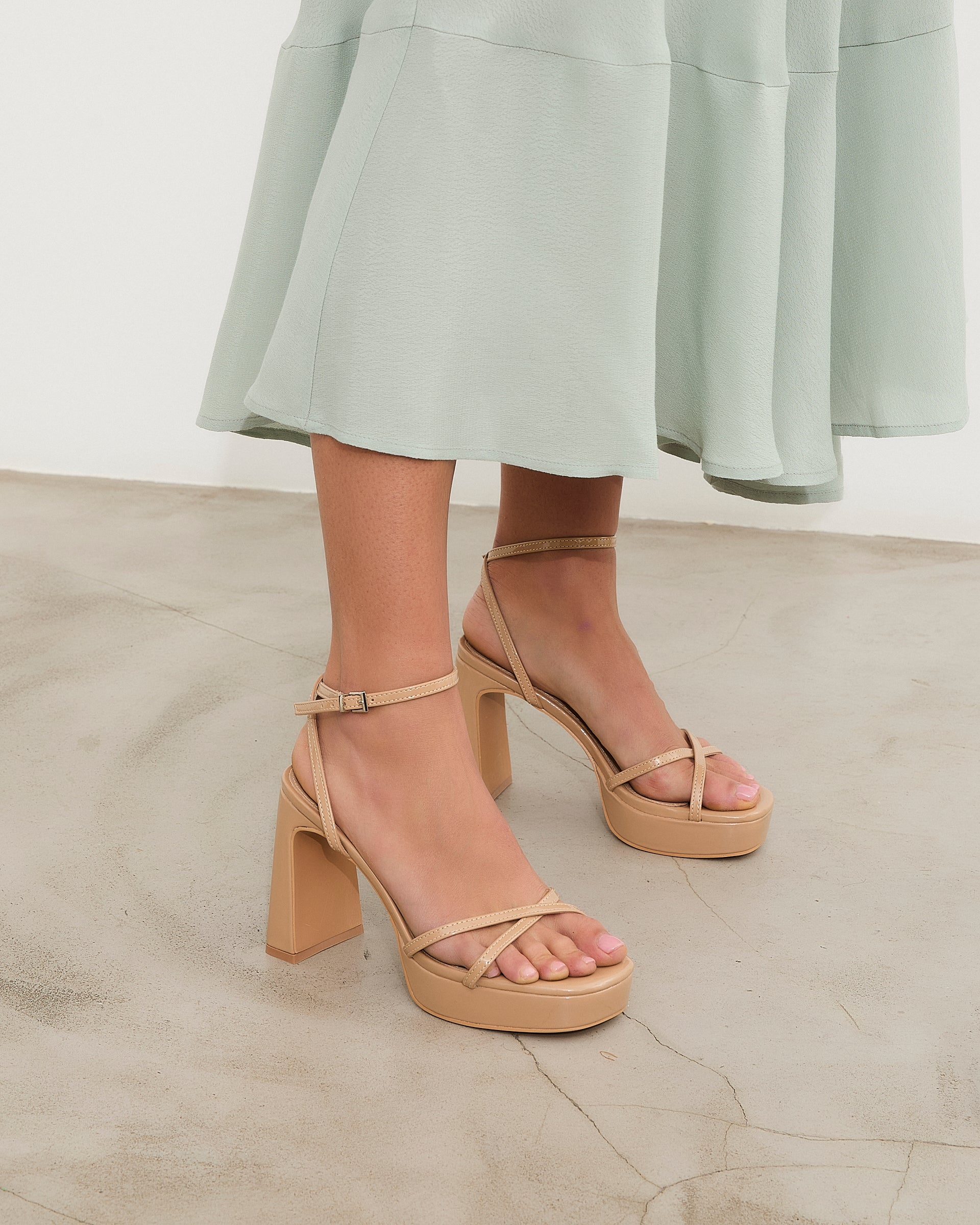 Tacón de plataforma en charol nude. Dos tiras finas frontales cruzadas y dos tiras finas para sujeción en tobillo y cierre con hebilla.