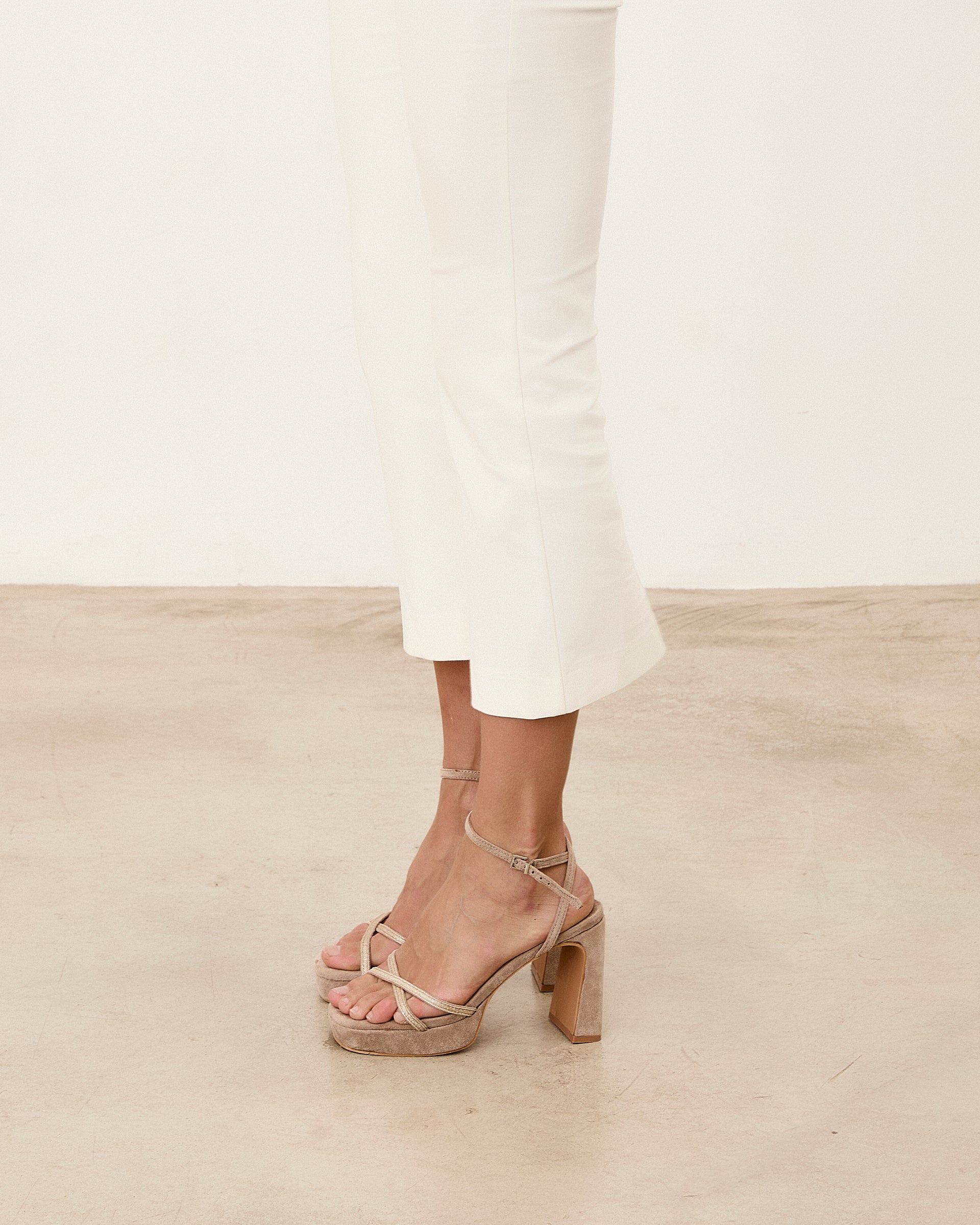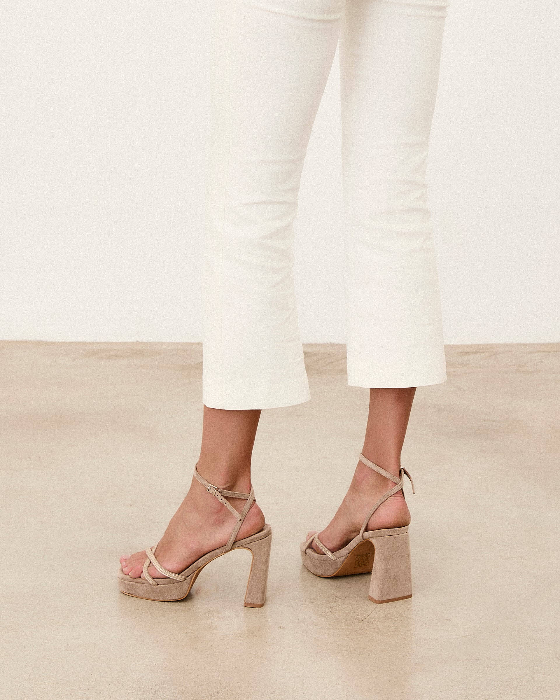 Sandale à talon plateforme en daim vegan taupe avec brides à l'avant. Fermeture à la cheville avec boucle.