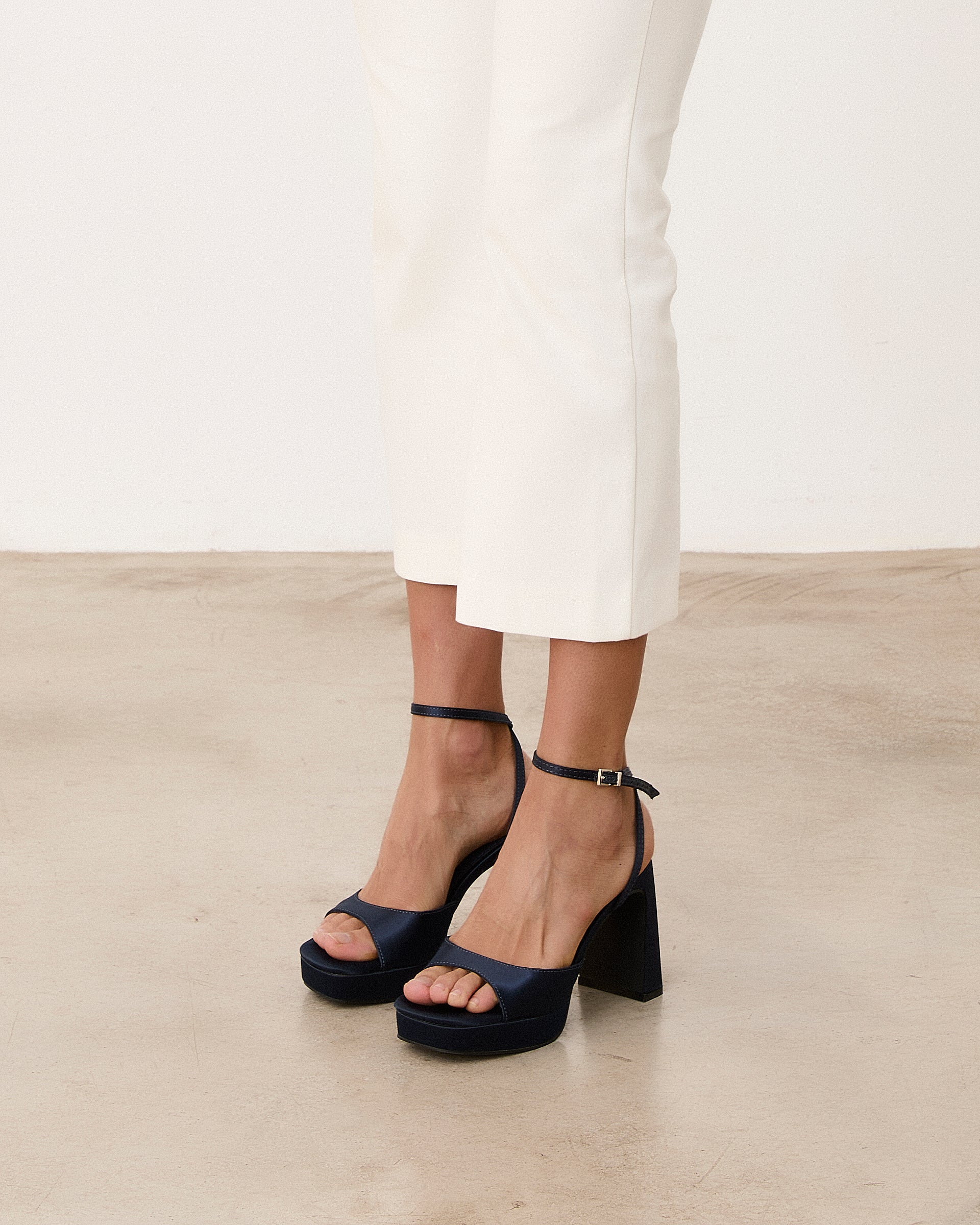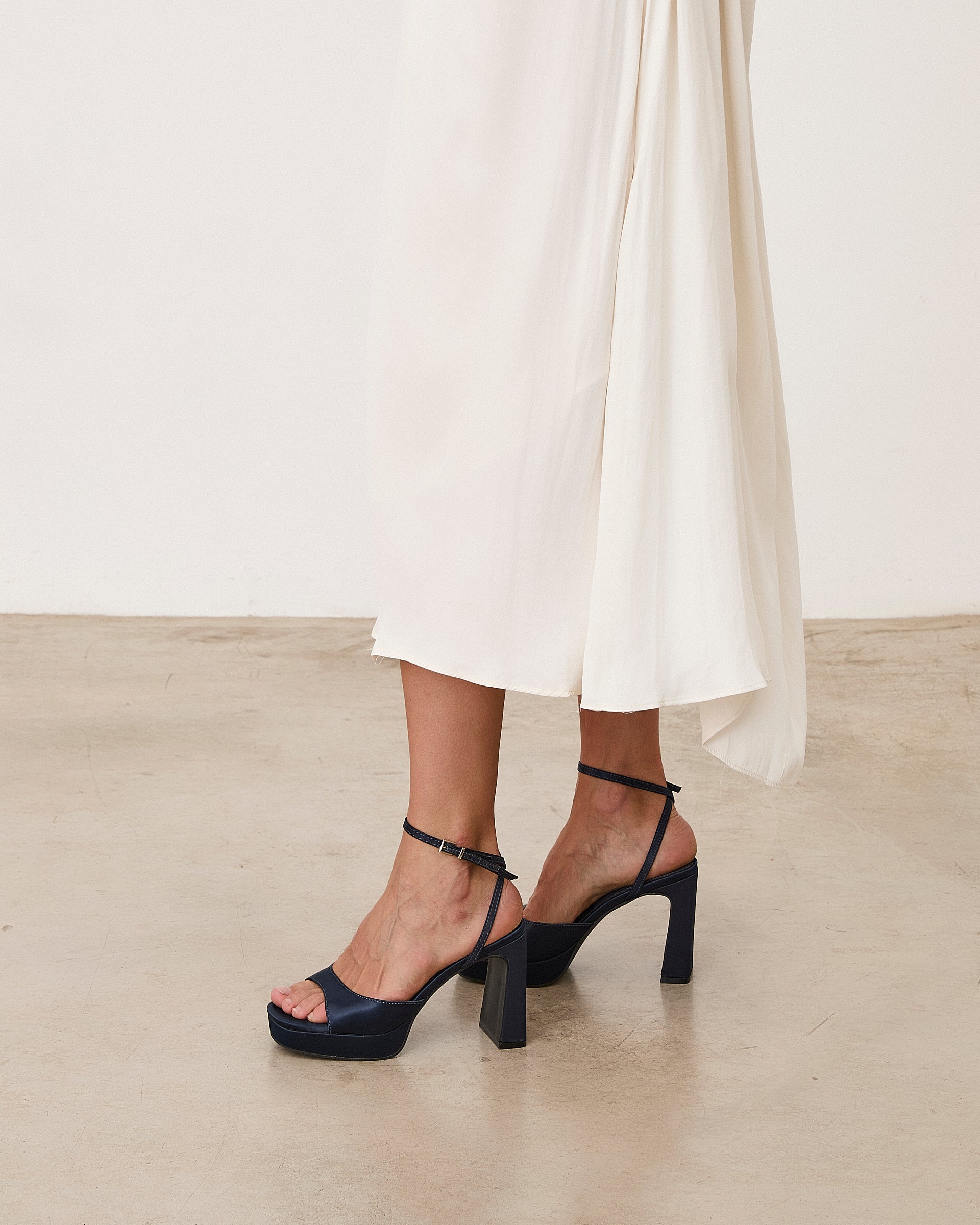 Sandalia de tacón con plataforma en color azul marino. Tira ancha en la parte frontal y cierre con pulsera al tobillo. Tacón rectangular.