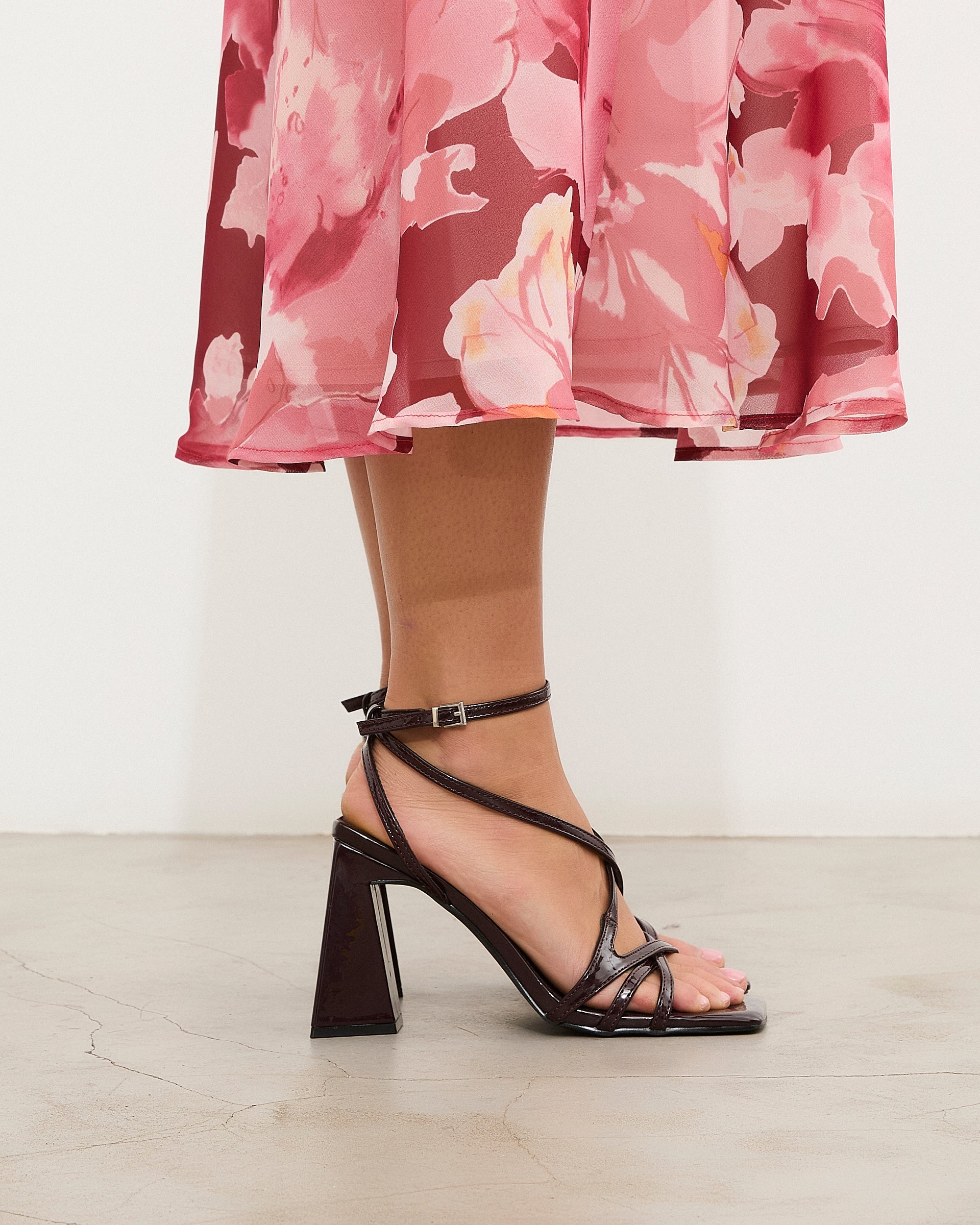 Sandalia de tacón con puntera cuadrada en color rojo. Compuesto por tiras cruzadas en el empiene con cierre en tobillo con hebilla. Tacón ancho geométrico.