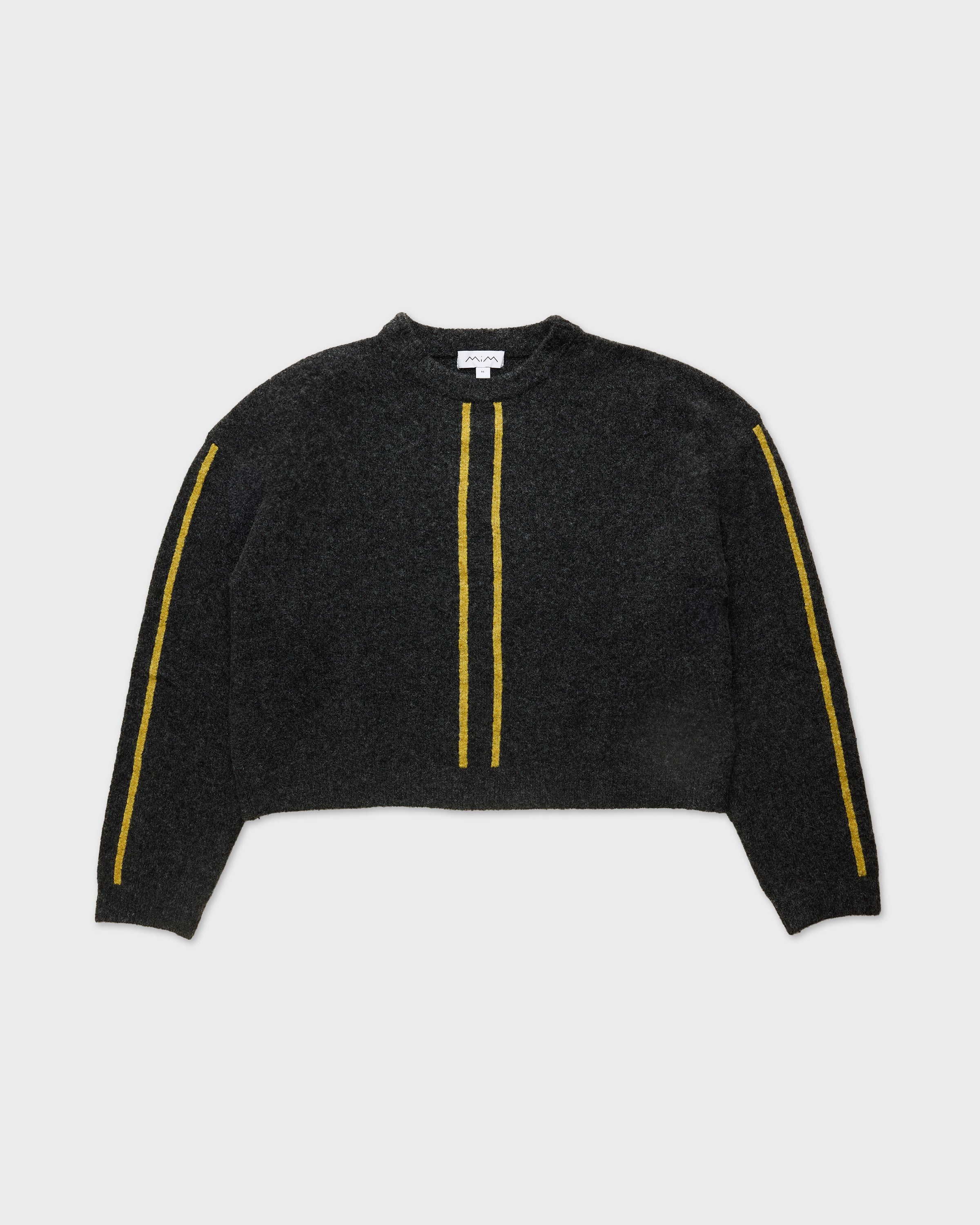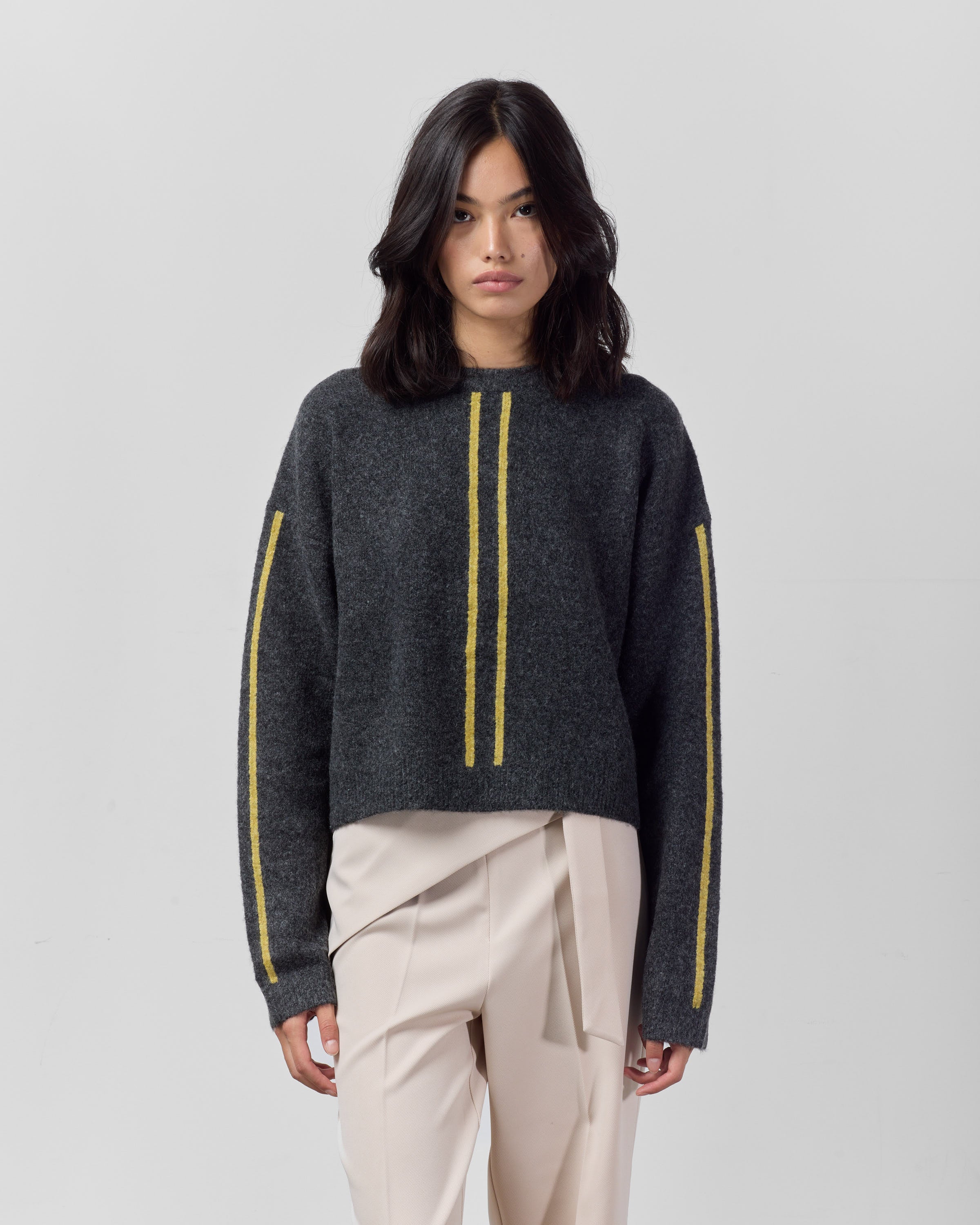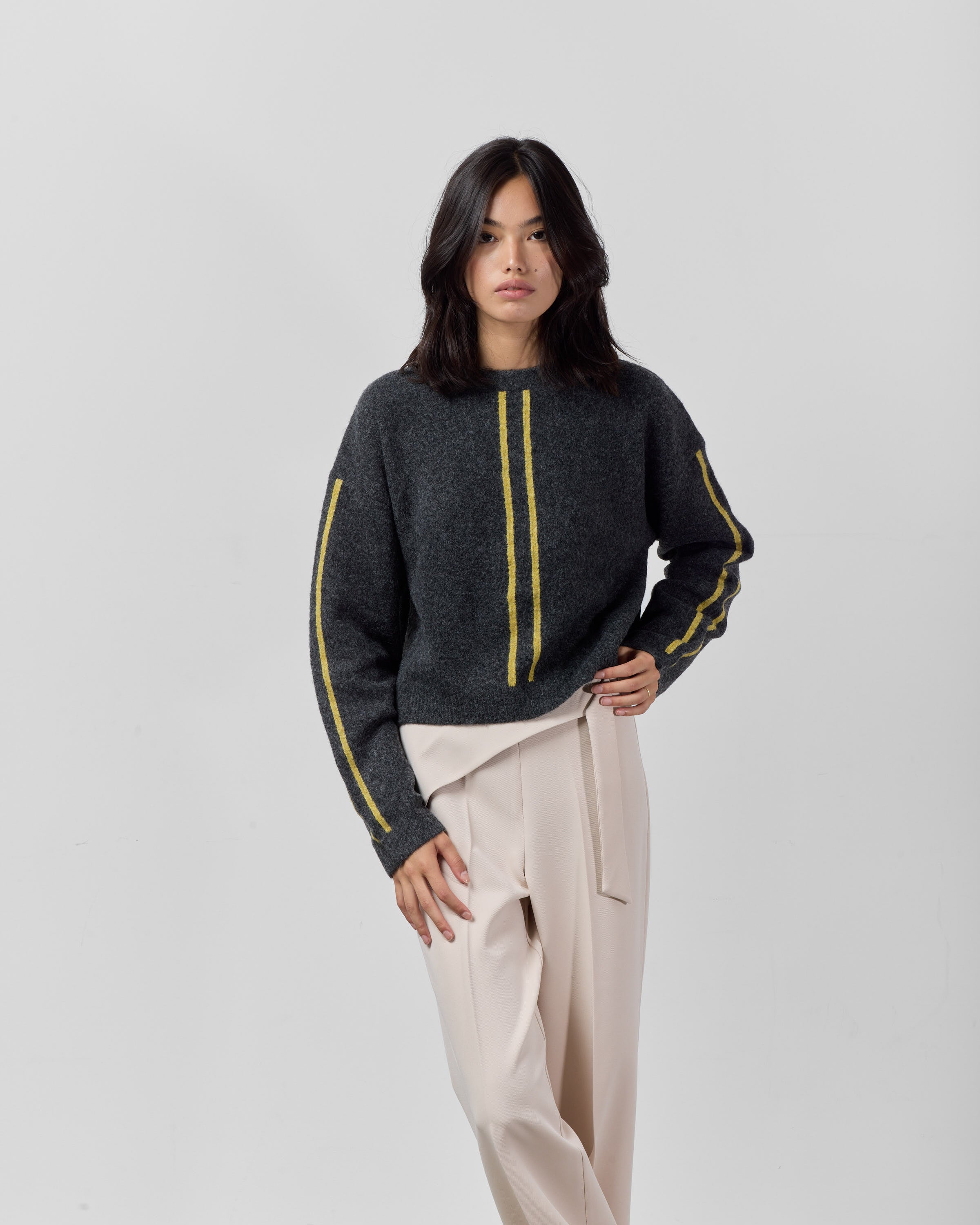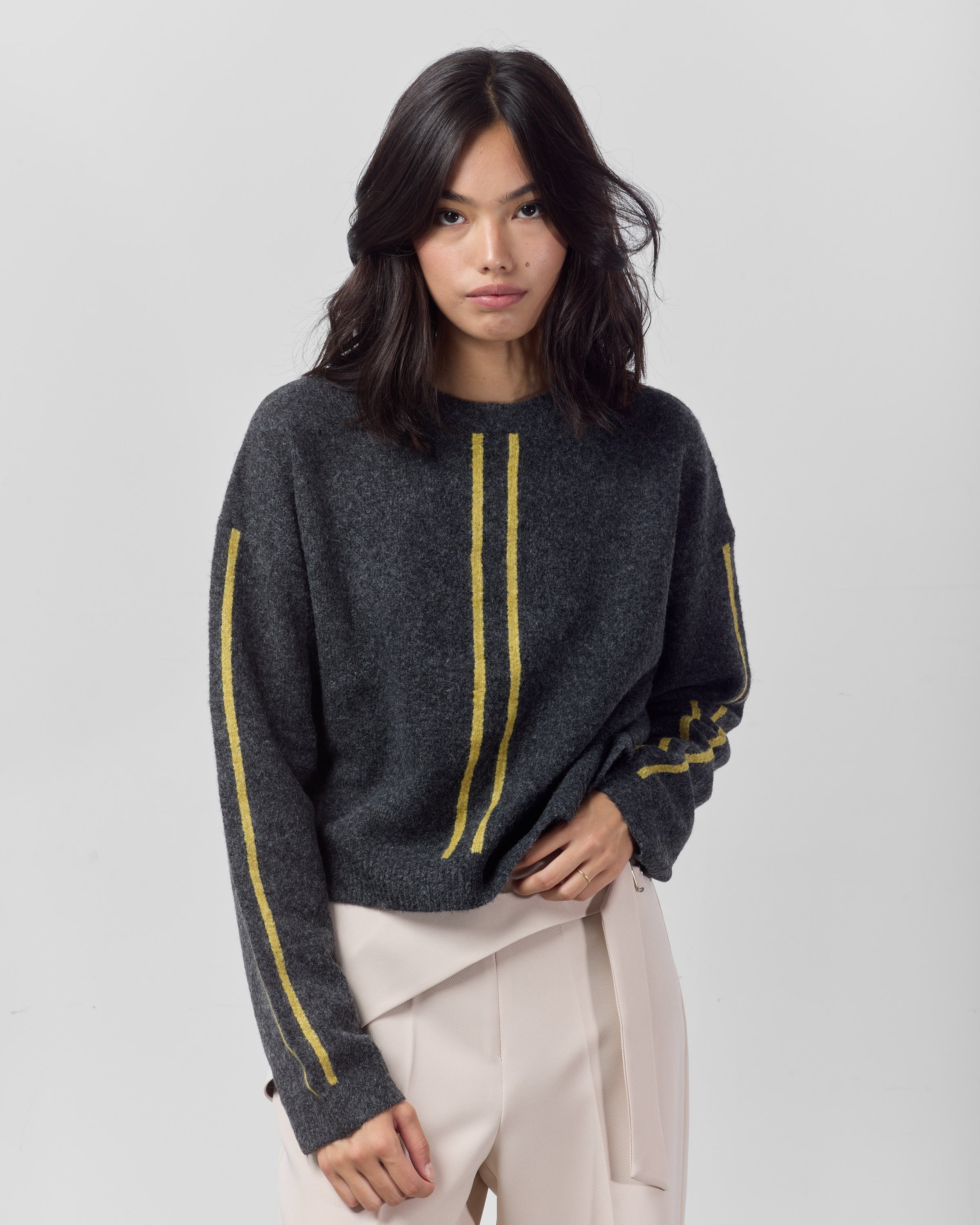Jersey de punto en color antracita. Detalles en color amarillo en la parte central y mangas.