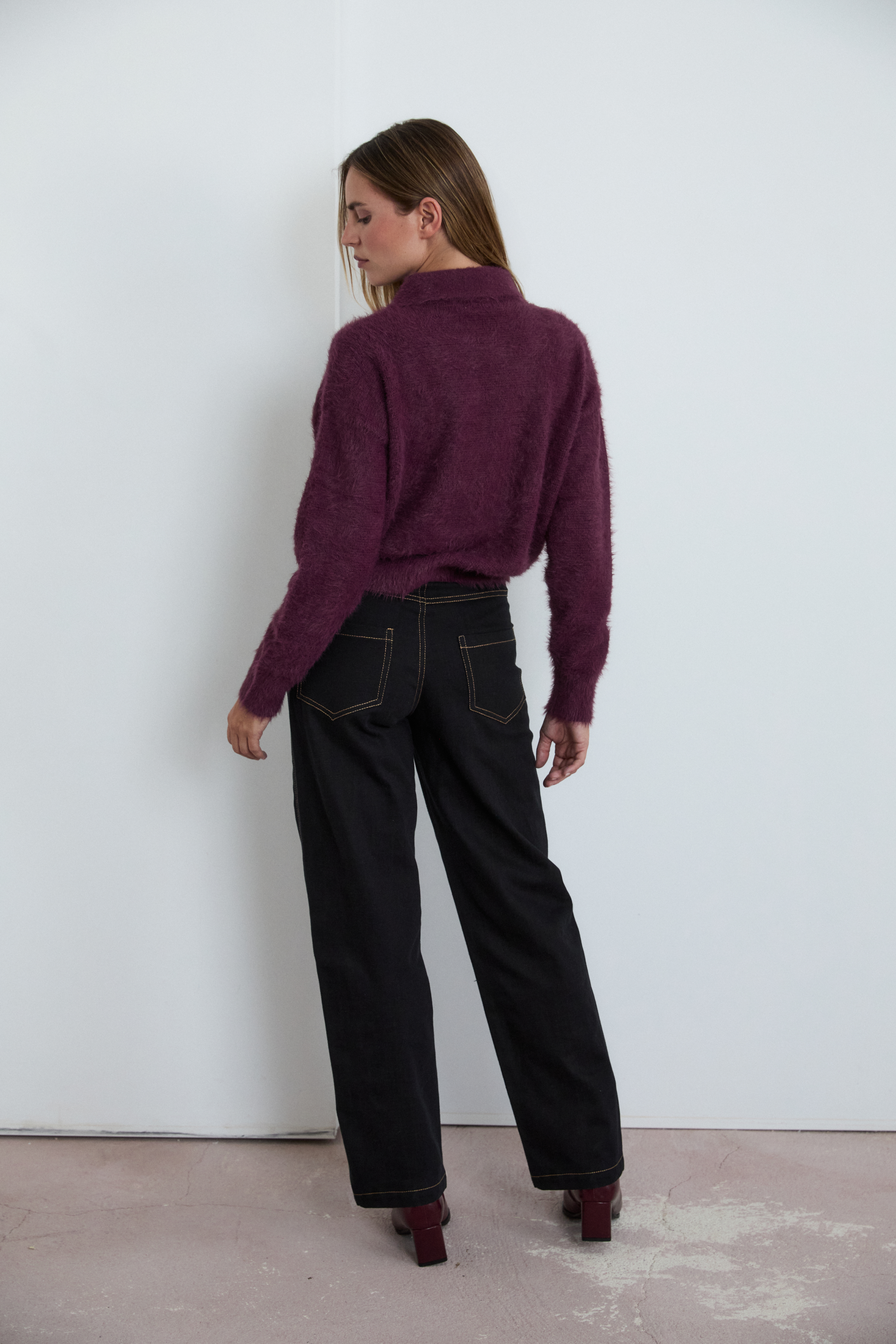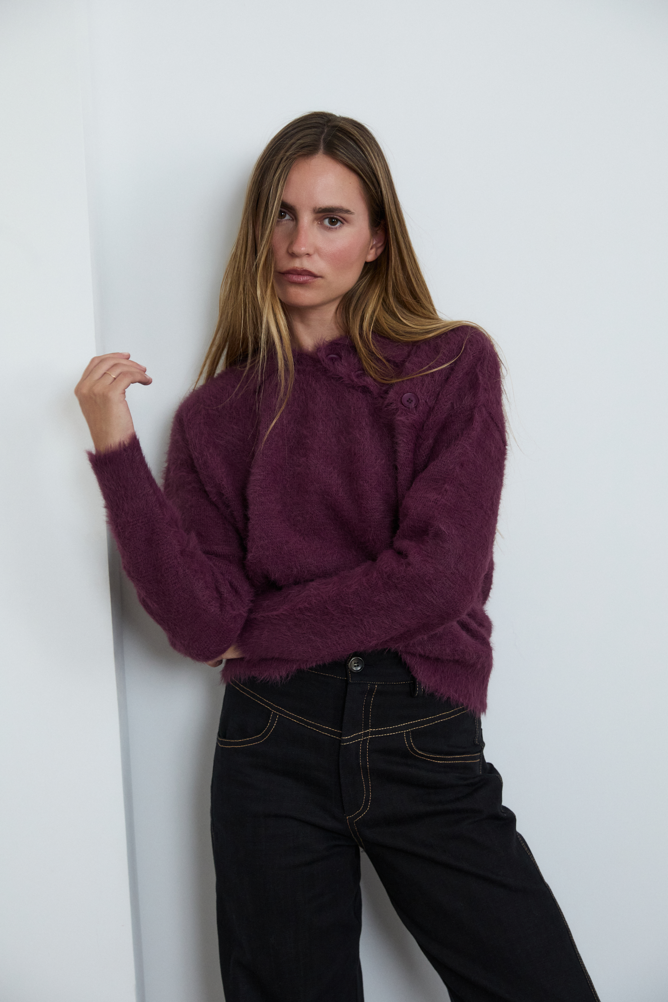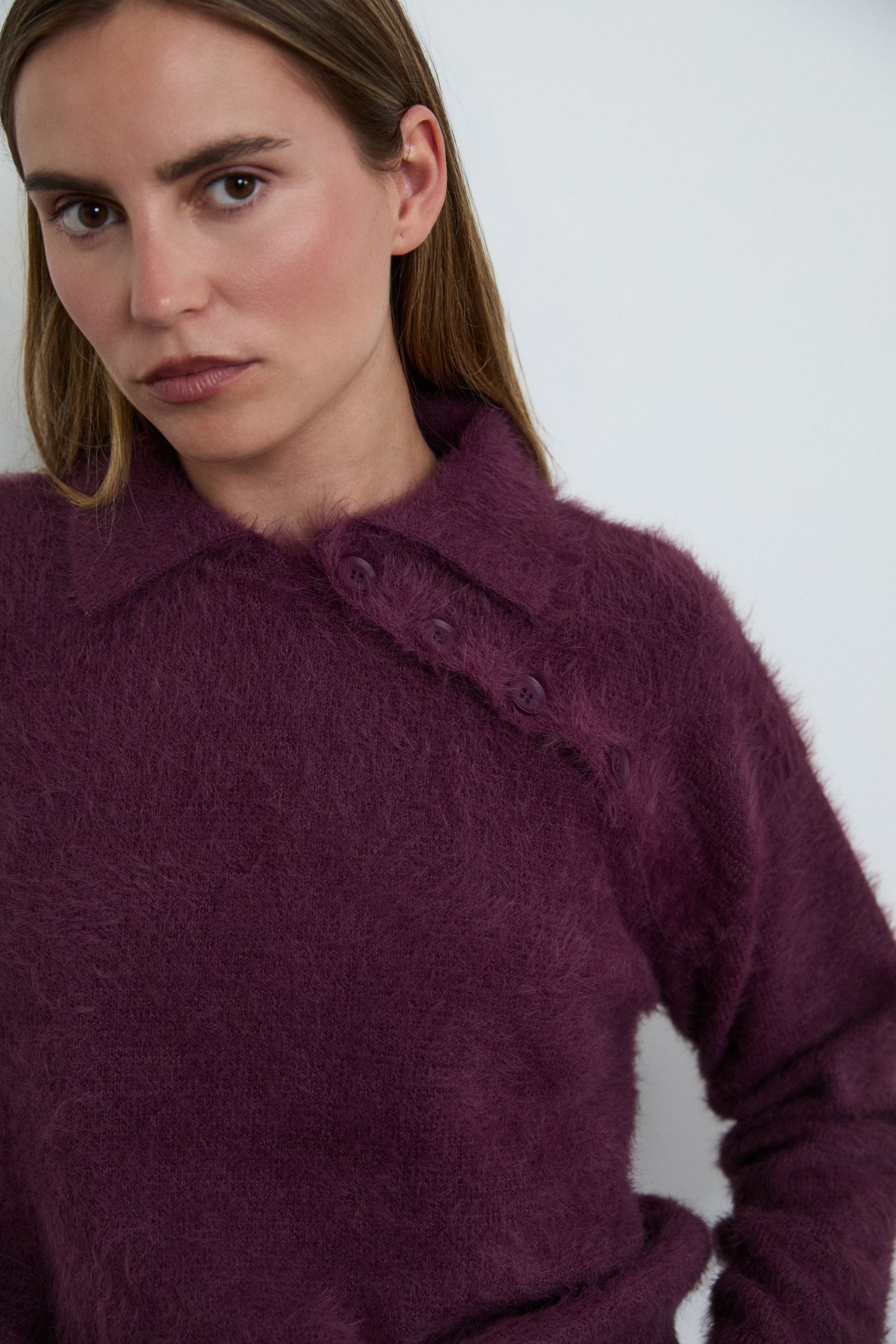 Jersey de cuello con cierre de botones asimétrico en tejido de punto efecto de pelo en color berenjena.Ajuste en la cintura.