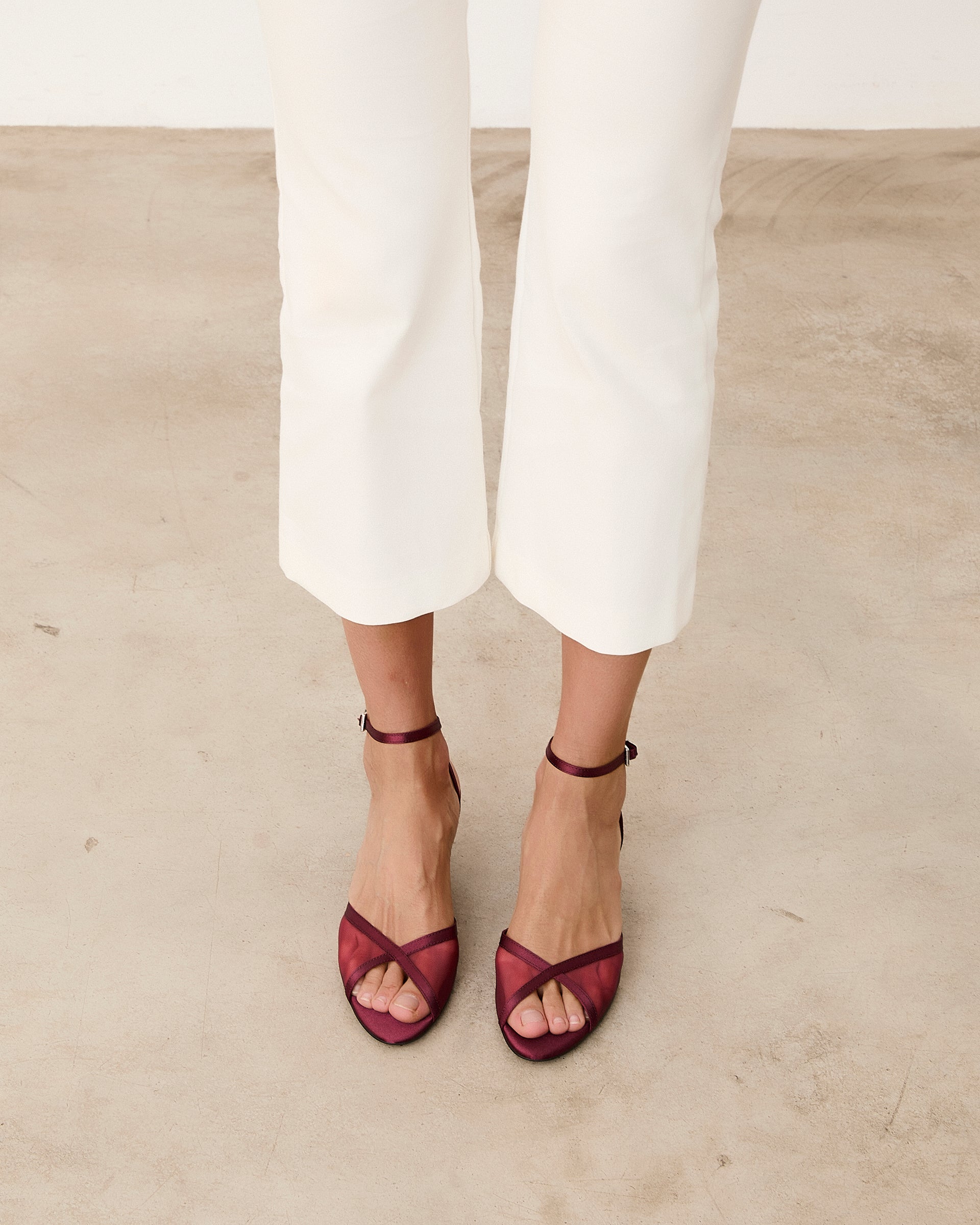 Sandalia de tacón con puntera redondeada y tacón bajo de aguja con base cuadrada en color burdeos. Parte delantera semi-abierta con detalle de transparencia. Pulsera al tobillo para el cierre.