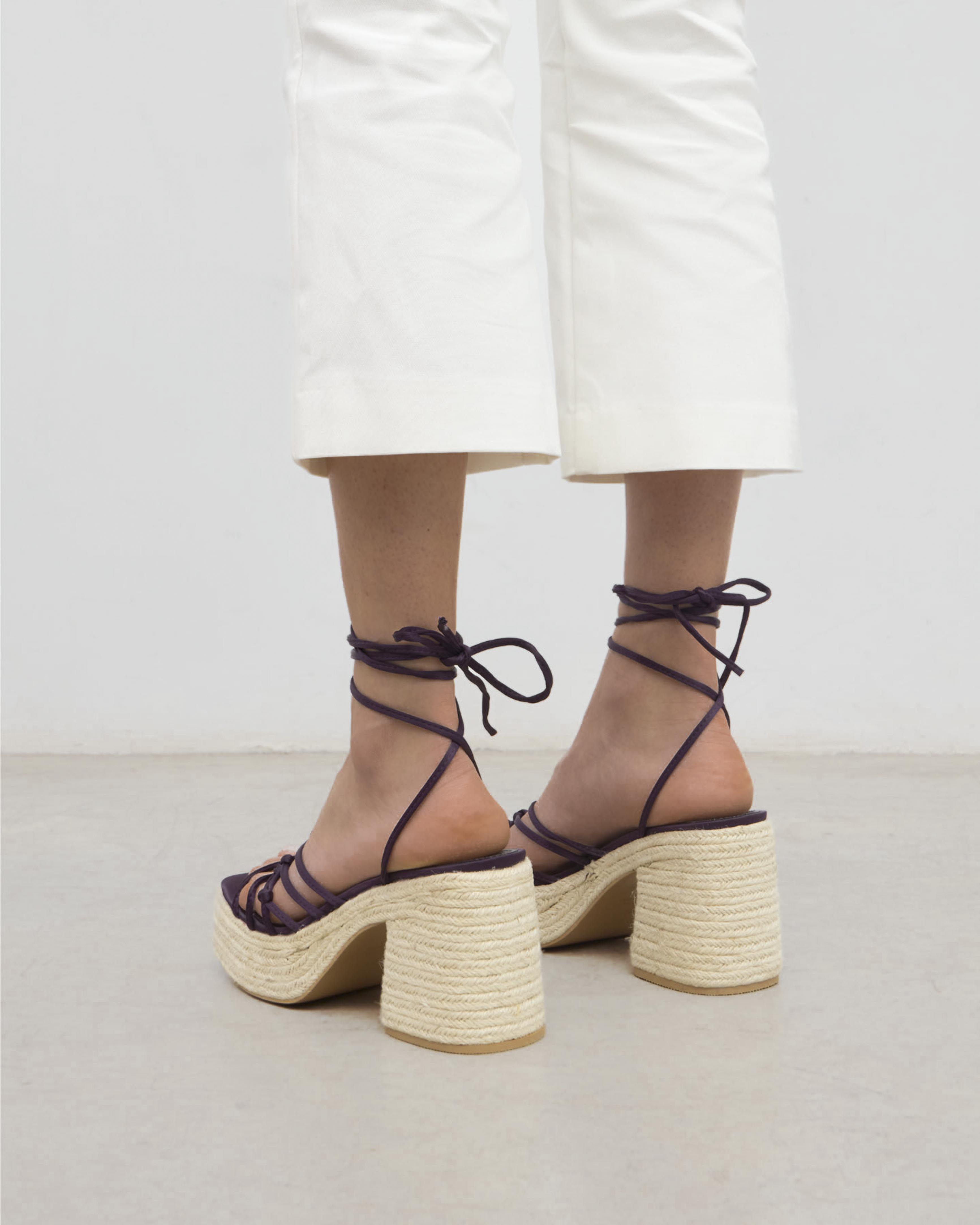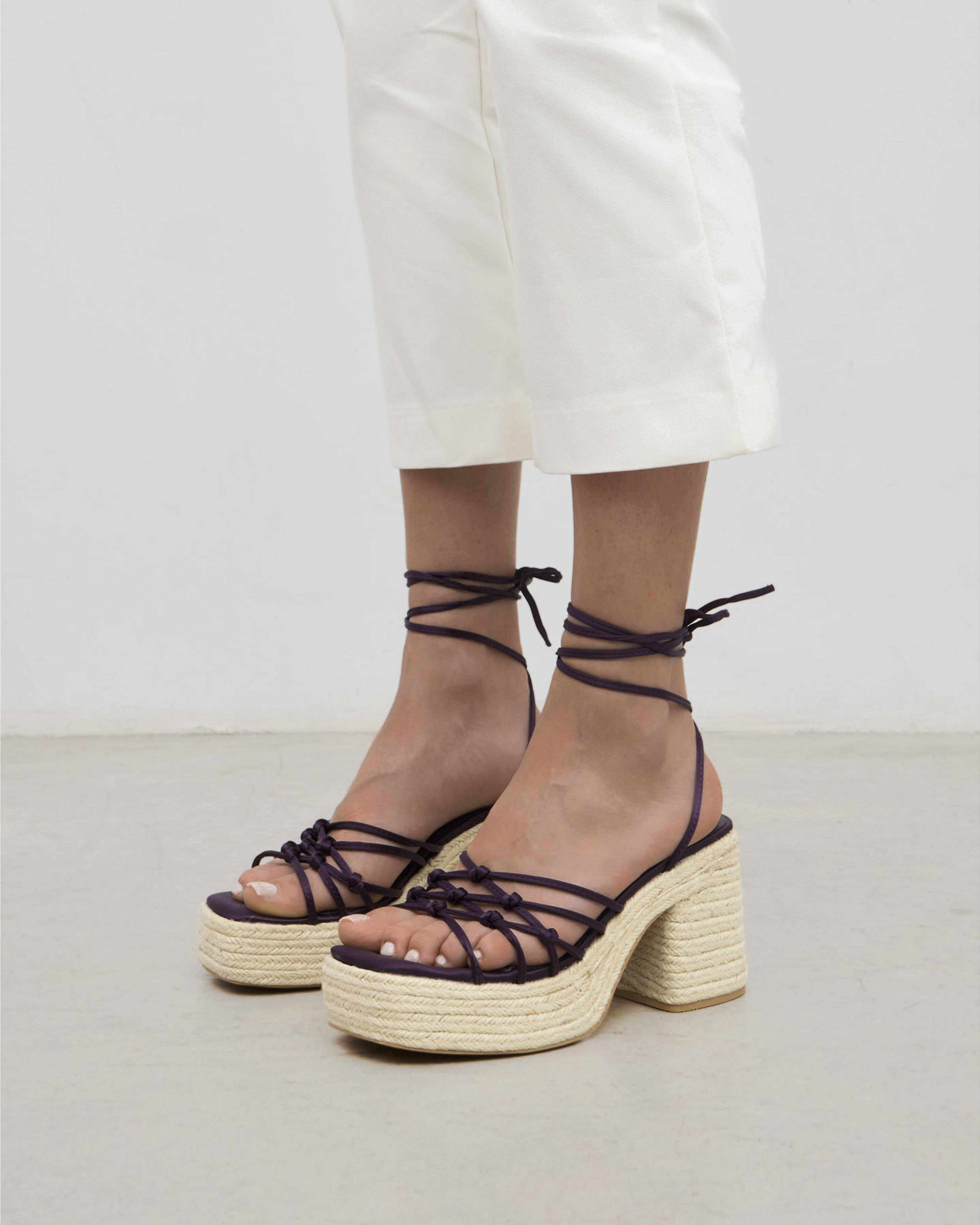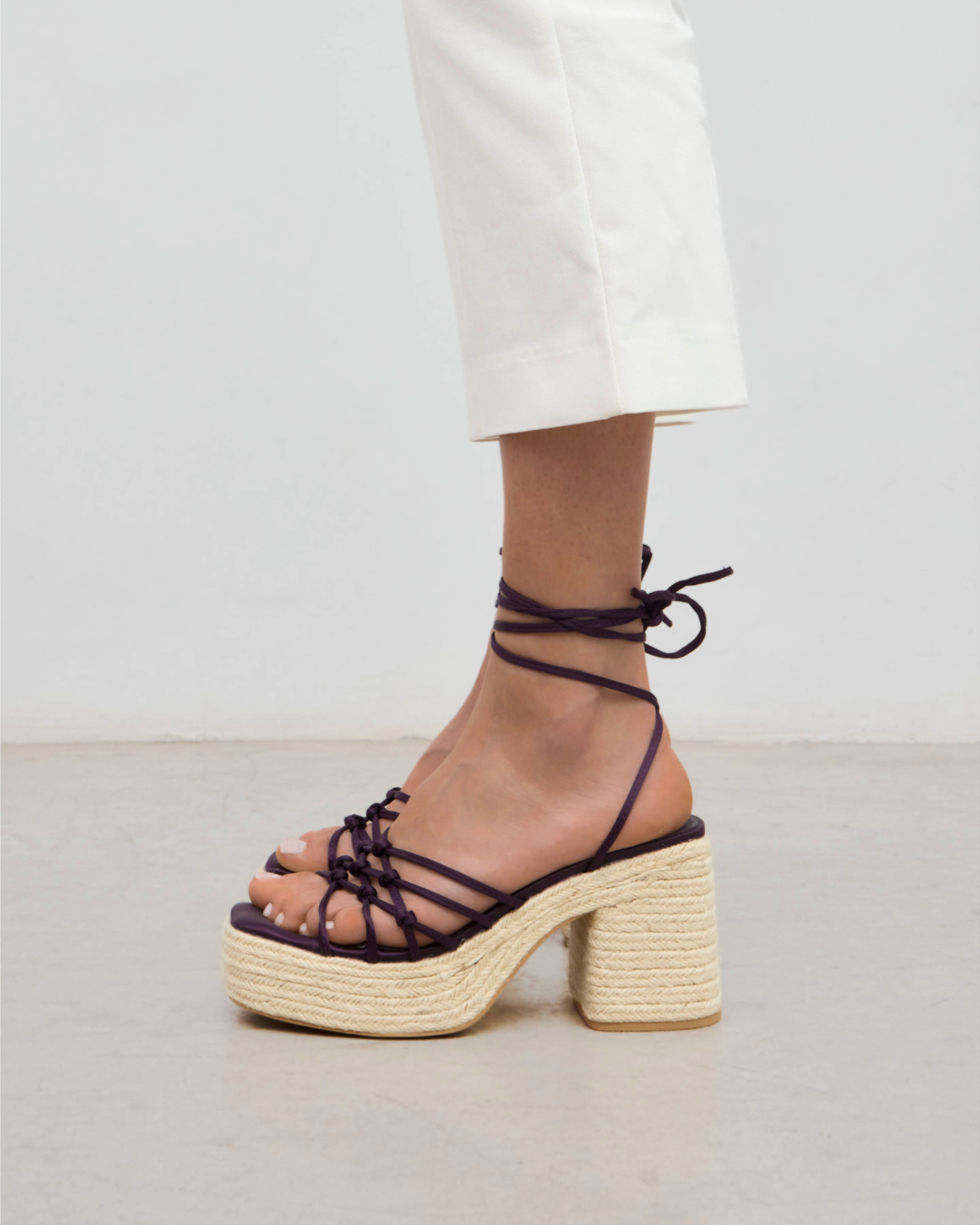 Sandalia de tacón de esparto con plataforma en satín color morado. Parte delantera con tiras anudadas. Cierre con tiras al tobillo.