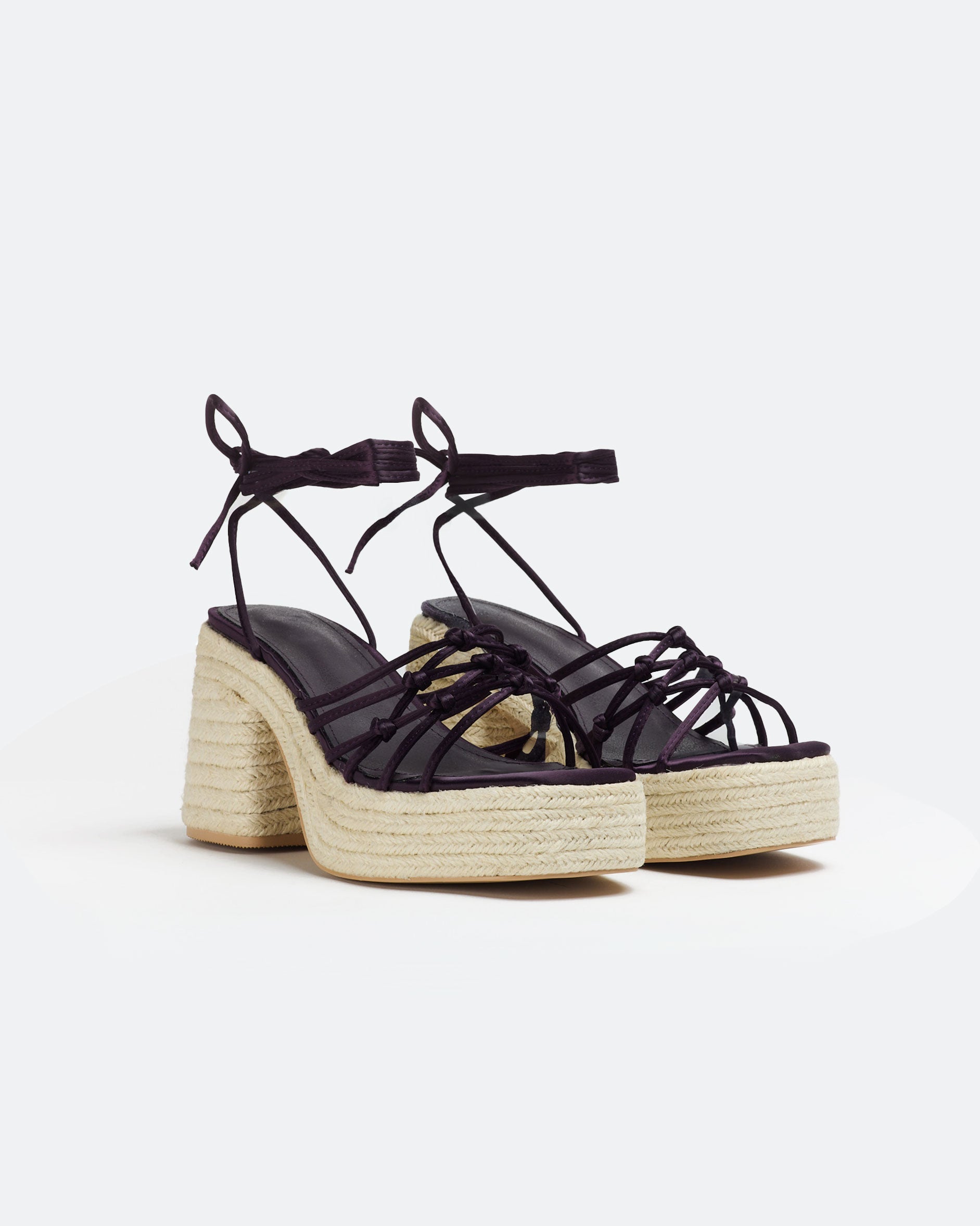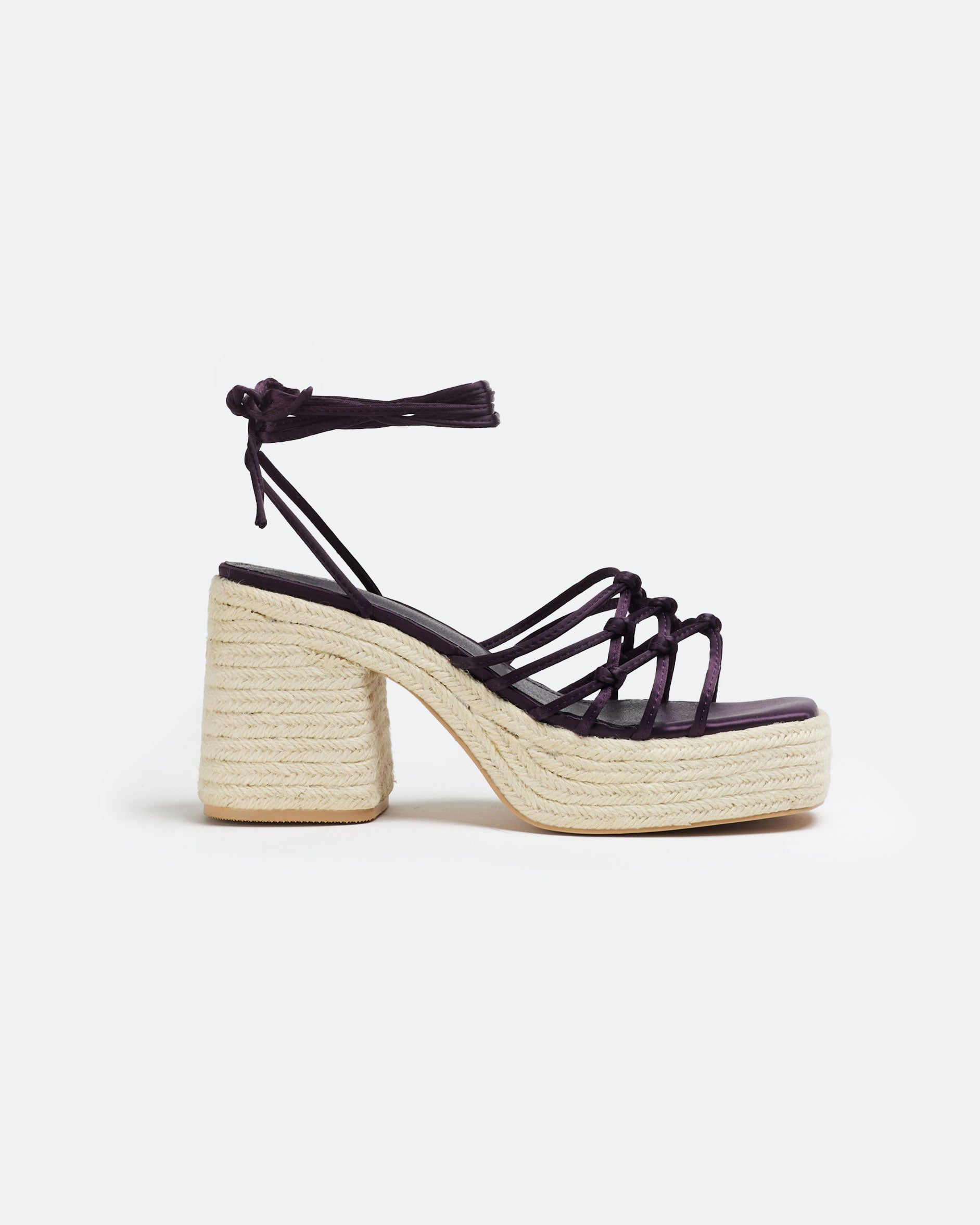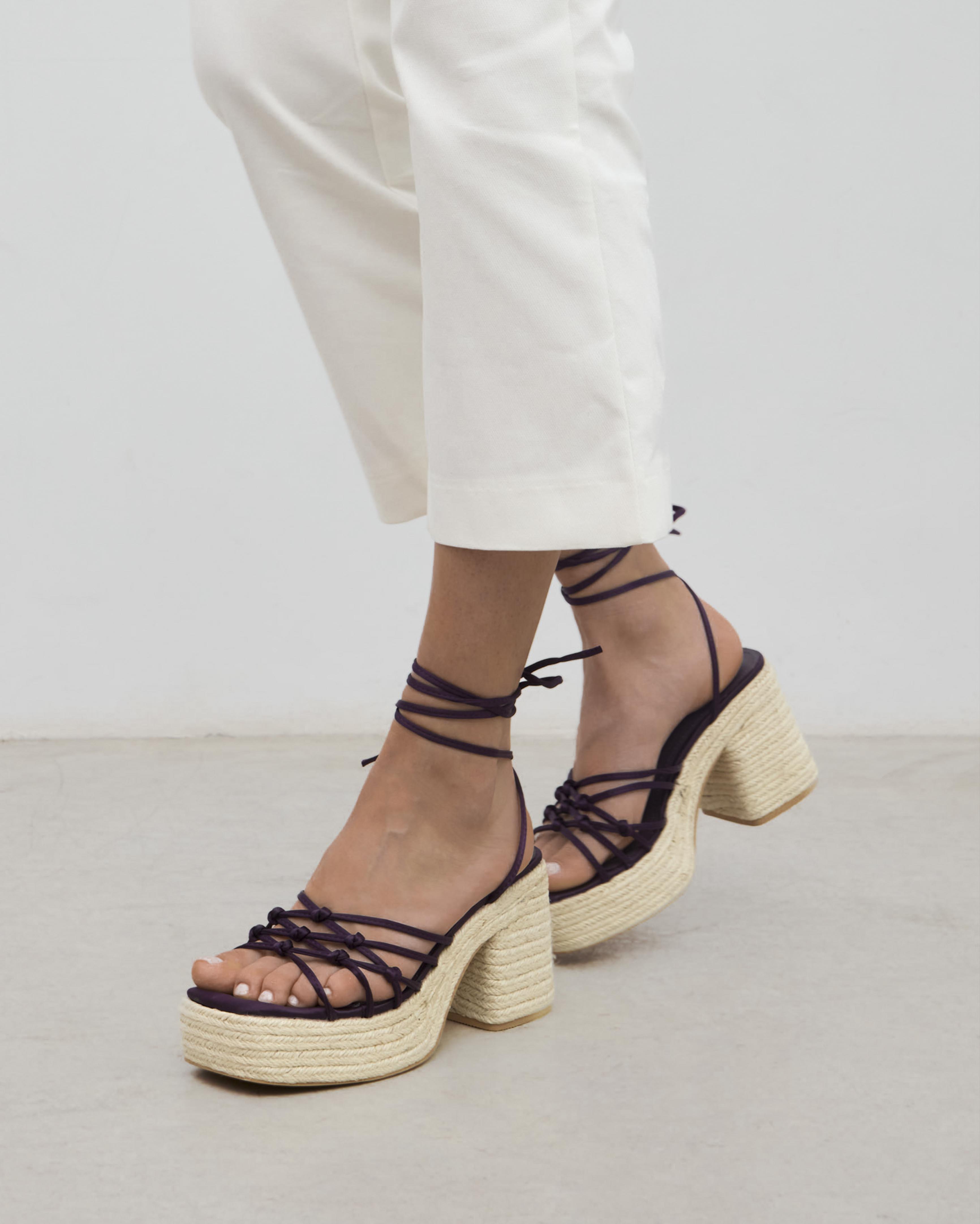 Sandalia de tacón de esparto con plataforma en satín color morado. Parte delantera con tiras anudadas. Cierre con tiras al tobillo.