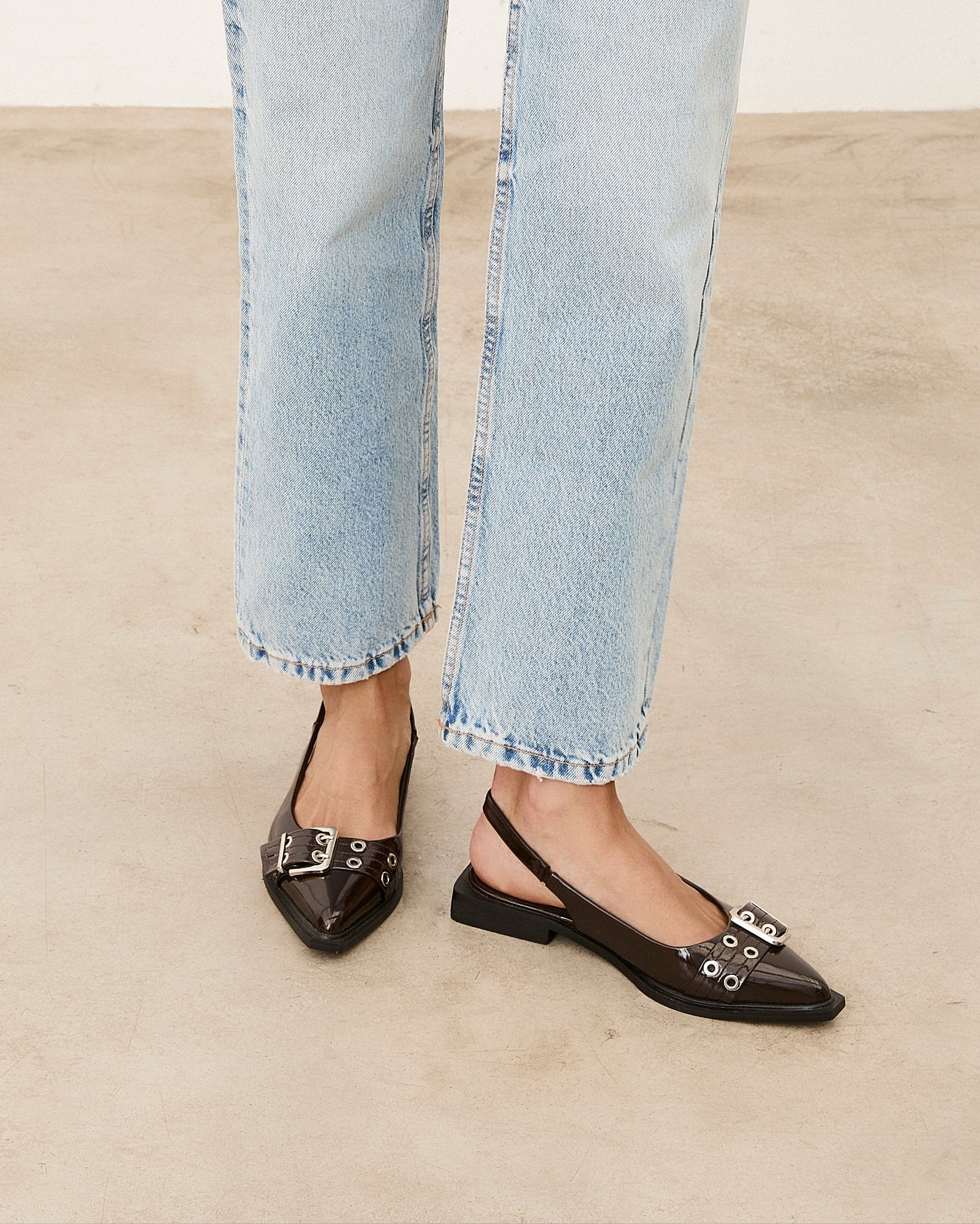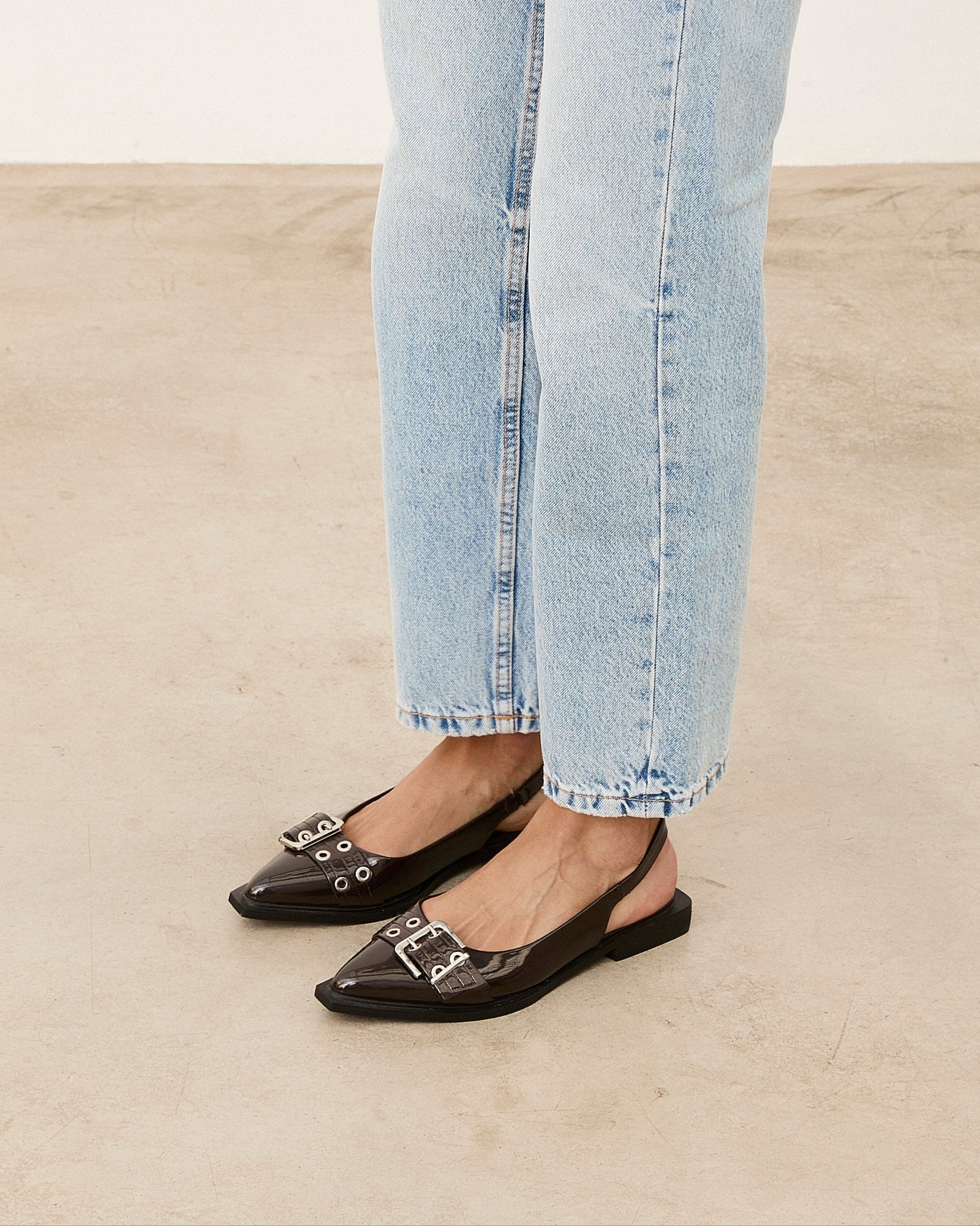 Zapato cerrado efecto charol en punta.Parte trasera destalonada en color chocolate.