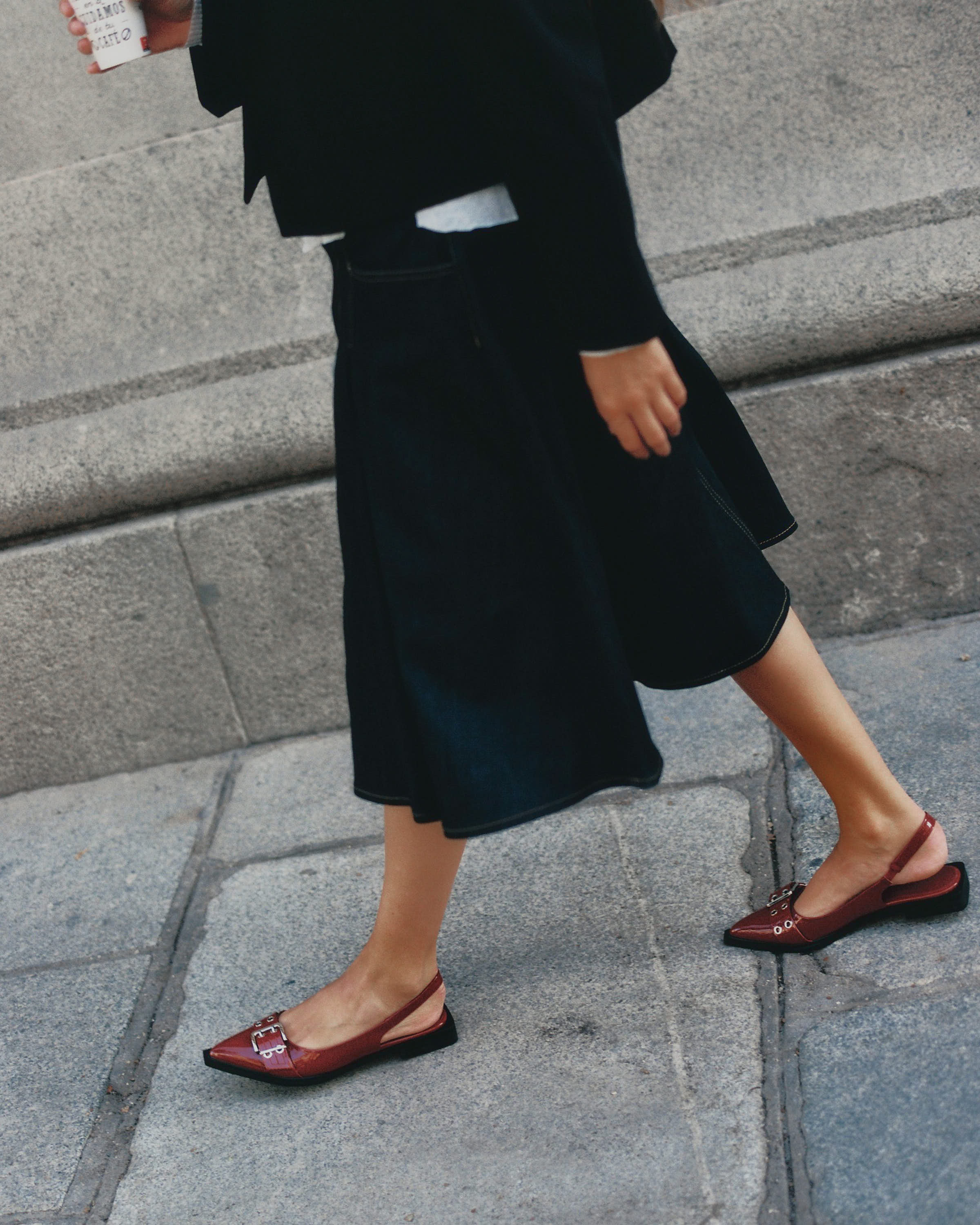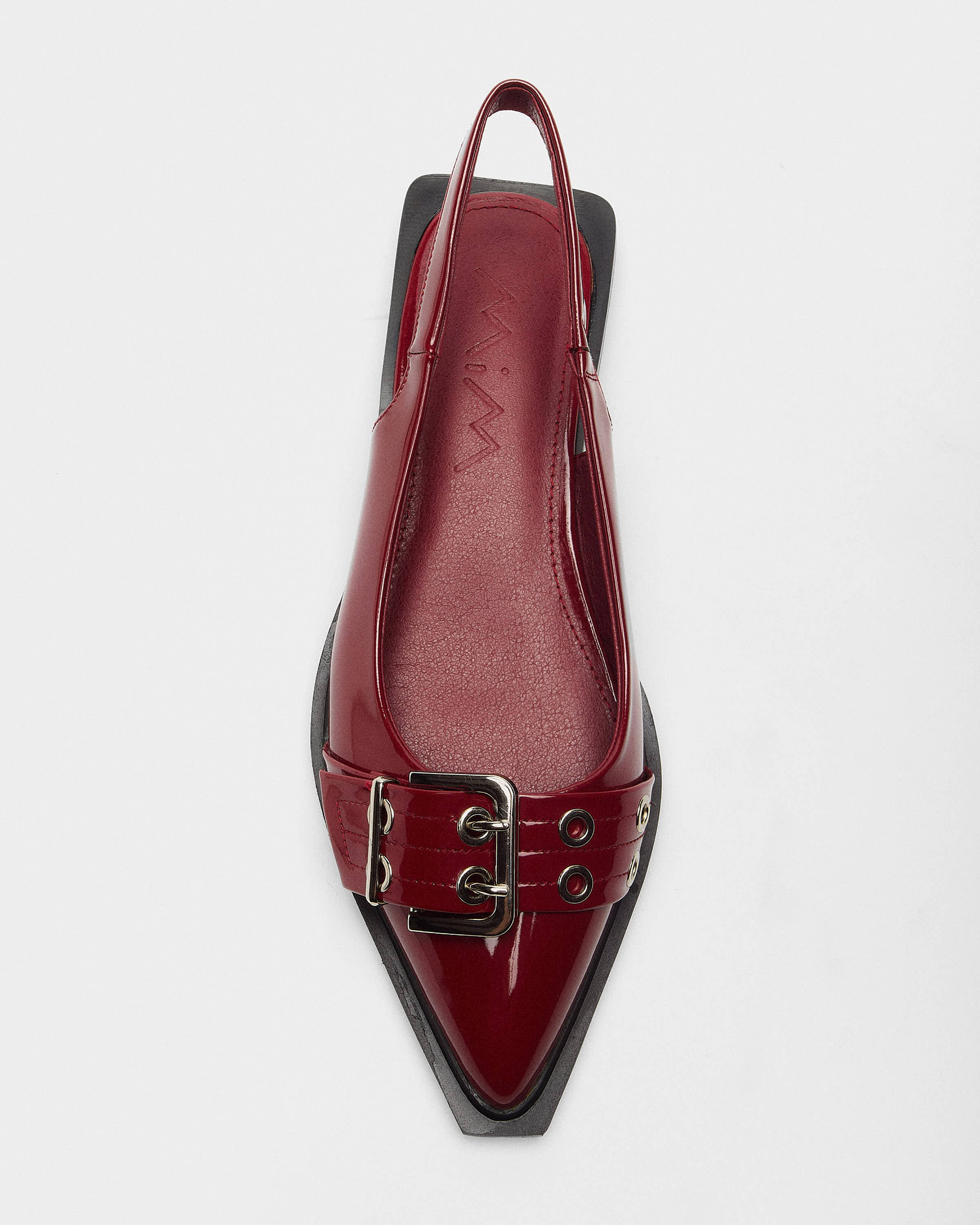 Zapato cerrado efecto charol en punta.Parte trasera destalonada en color rojo.