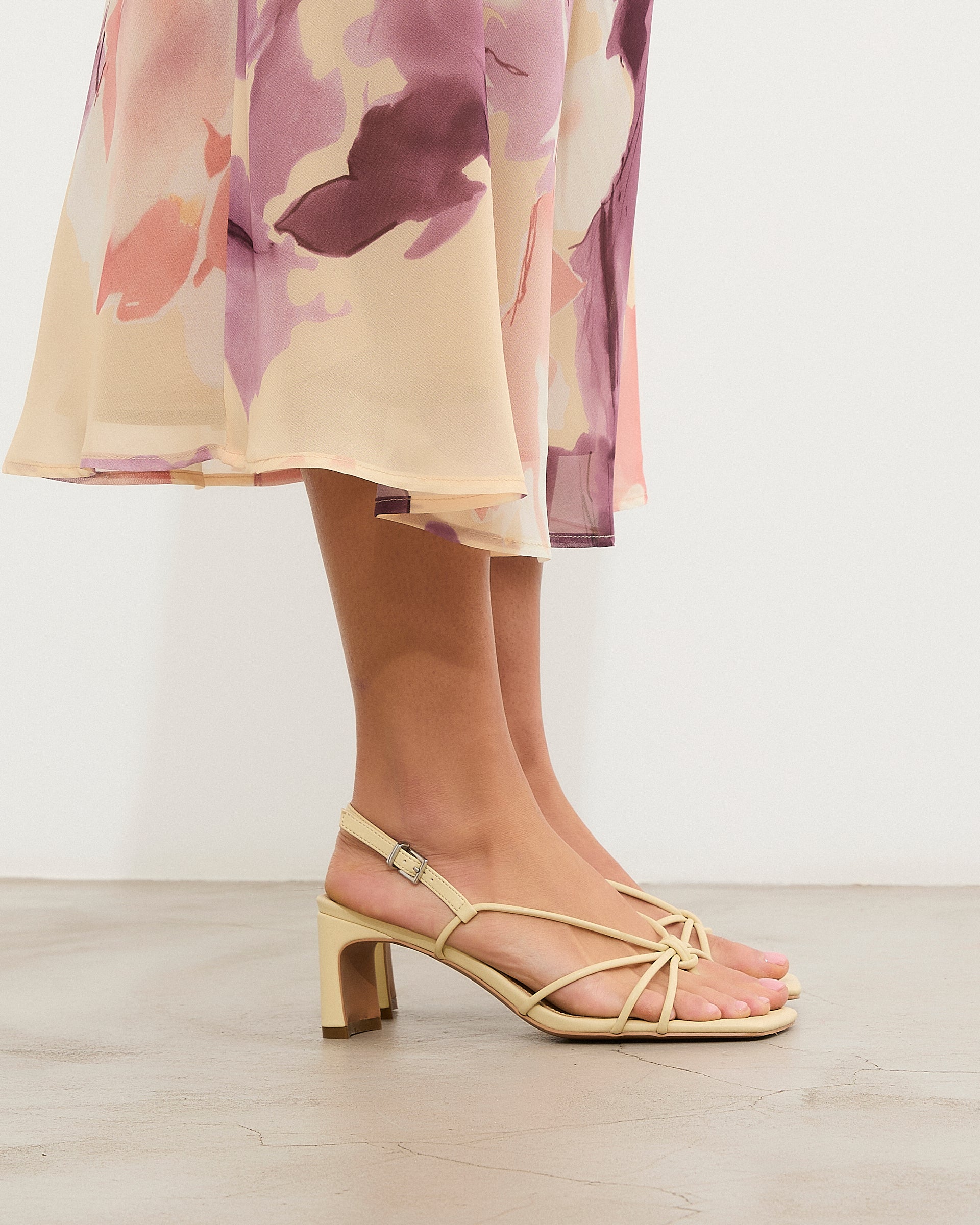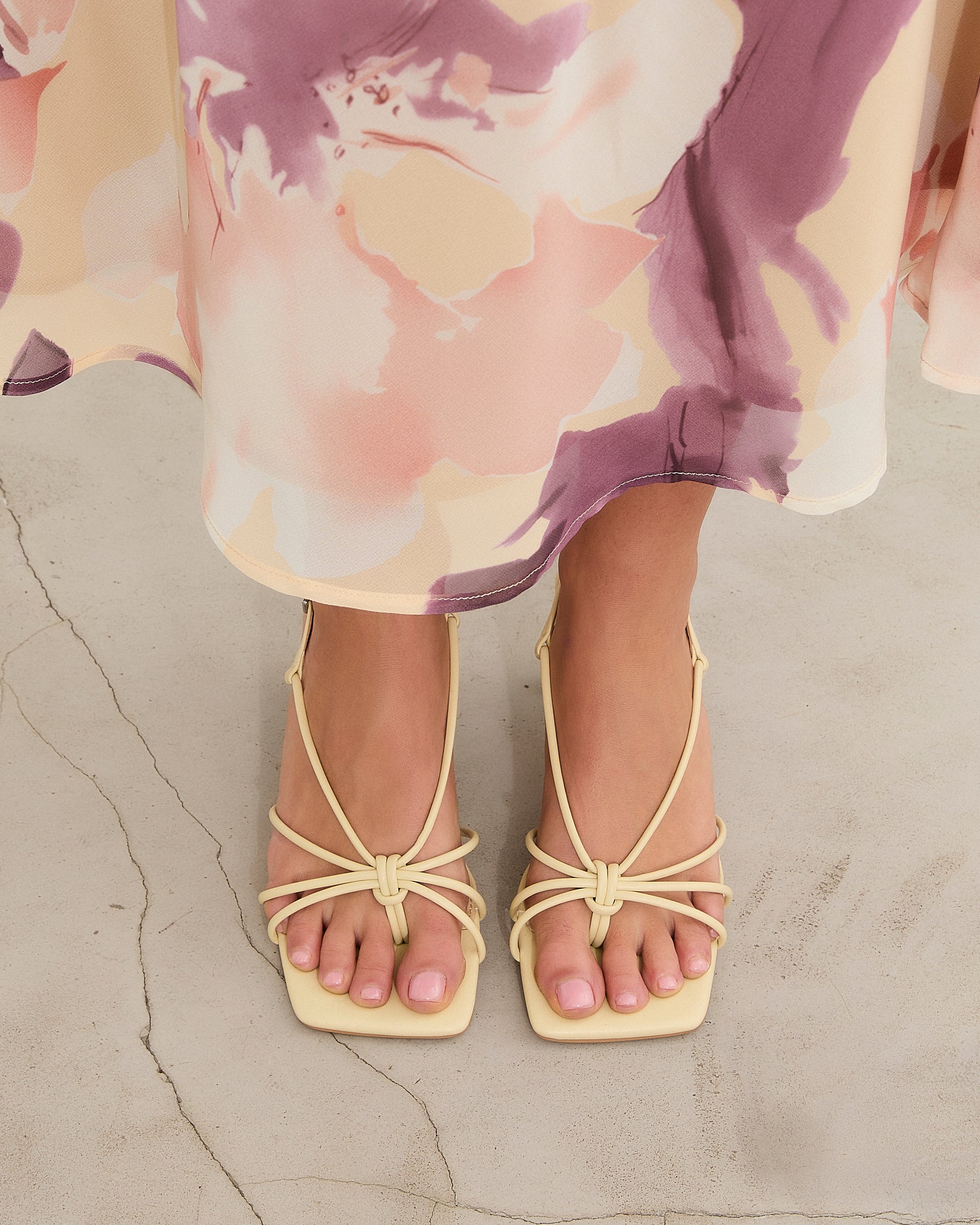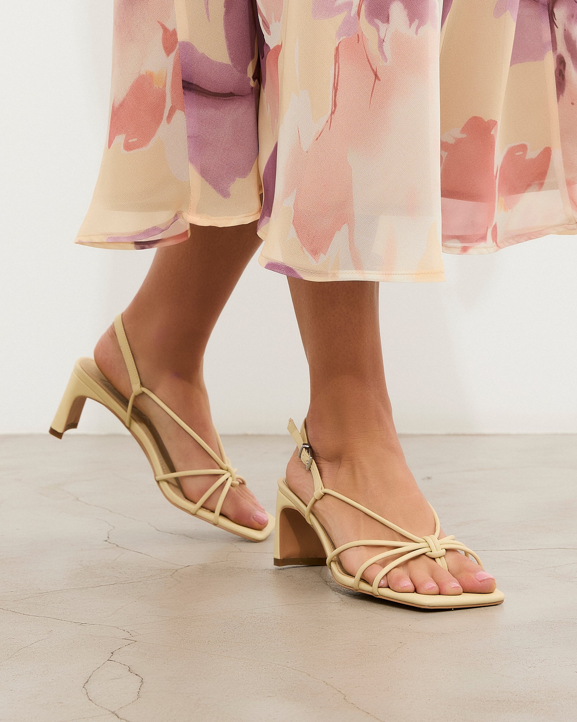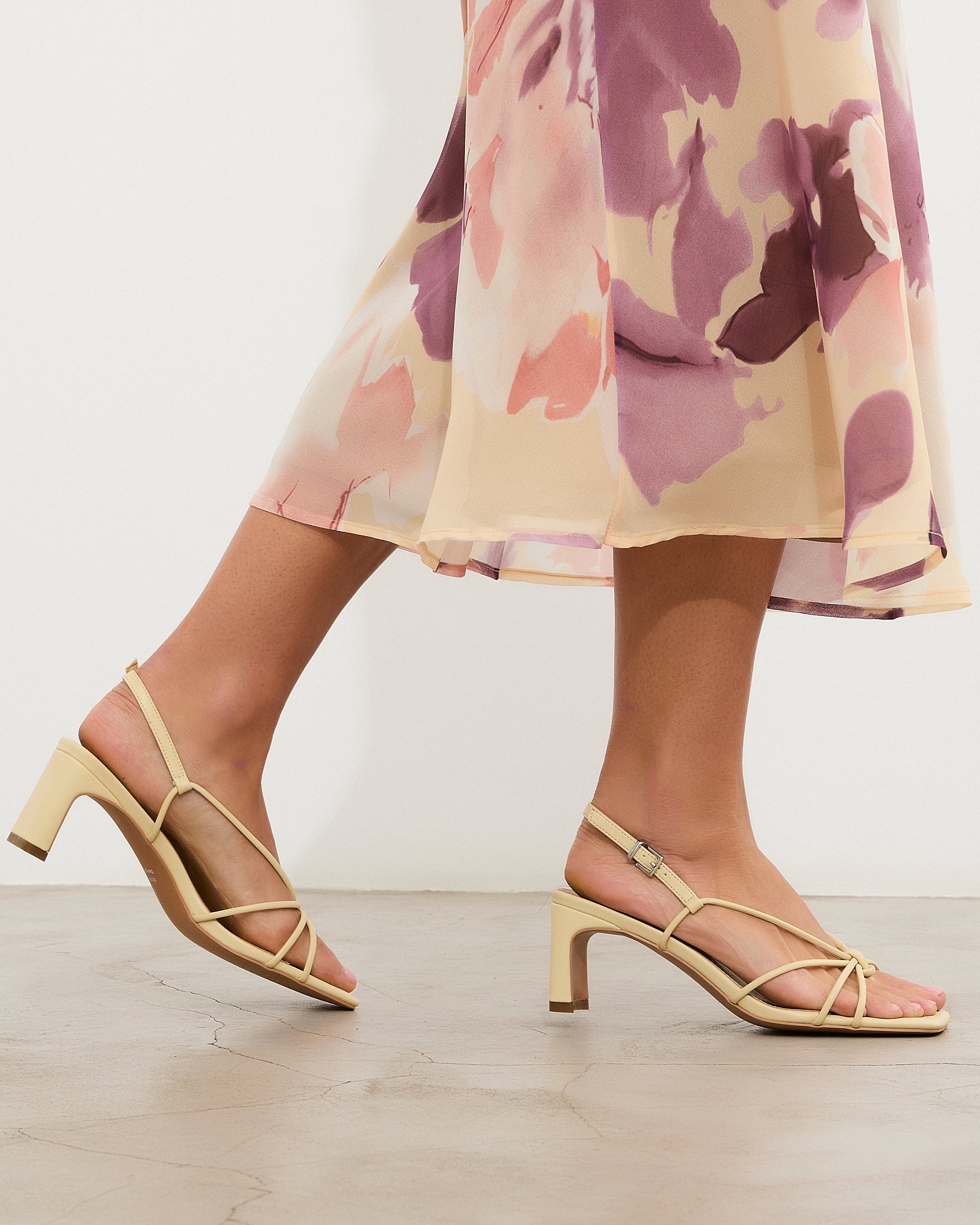 Sandalia de tacón con puntera cuadrada en color amarillo. Multiples tiras en la parte delantera unidades con sujección en dedo. Cinta tarsera para sujección en talón con hebilla. Tacón geométrico bajo.