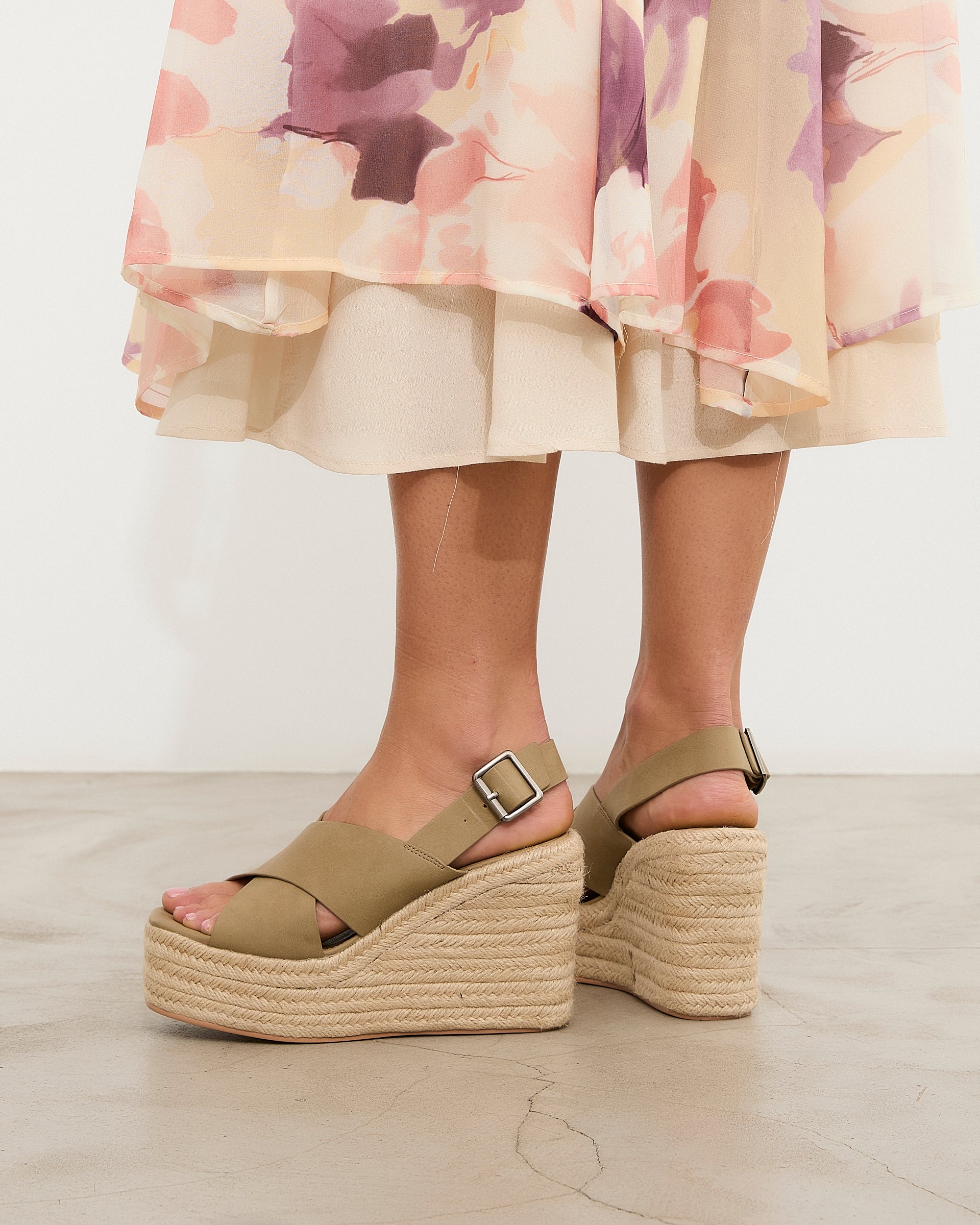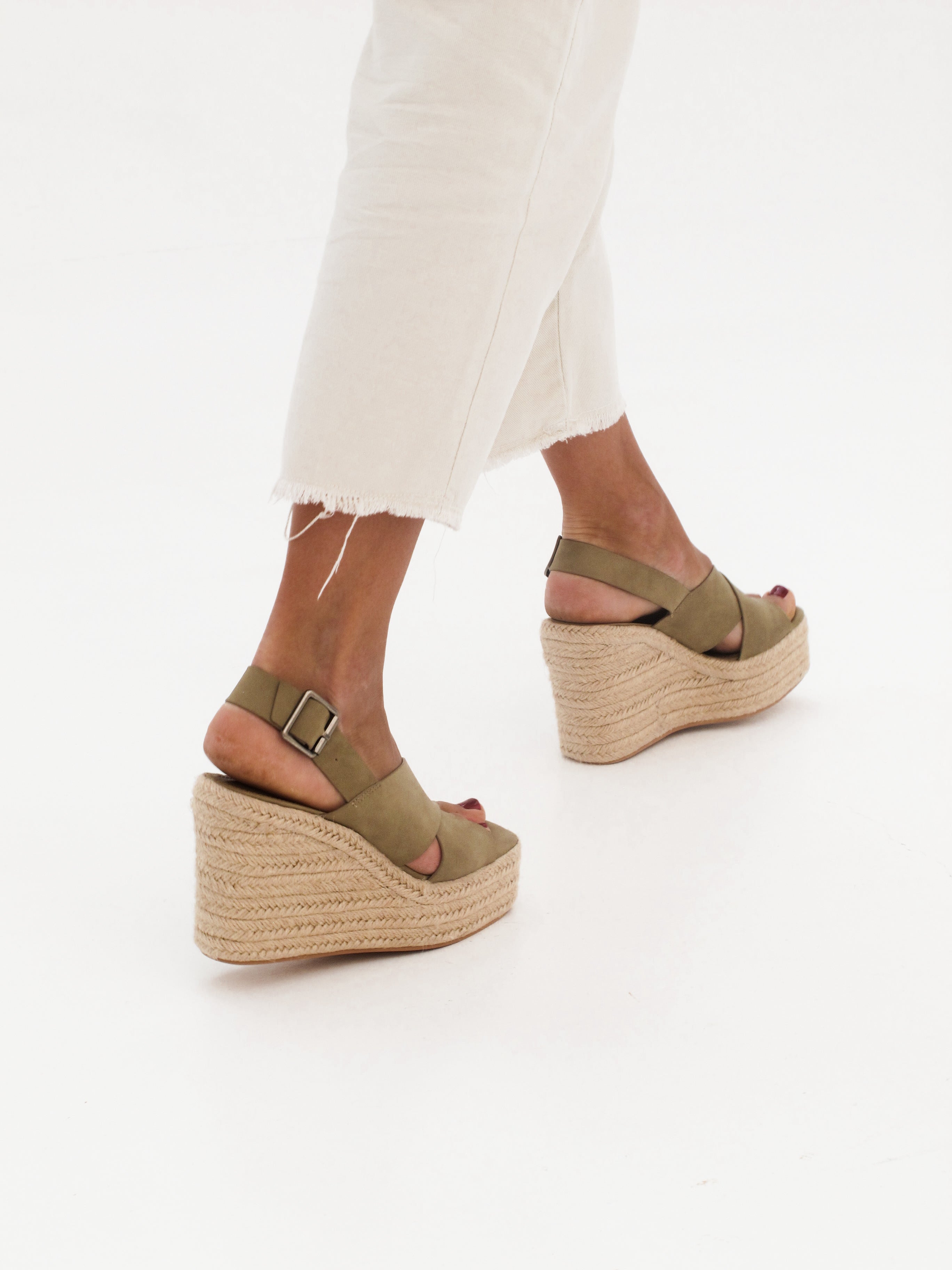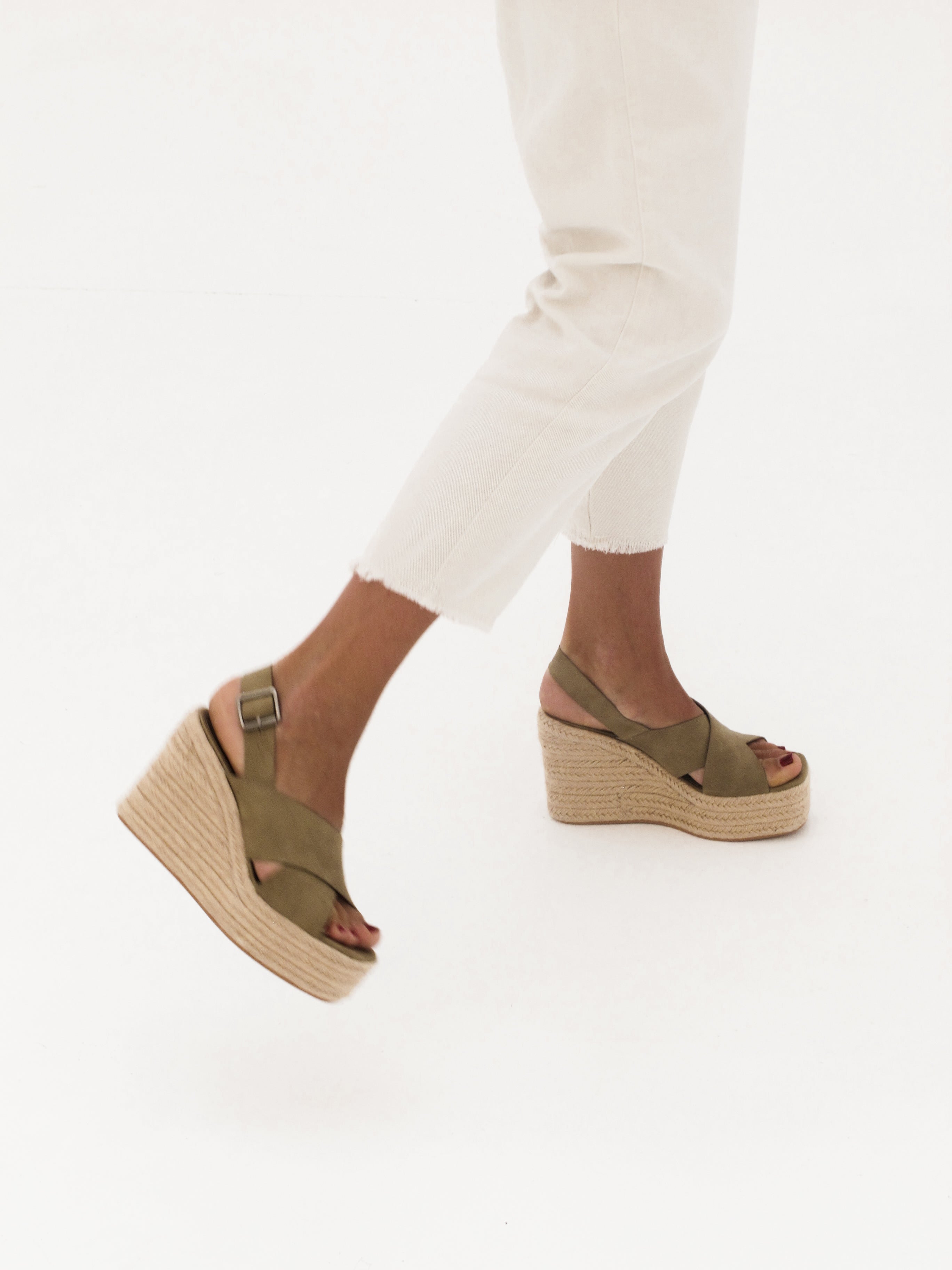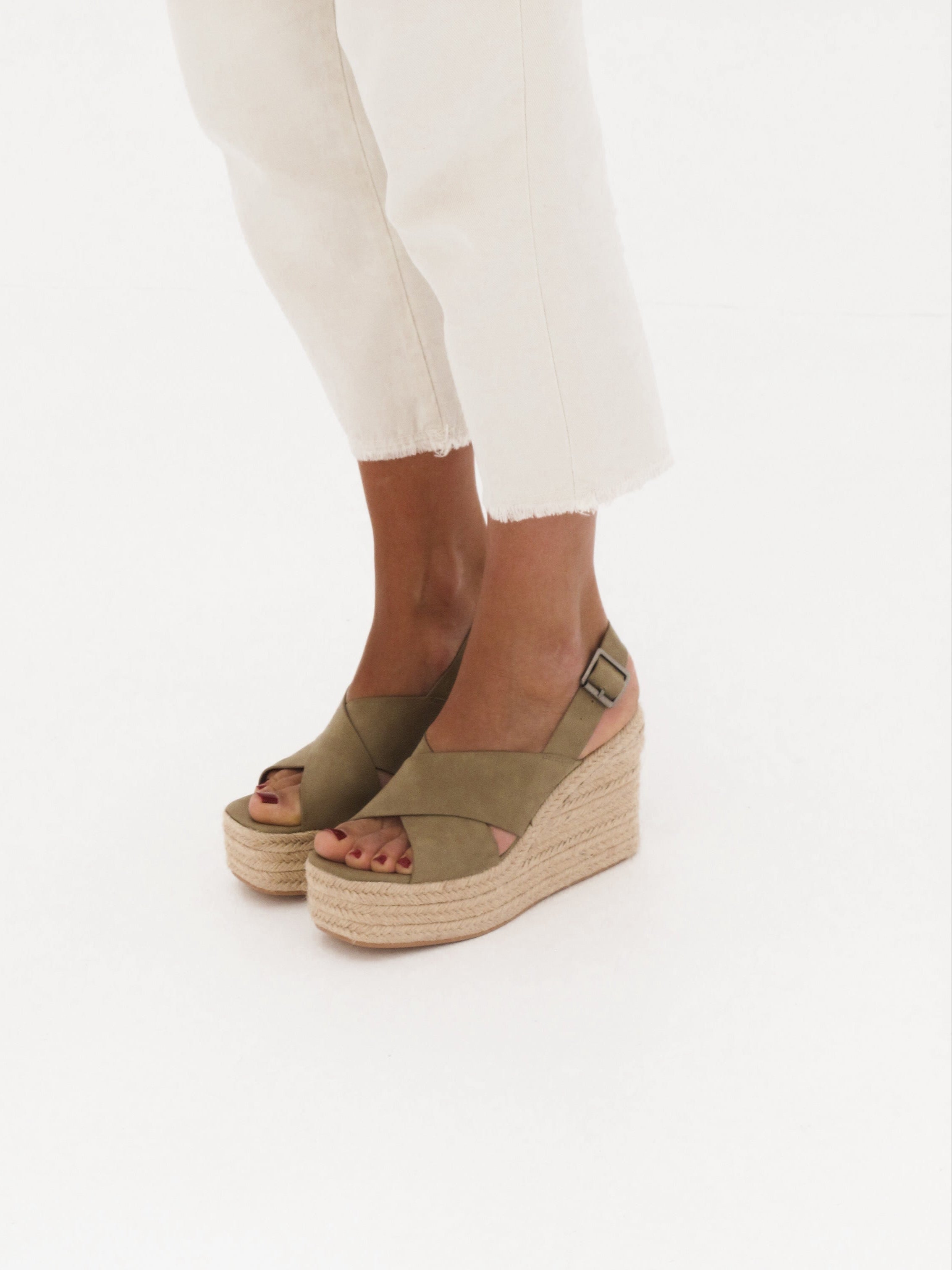 Sandalia de tacón con plataforma de esparto en color kaki. Dos tiras gruesas cruzadas en la parte delantera. Tira trasera con cierre con hebilla.