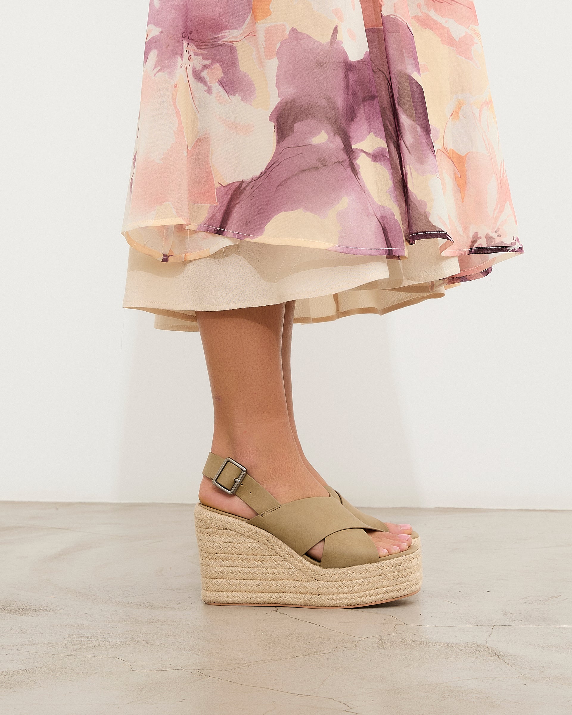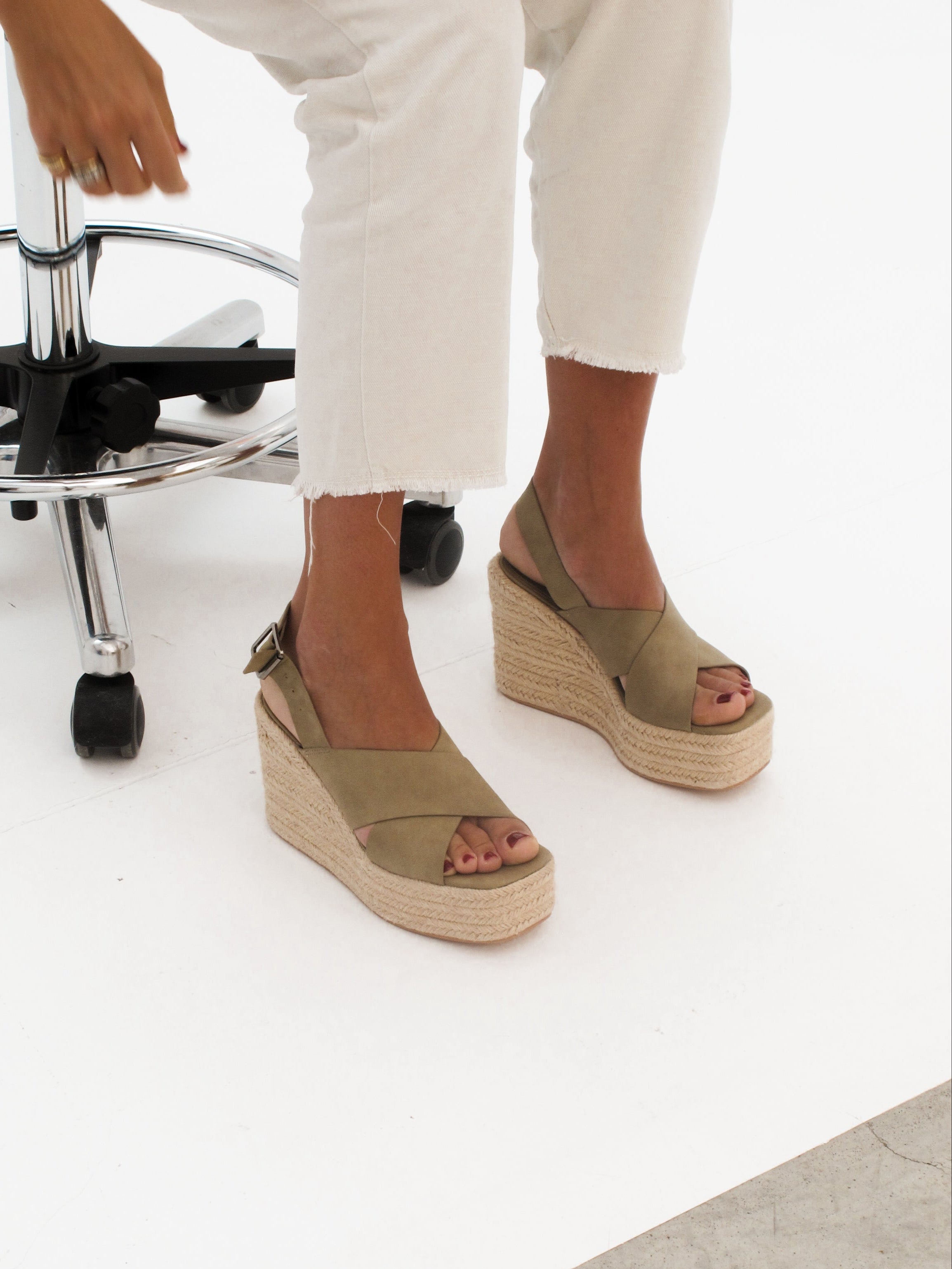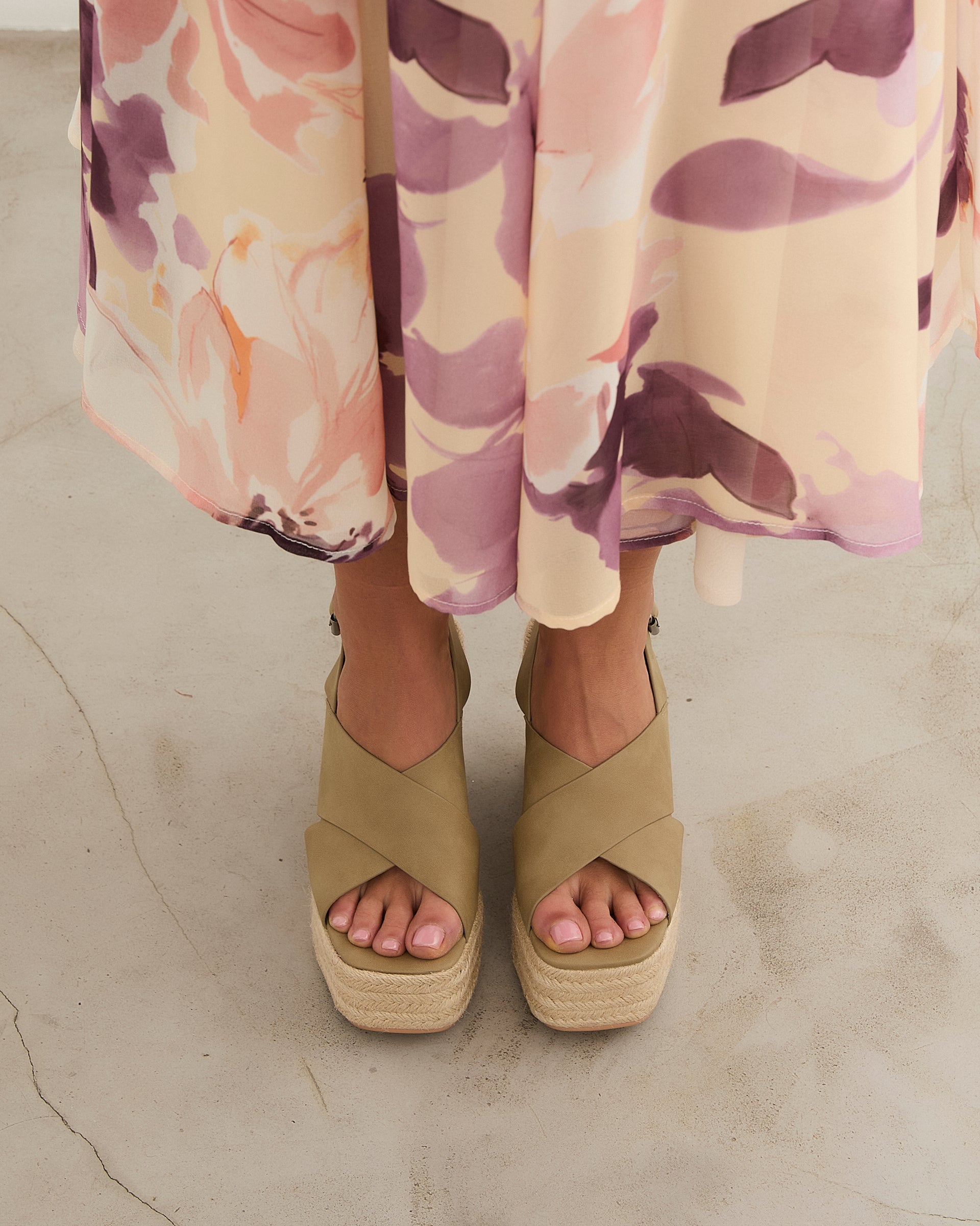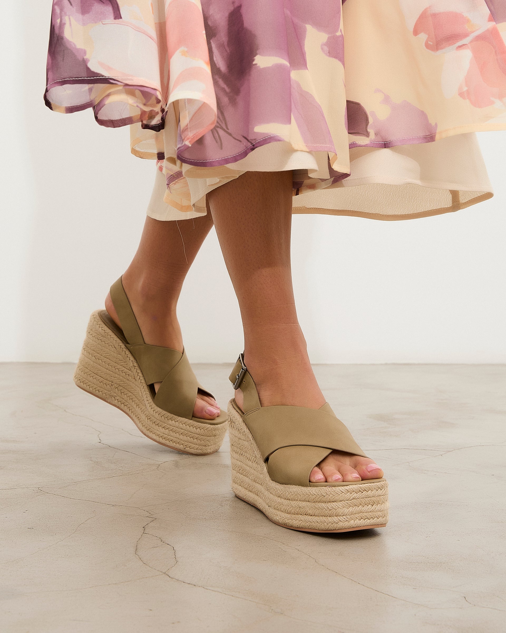 Sandalia de tacón con plataforma de esparto en color kaki. Dos tiras gruesas cruzadas en la parte delantera. Tira trasera con cierre con hebilla.