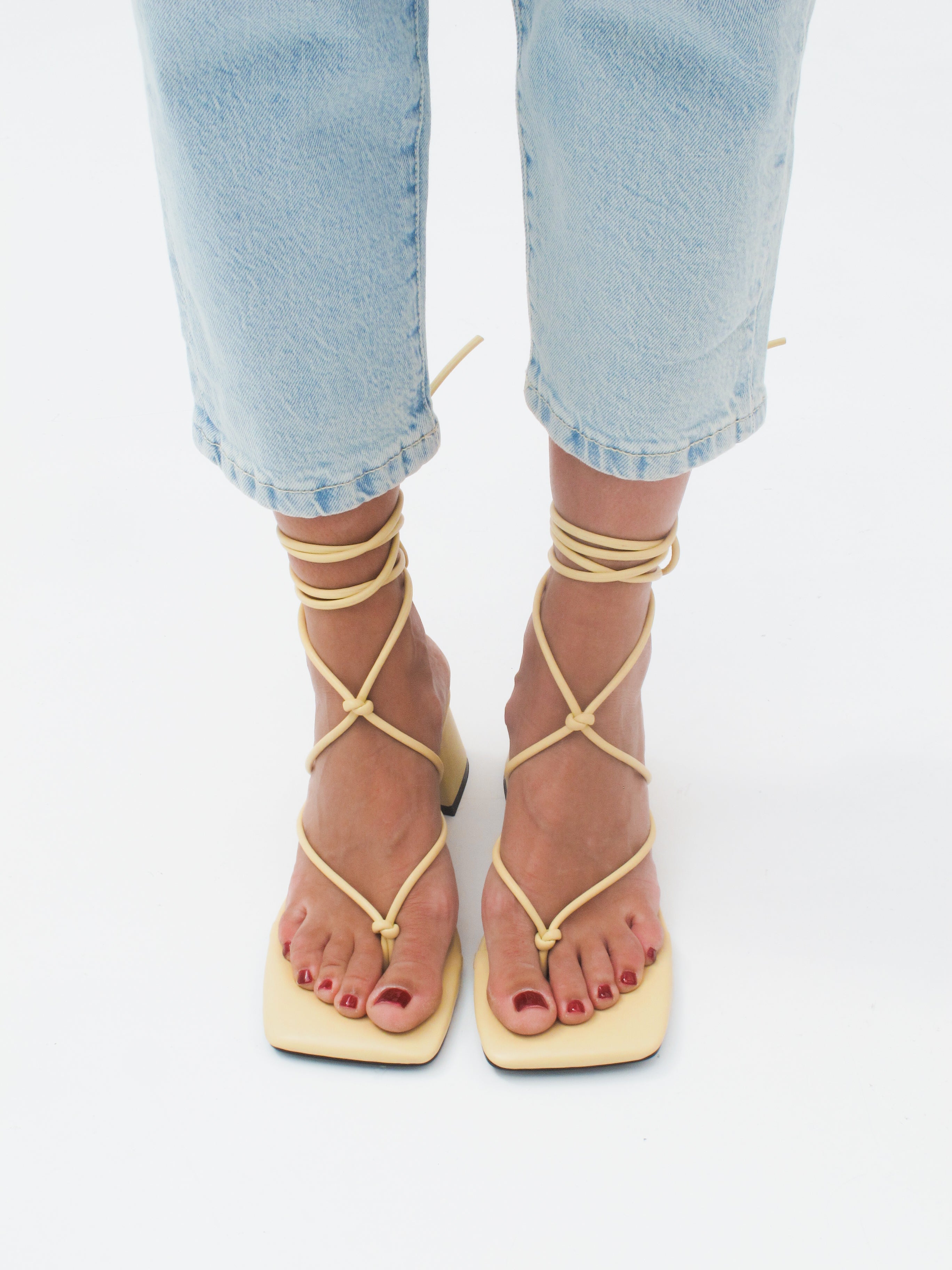 Sandalia de tacón de dedo en color amarillo. Tiras para sujección alrededor de tobilo. Tacón cuadrado.