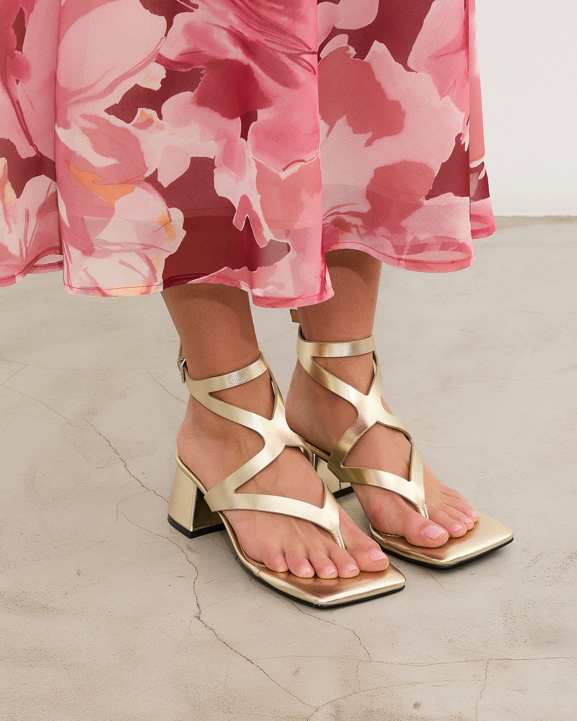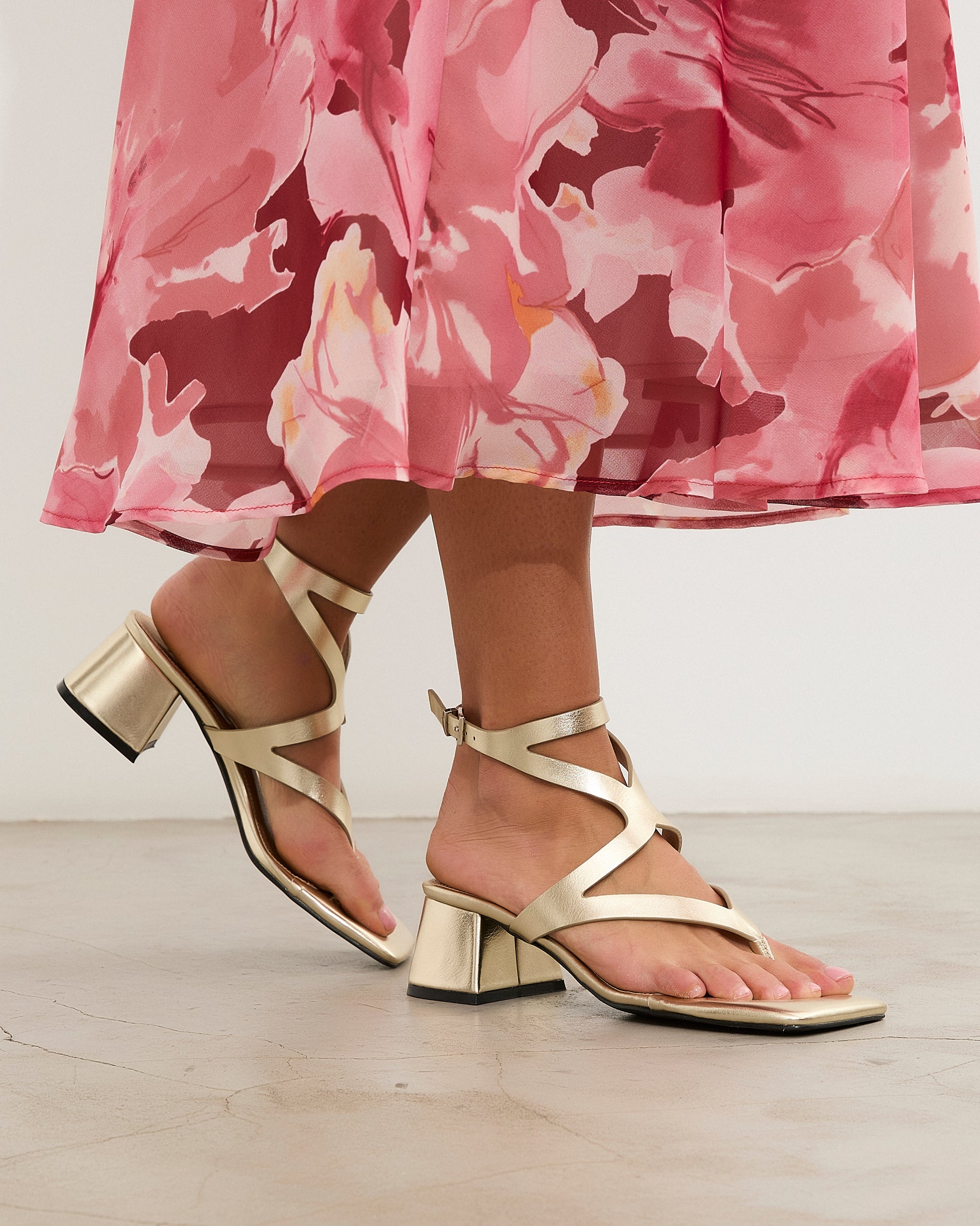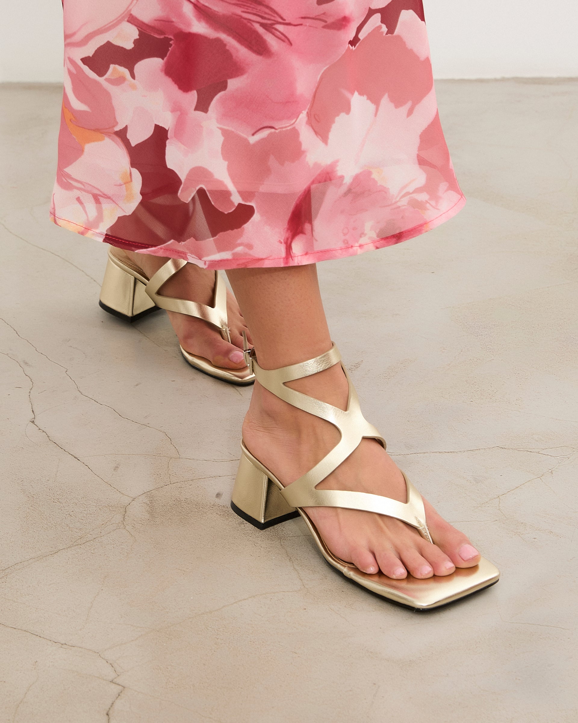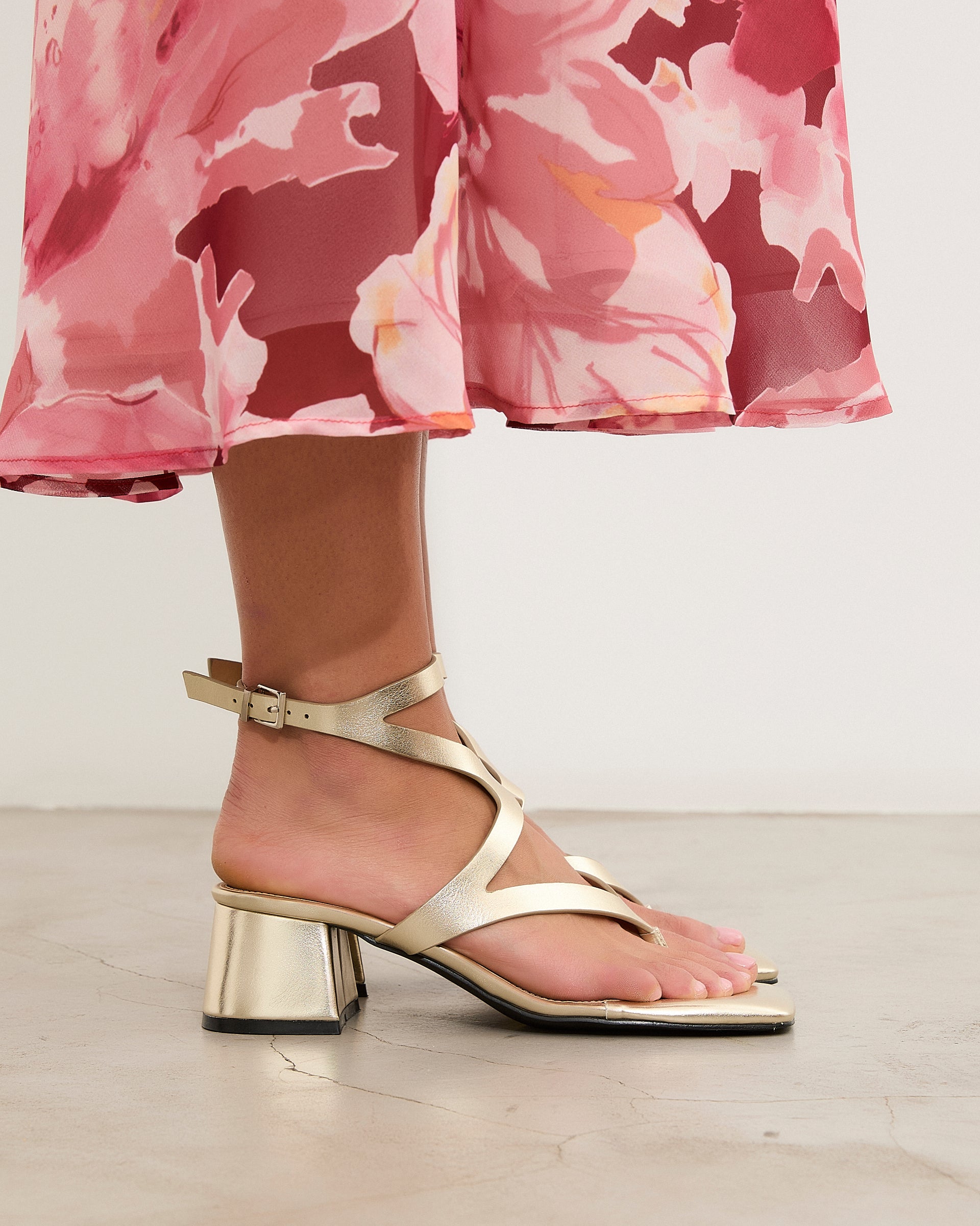 Sandalia de tacón de dedo en color dorado. Tiras planas con pulsera en tobillo para cierre con hebilla. Tacón cuadrado.