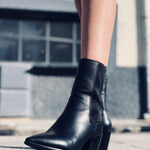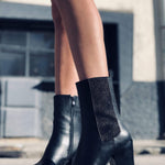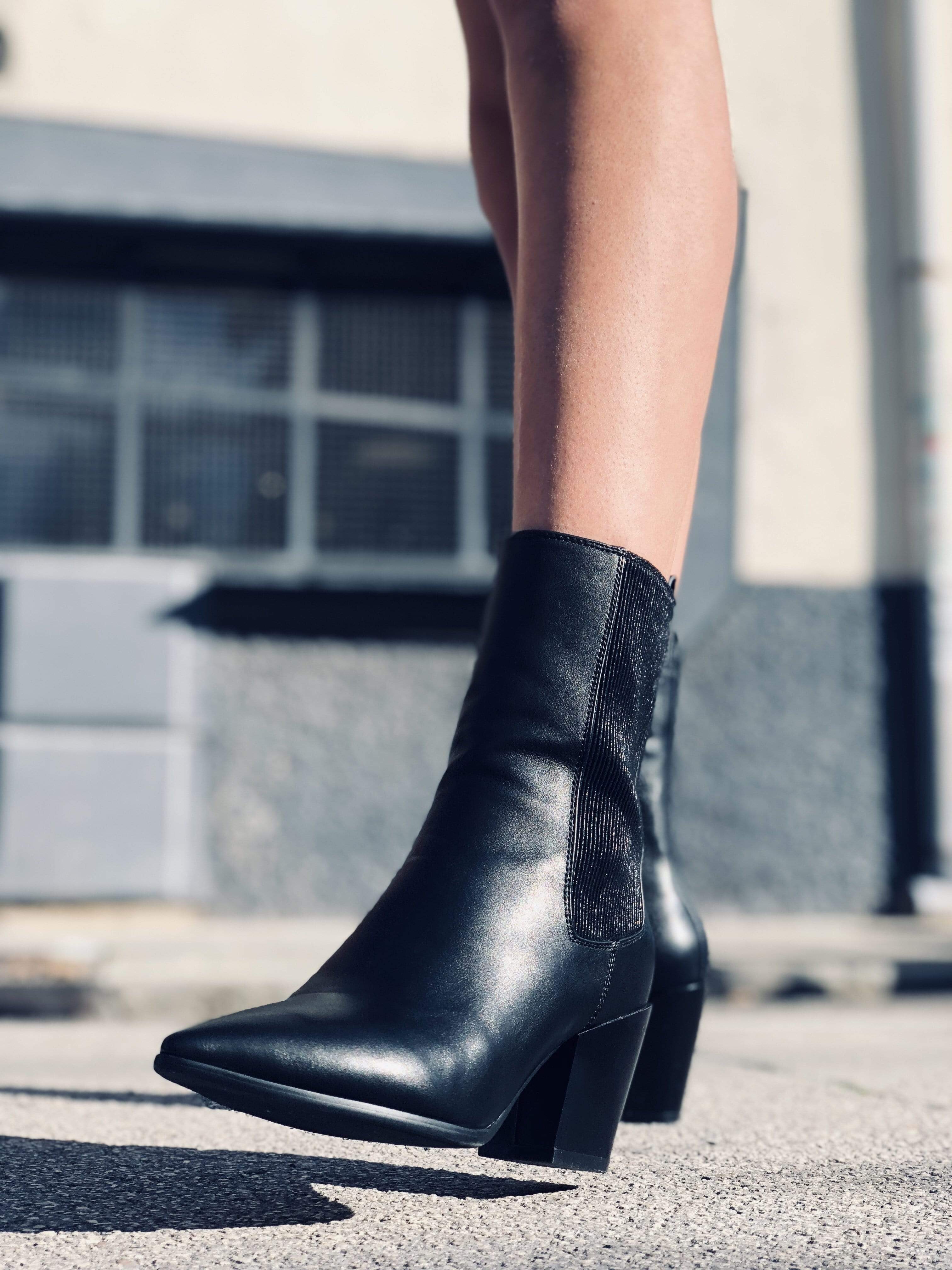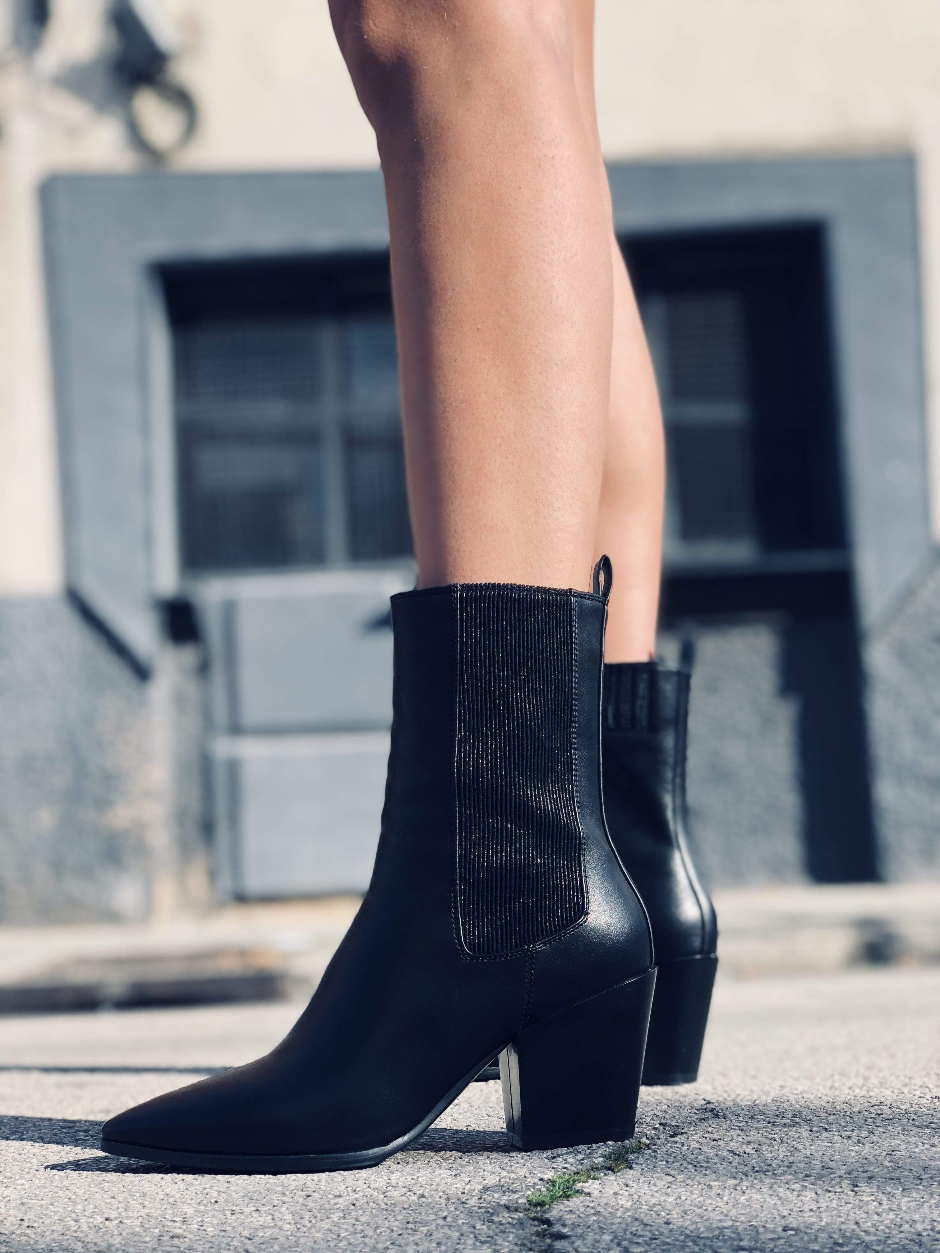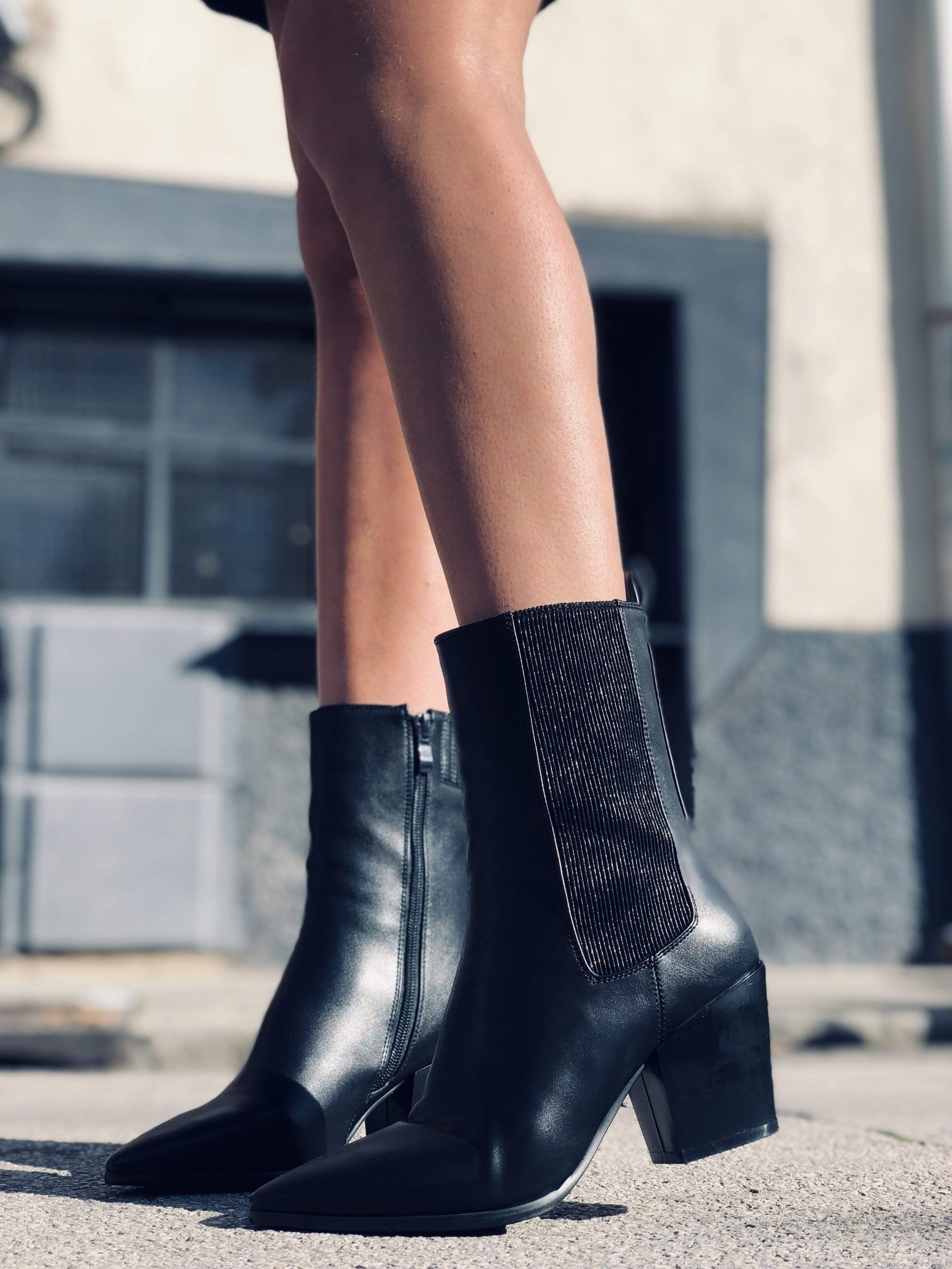 Bottine noire avec élastique sur le côté extérieur. Fermeture éclair latérale.