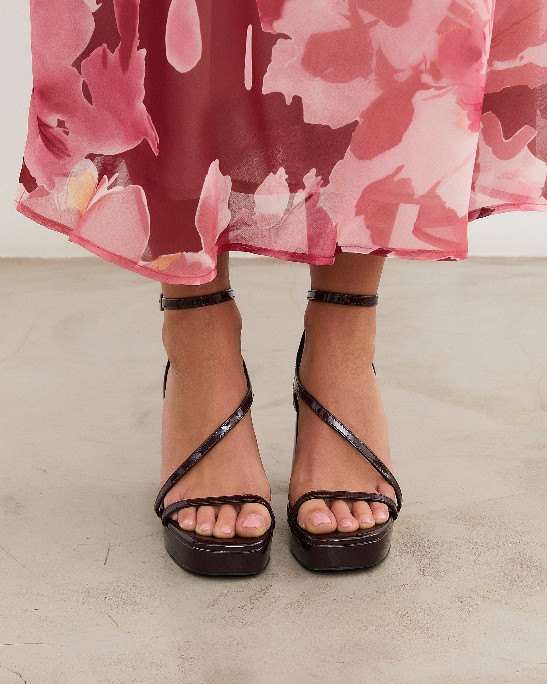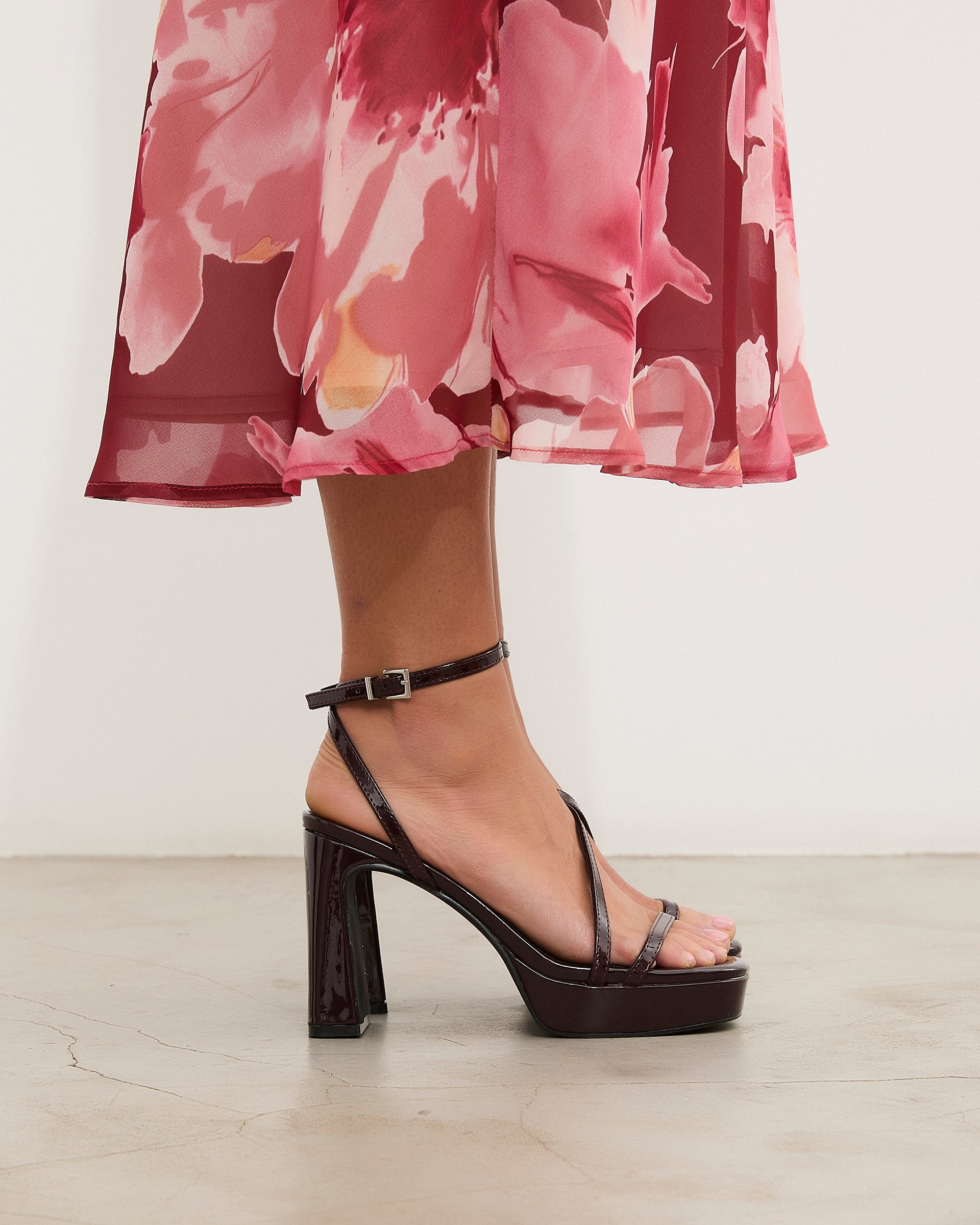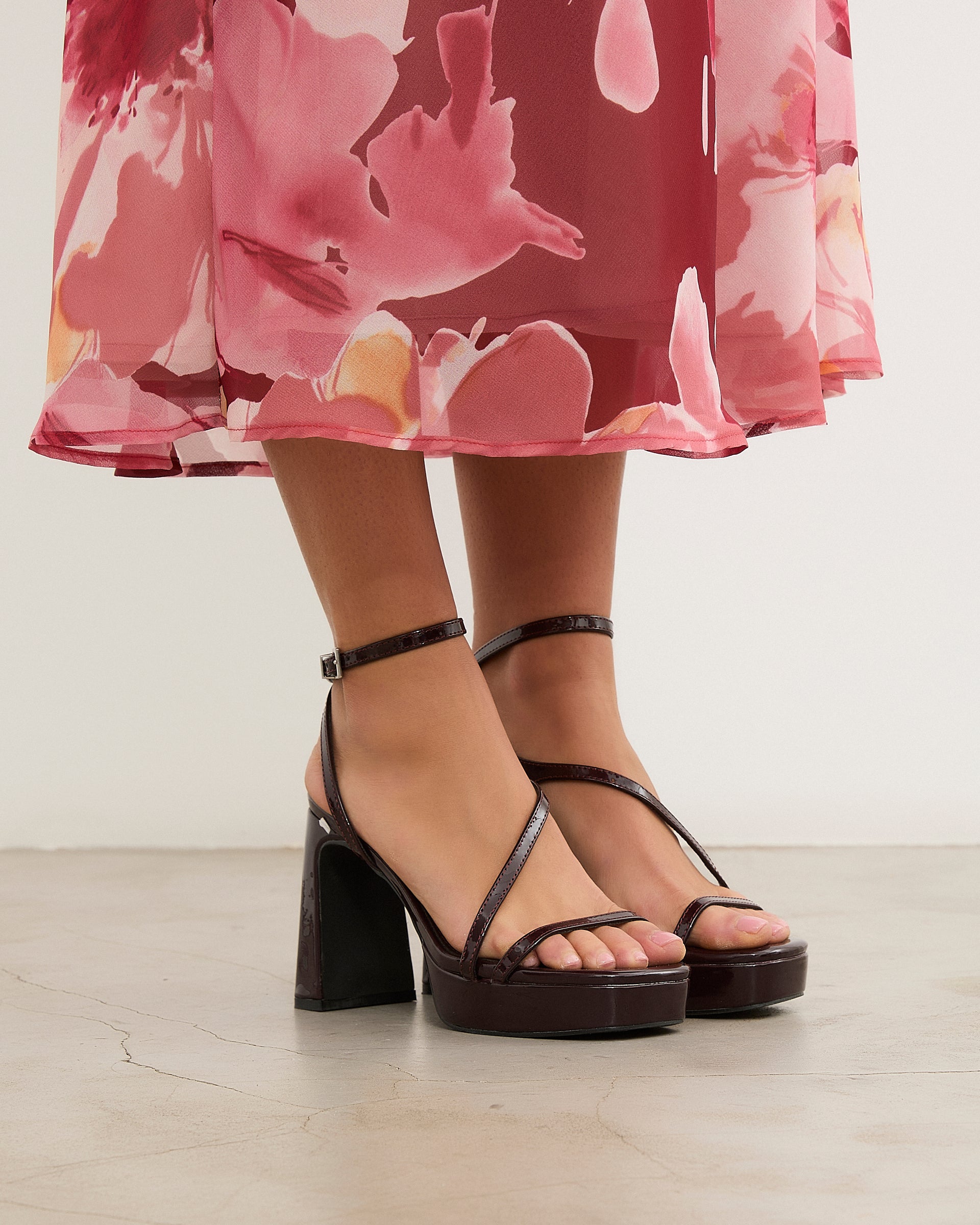 Sandalia de tacón plataforma con puntera cuadrada en color burdeos. Tira delantera y tira cruzada en empeine unida a tira trasera para sujección en talón. Tacón cuadrado ancho.