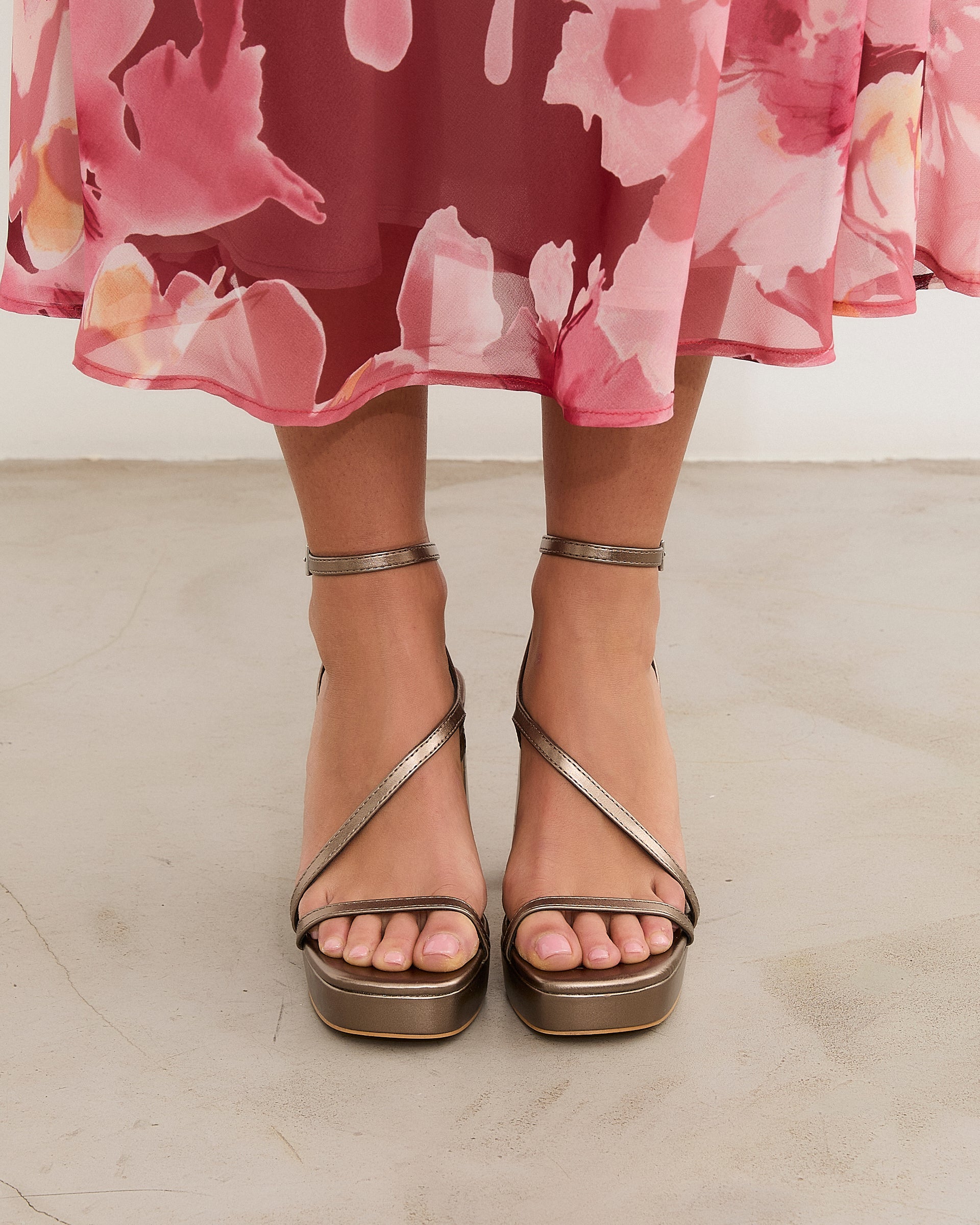 Sandalia de tacón plataforma con puntera cuadrada en color metalizado. Tira delantera y tira cruzada en empeine unida a tira trasera para sujección en talón. Tacón cuadrado ancho.