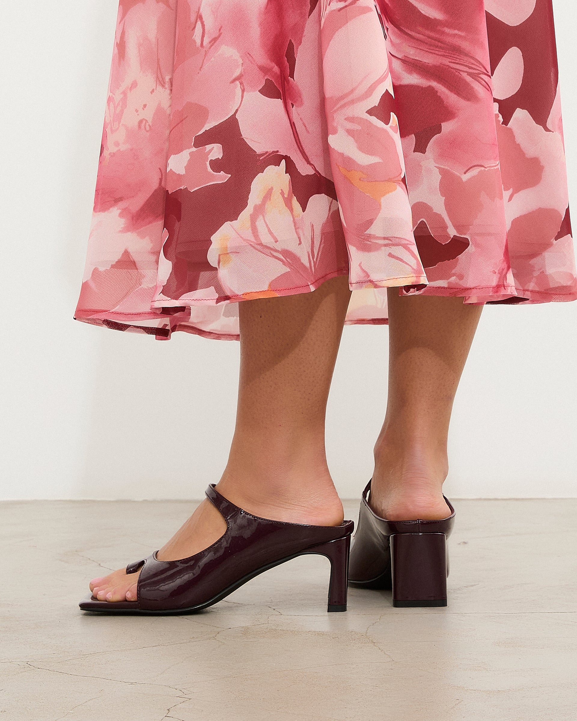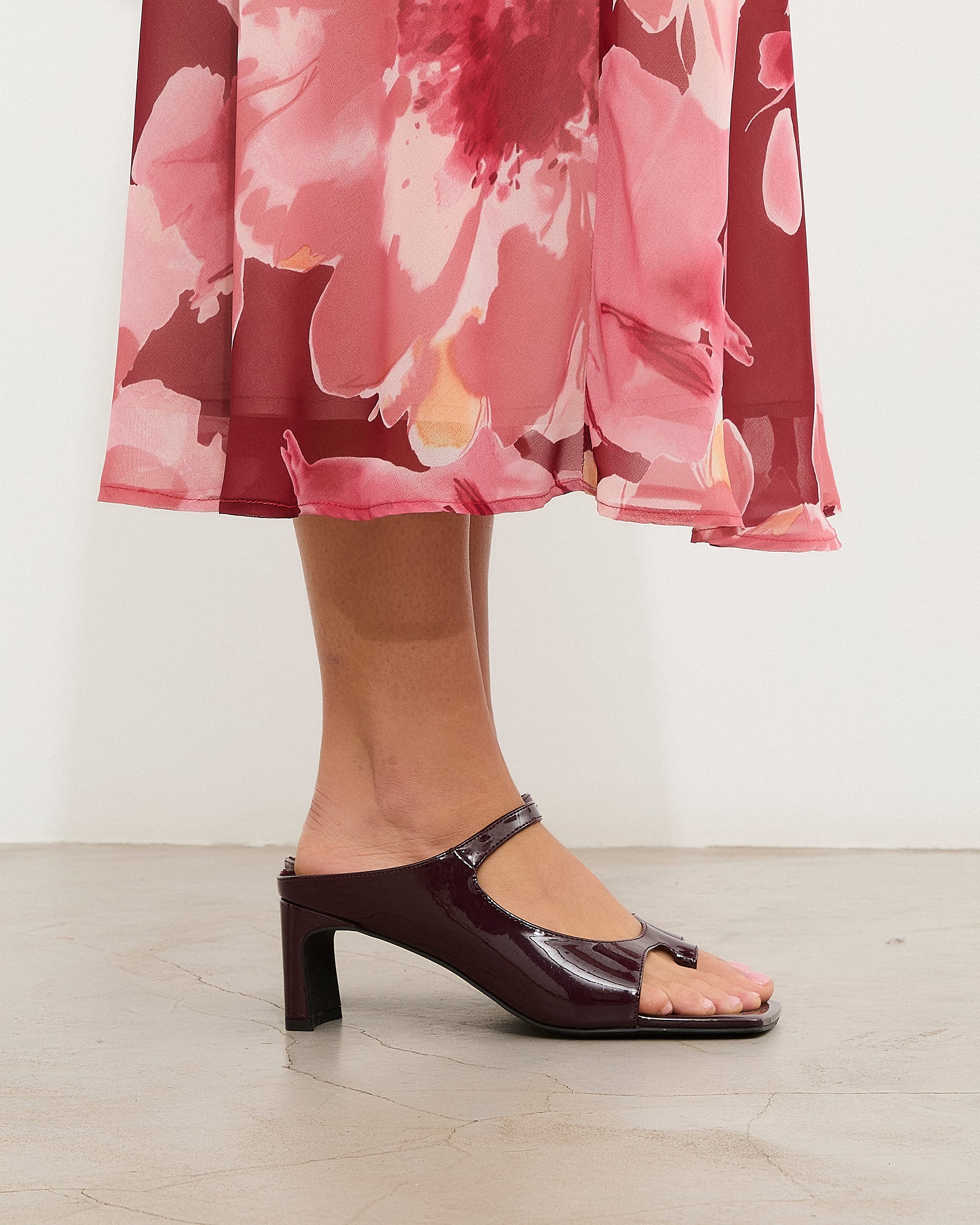 Sandalia de tacón tipo mule con puntera cuadrada en color burdeos. Parte delantera envolvente con sujeccion en pulgar y tira en empeine. Tacón cuadrado bajo.