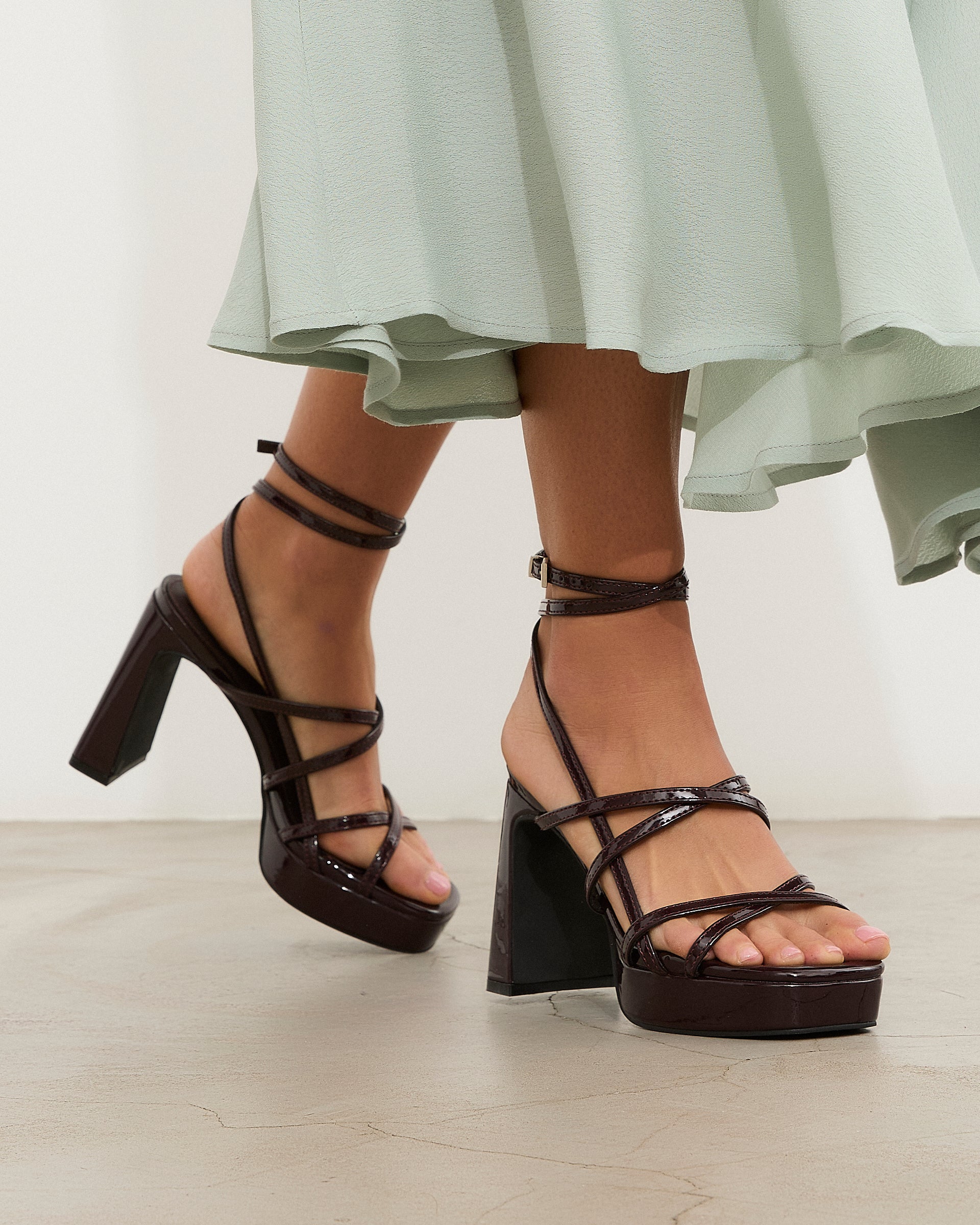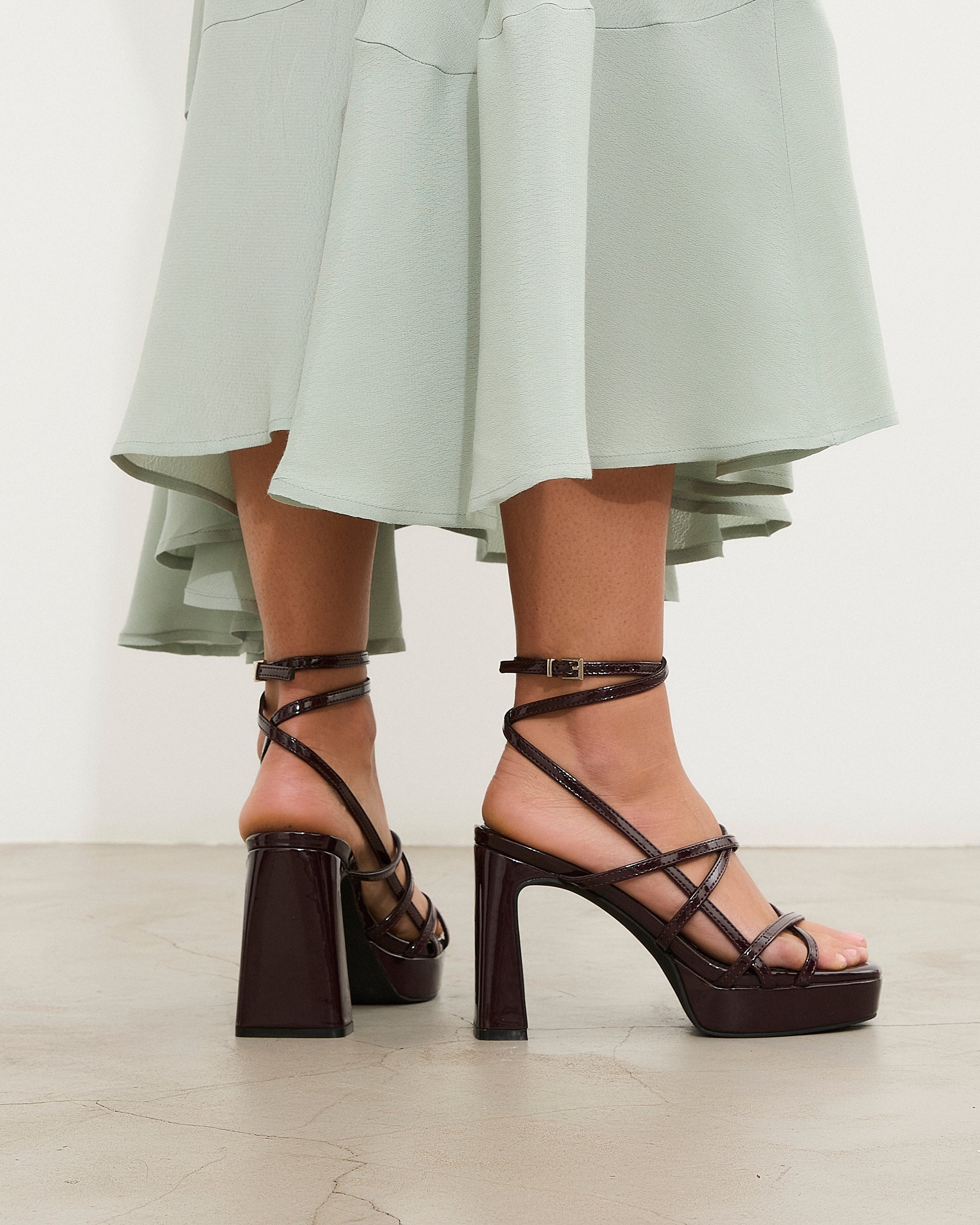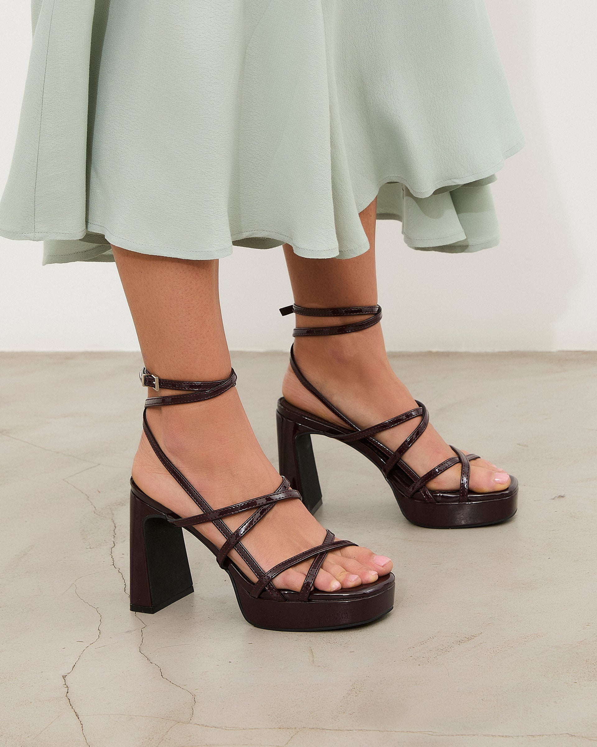 Sandalia de tacón y plataforma color burdeos. Parte delantera abierta con tiras y tacón rectangular. Cierre de pulsera al tobillo con hebilla metálica.