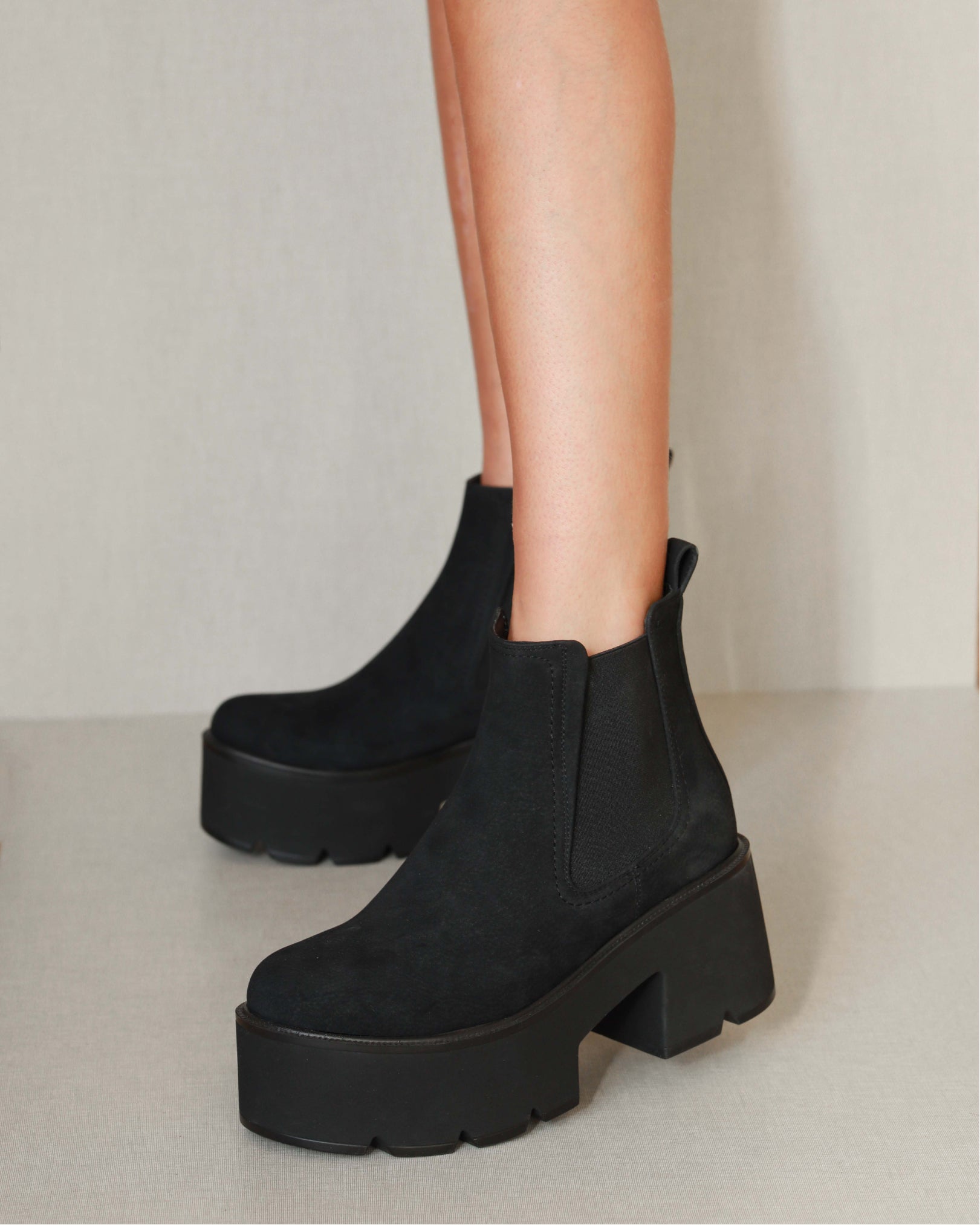 Bottine à plateforme en daim vegan noir. Élastiques latéraux pour plus de confort.